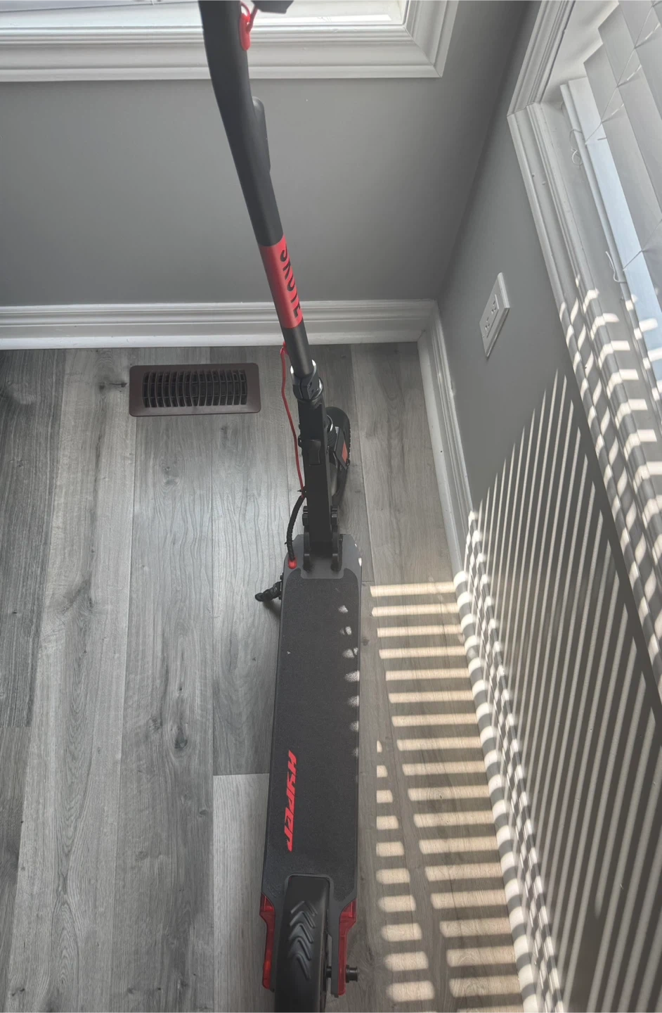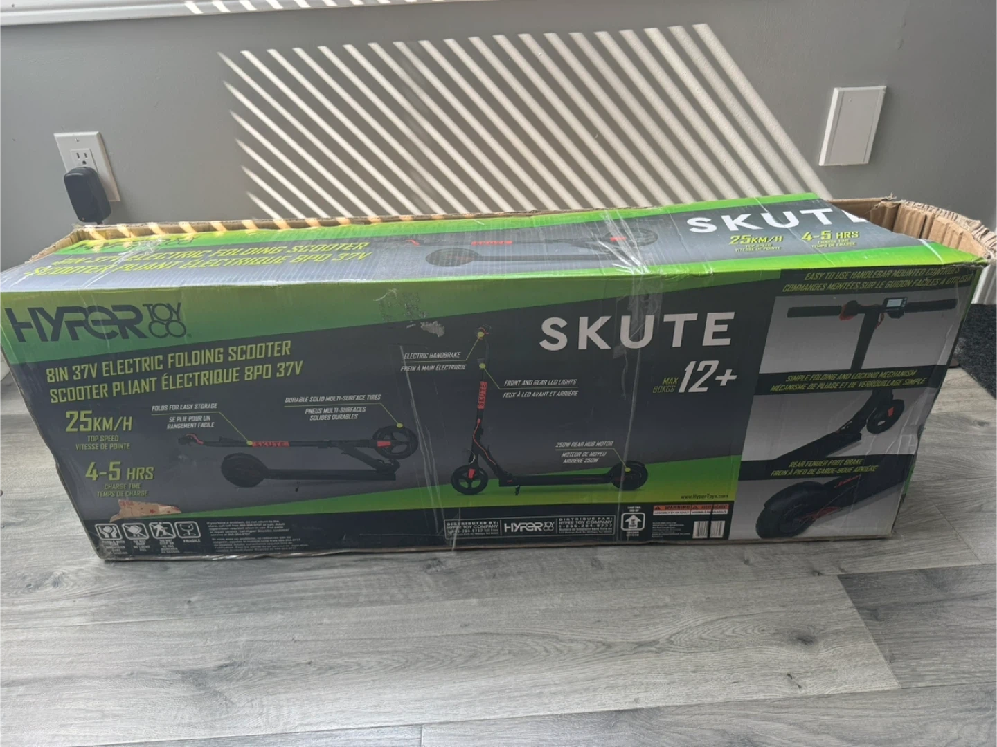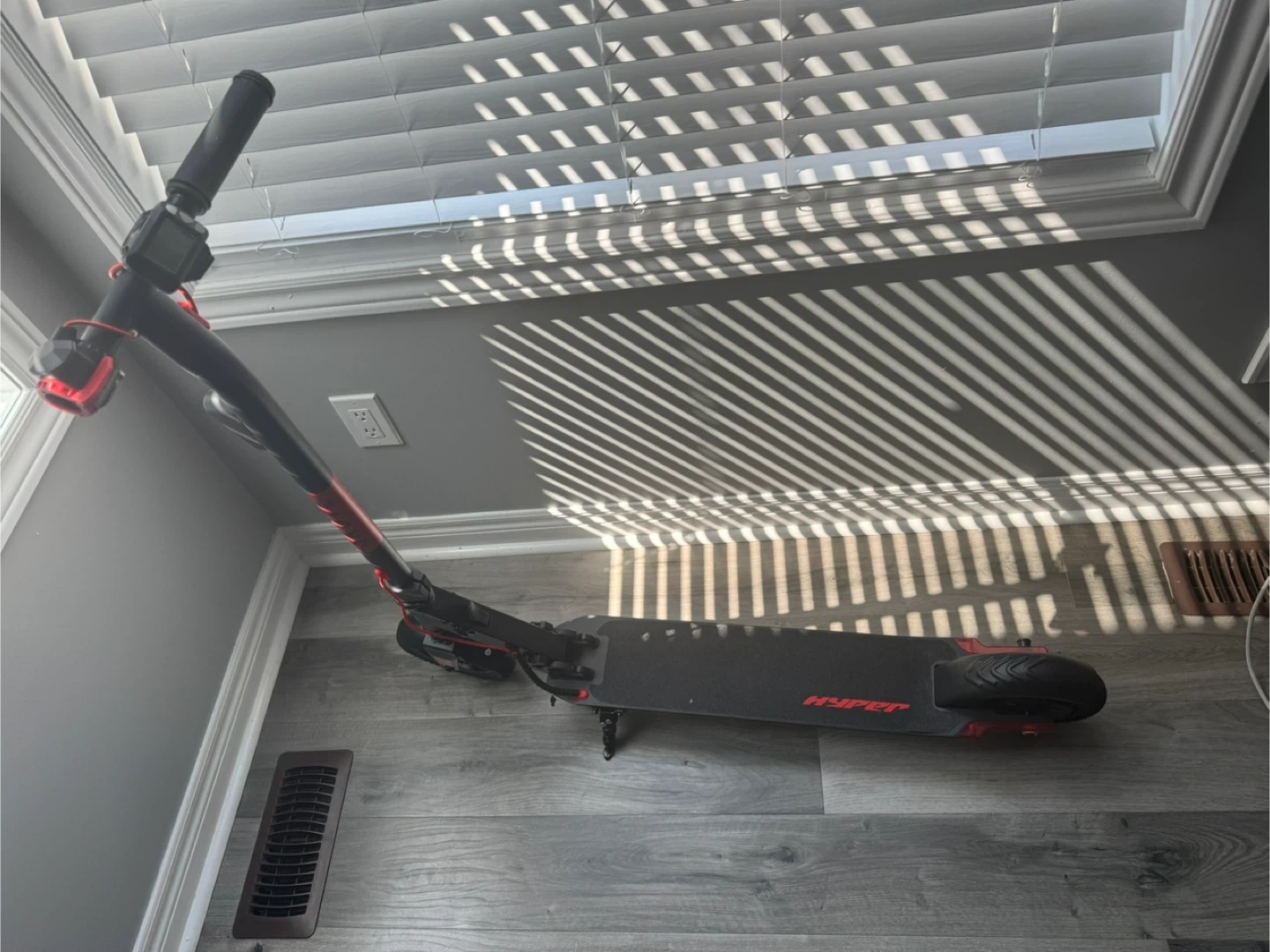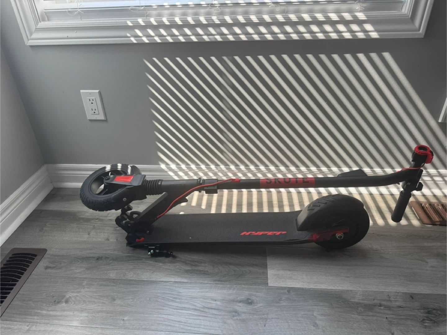 Broken handle, don’t know why it won’t run. Could be an easy fix or use for parts Selling a HyperToy Skute electric folding scooter. It's a 37V model. It features: - Electric membrane - Front & rear LED lights - 25km/h - 4-5 hours of ride time - Simple folding and locking mechanism Suitable for ages 12+