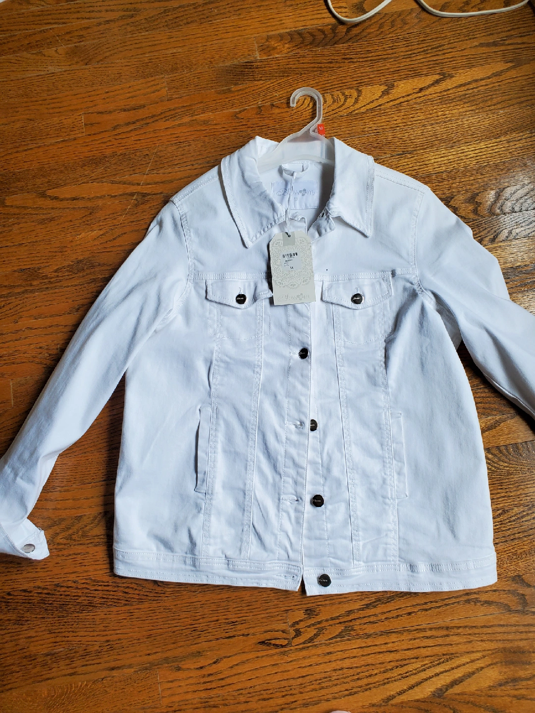 Selling a white denim jacket in size 1X . It's new and ready for a new home! Perfect for layering or wearing on its own during warmer weather. The material is durable and comfortable. It features classic denim jacket styling with button closures and pockets