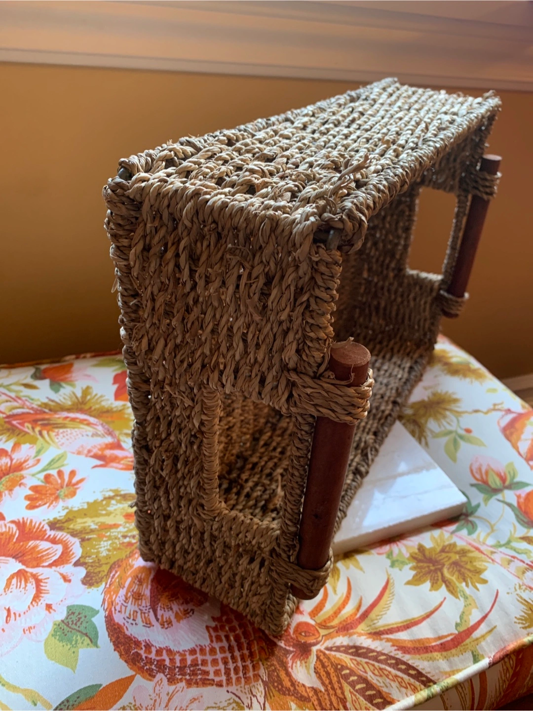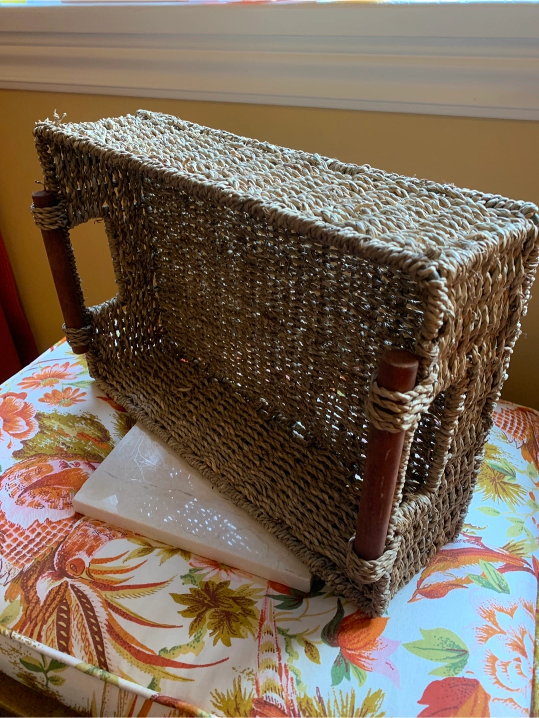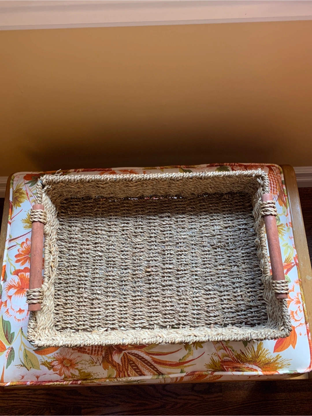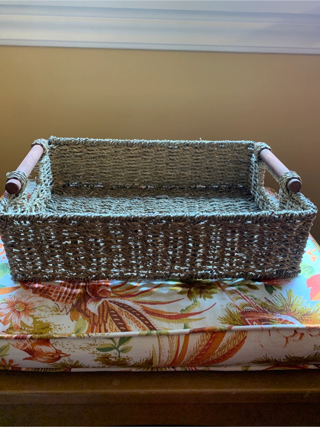 Here's a lovely woven seagrass storage basket with wooden handles! It's in great shape and perfect for organizing items around the house. It has a built in metal framework for extra durability. The natural texture adds a warm, organic touch to any room. 15” long and 10” wide Cash only please.