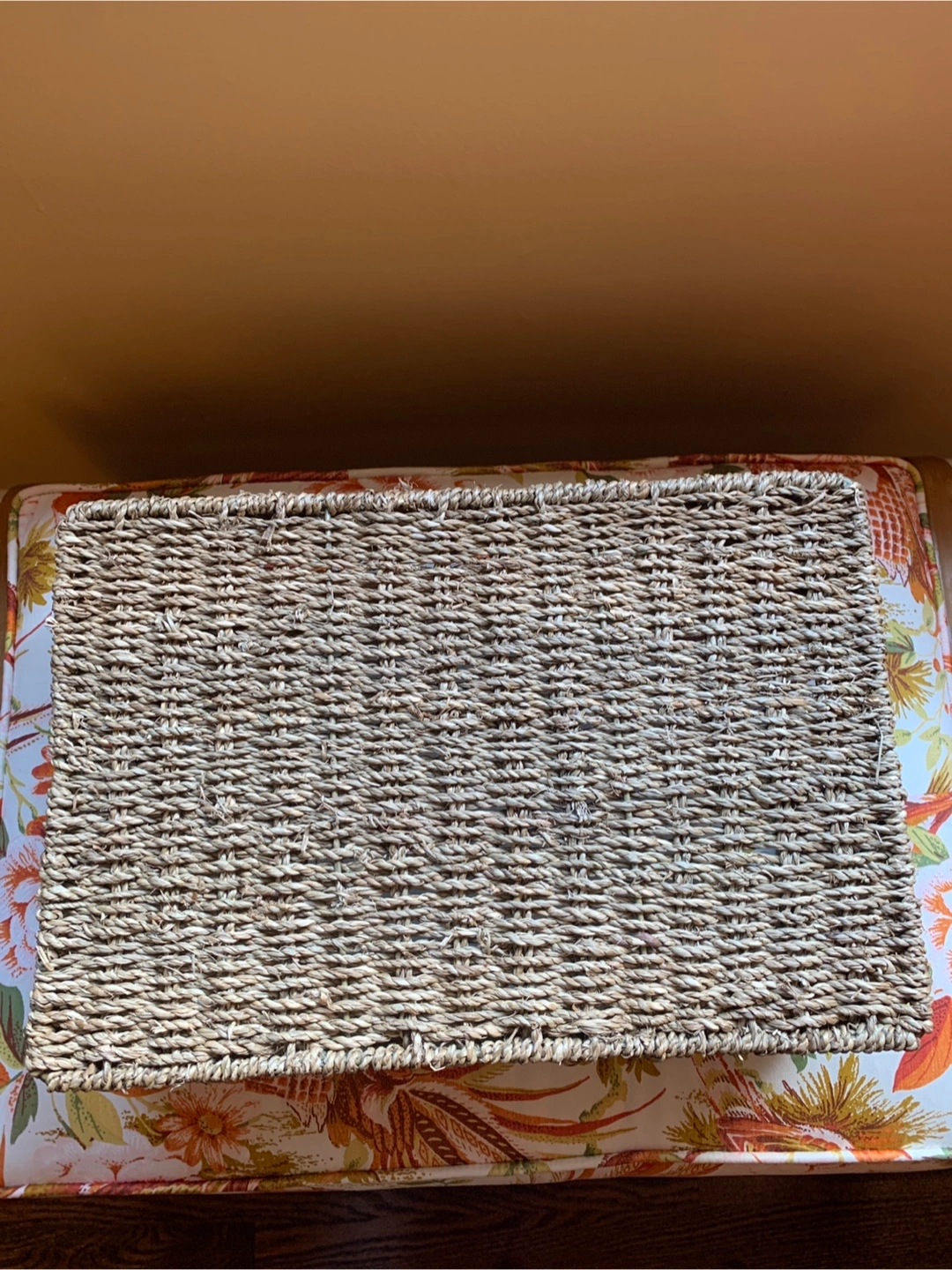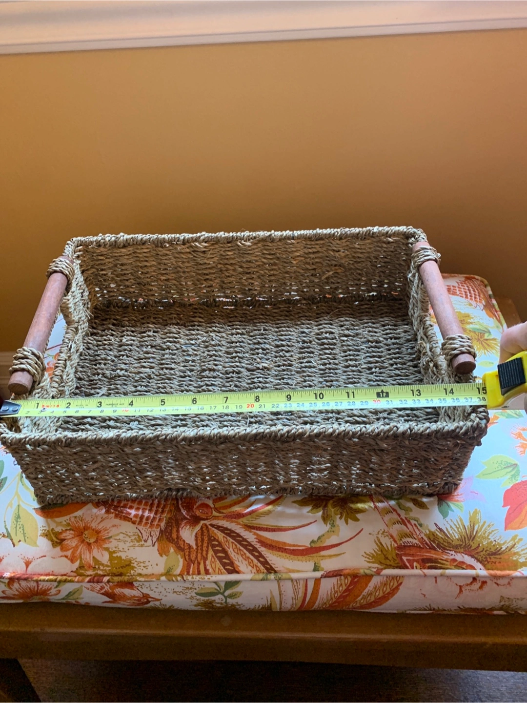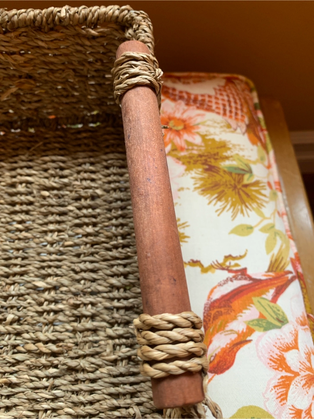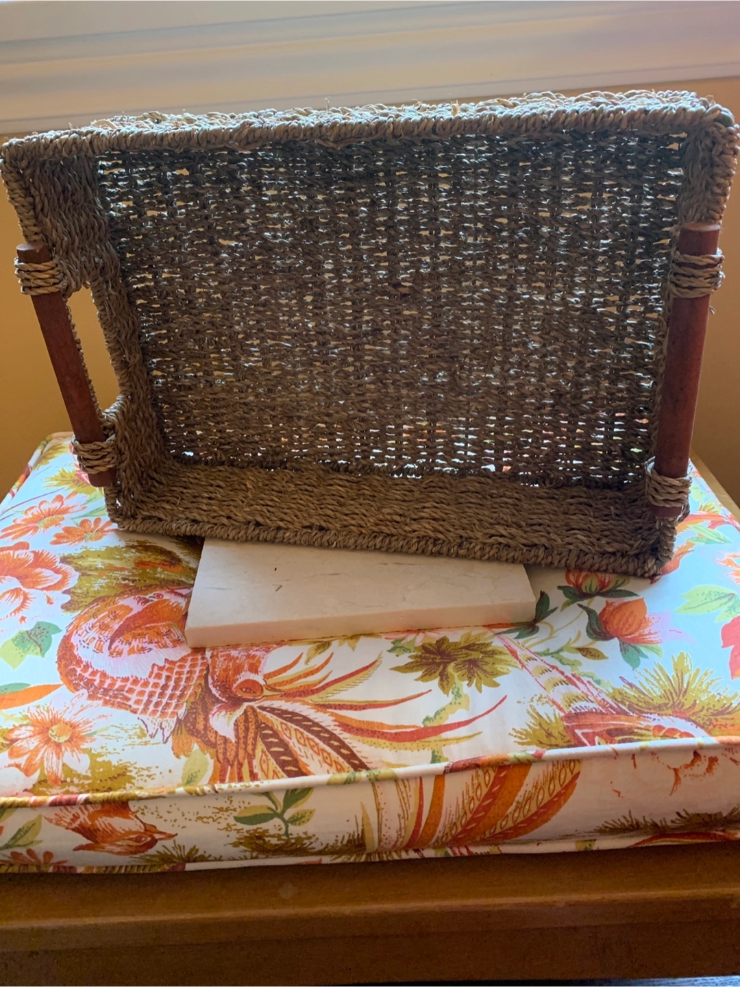 Here's a lovely woven seagrass storage basket with wooden handles! It's in great shape and perfect for organizing items around the house. It has a built in metal framework for extra durability. The natural texture adds a warm, organic touch to any room. 15” long and 10” wide Cash only please.