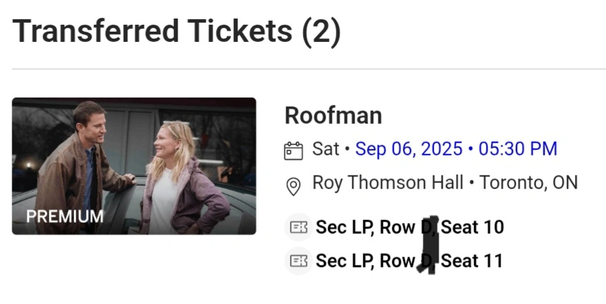 2 seats at the Toronto International Film Festival to see Roofman at Roy Thompson Hall. SATURDAY SEPT 6 at 530pm. Channing Tatum & Kirsten Dunst will be there for this Gala Event. 2 seats beside each other on floor, left side, halfway back. Original Retail over $100 each! Selling for $50 each. I will email transfer you the tickets - You need a ticketmaster account to show tickets at the venue.
