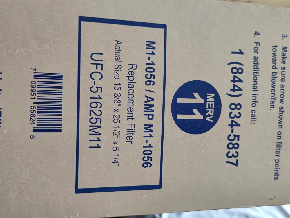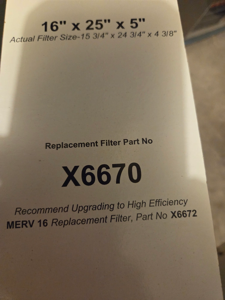 Selling a MERV 11 replacement filter. It's 16" x 25" x 5", with an actual filter size of 15 3/4" x 24 3/4" x 4 3/8". Replacement filter part number is X6670. 3 pack of unused Furnace filters