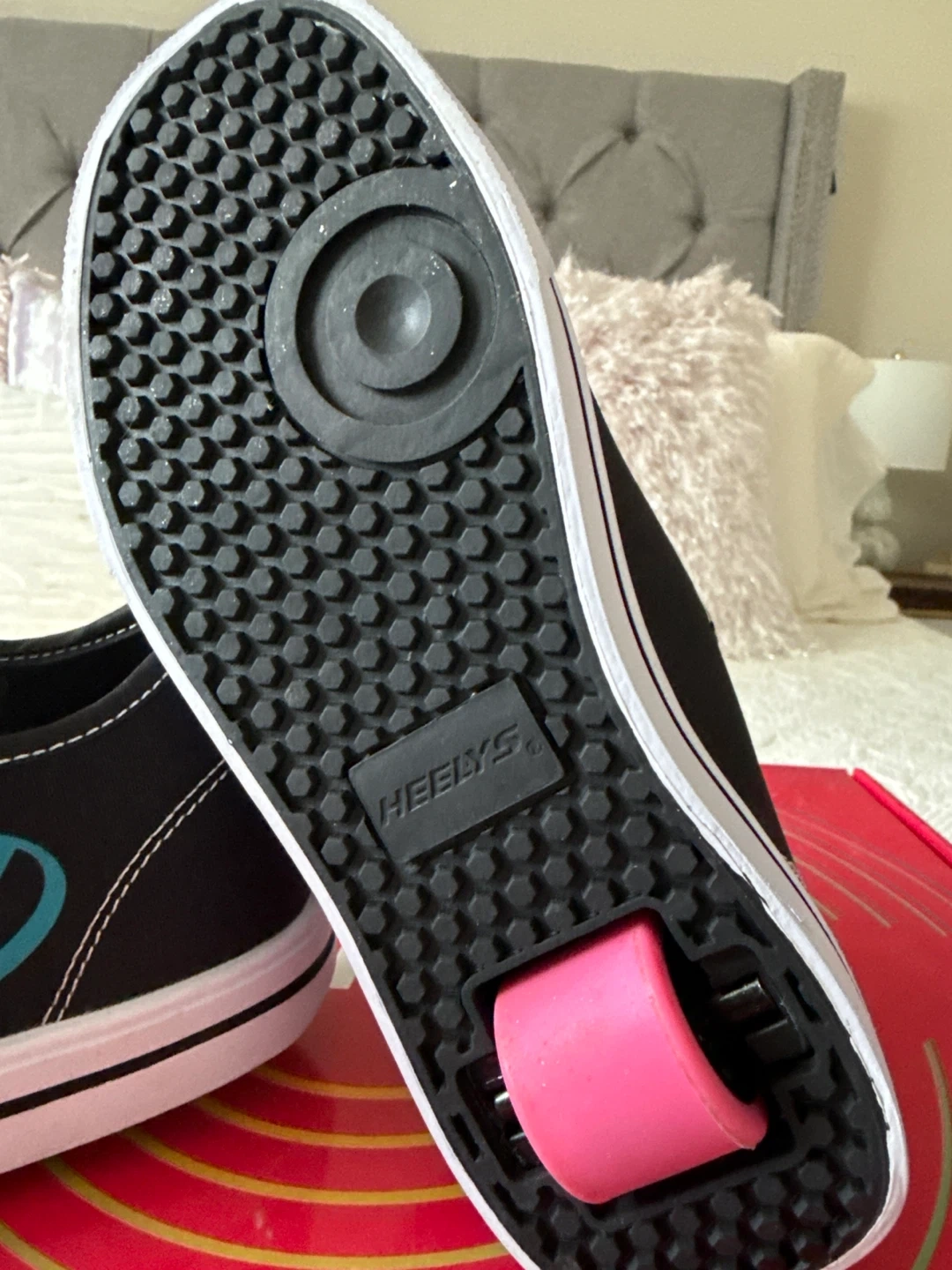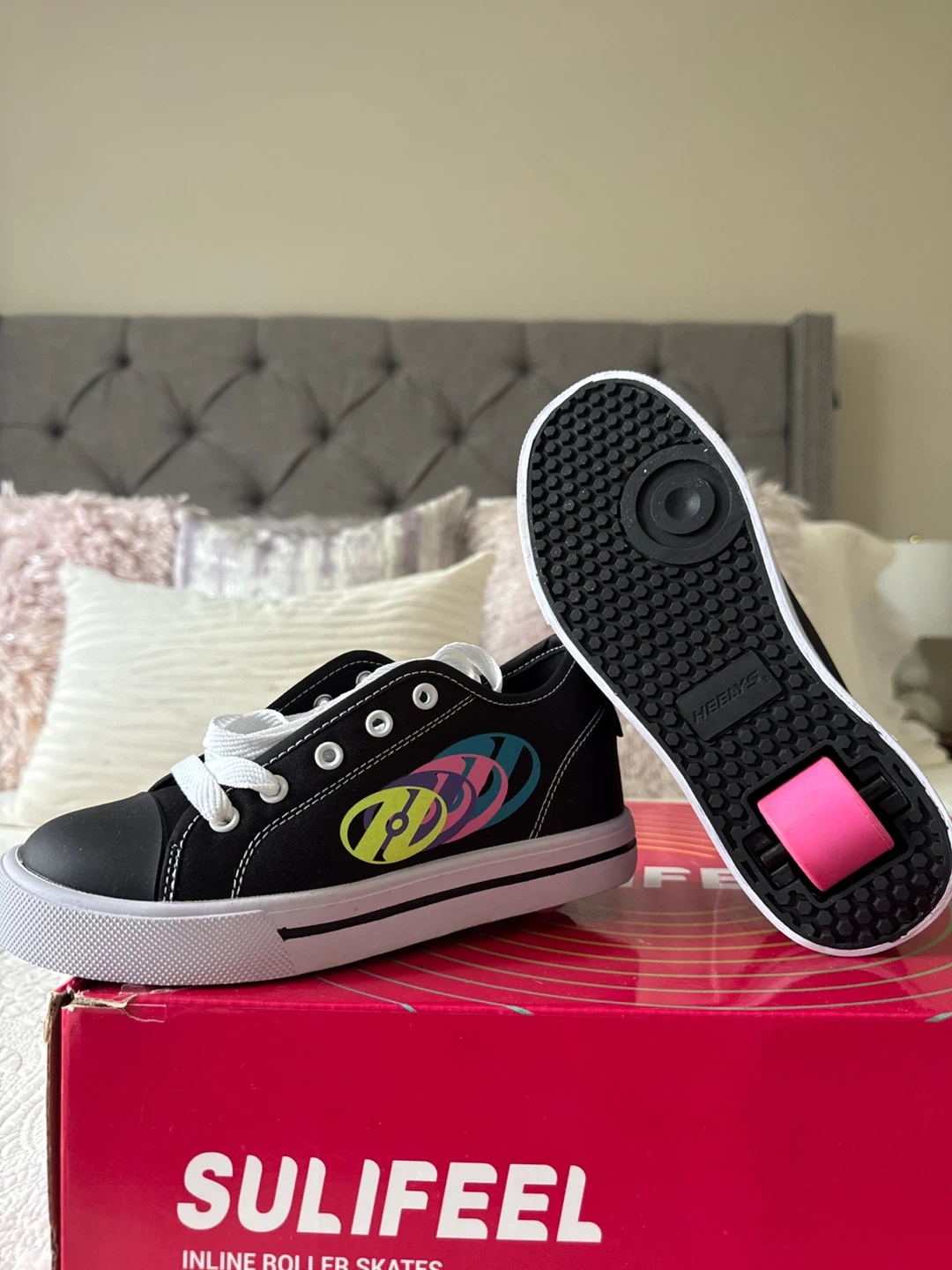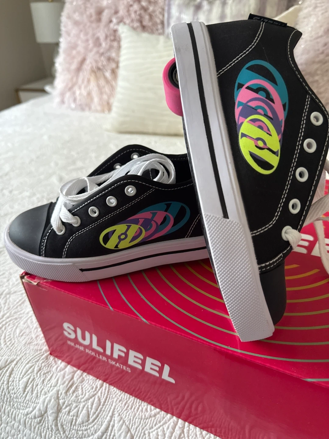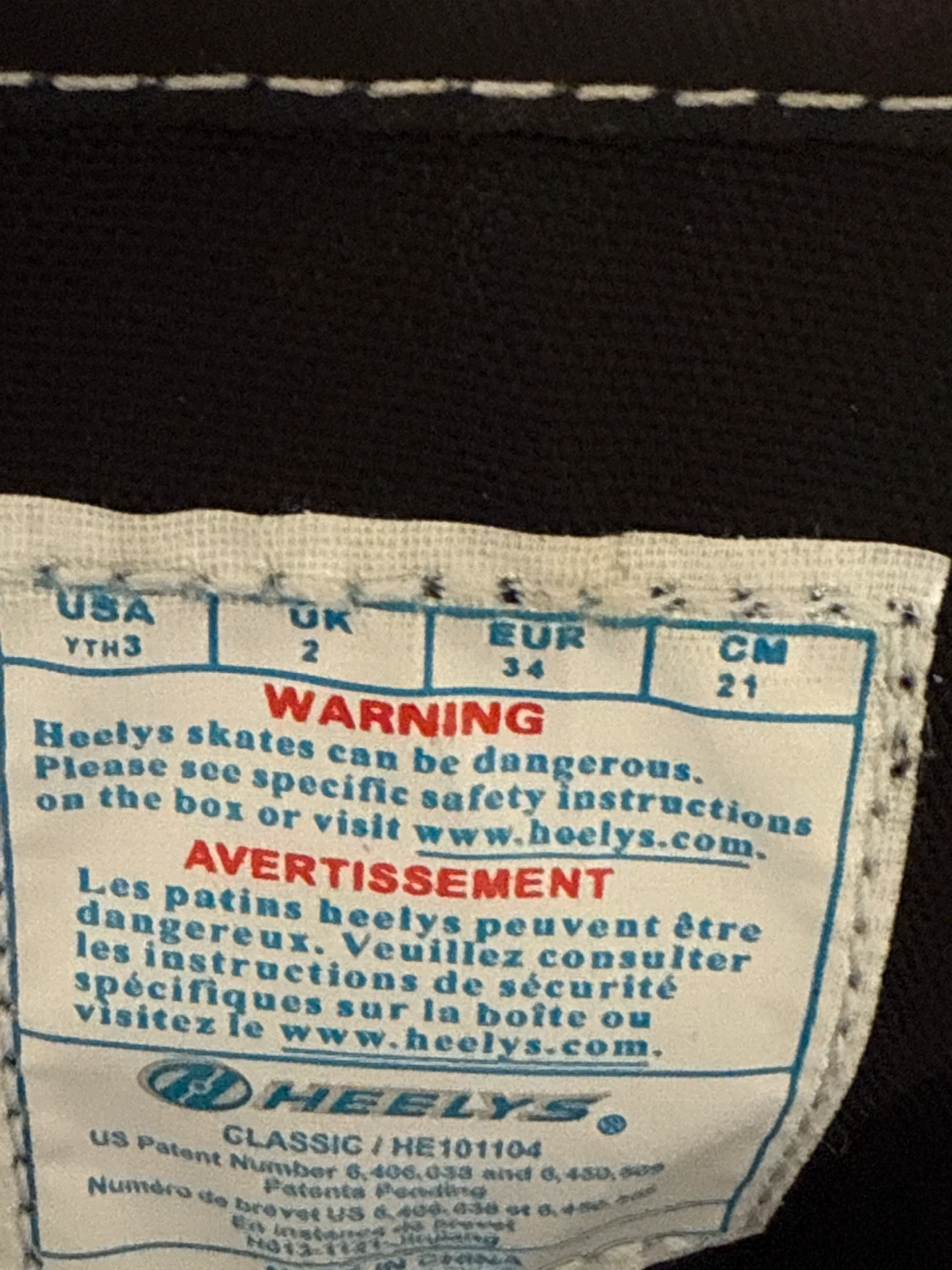 Selling a pair of Heelys Classic roller shoes in youth size 3. They are black with a colourful logo on the side and feature a single wheel in each heel. These shoes are new, without the original box.