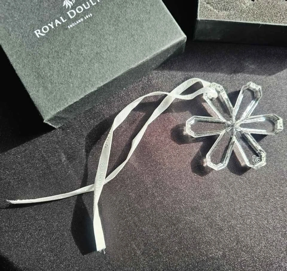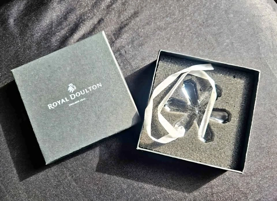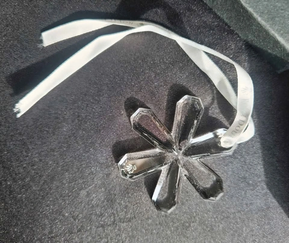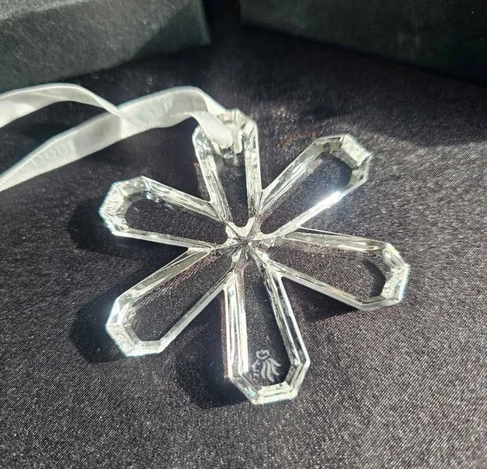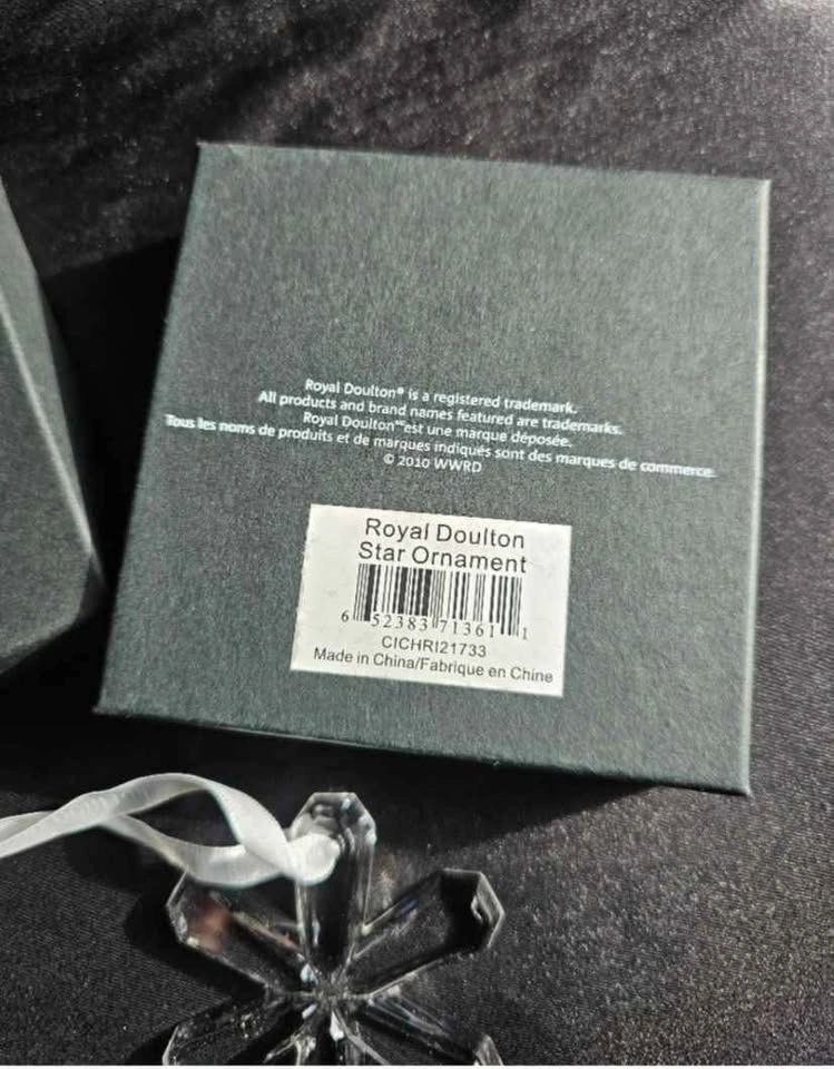 Beautiful new in original box lead crystal Royal Doulton Christmas ornament, in a star or snowflake shape. Ornament hangs from a white ribbon branded with the Royal Doulton logo. Ornament measures about 2.5" wide and is in excellent condition with no scratches or damage. Perfect as a gift idea!