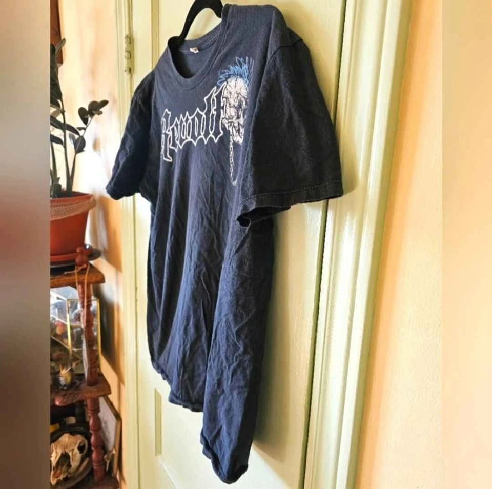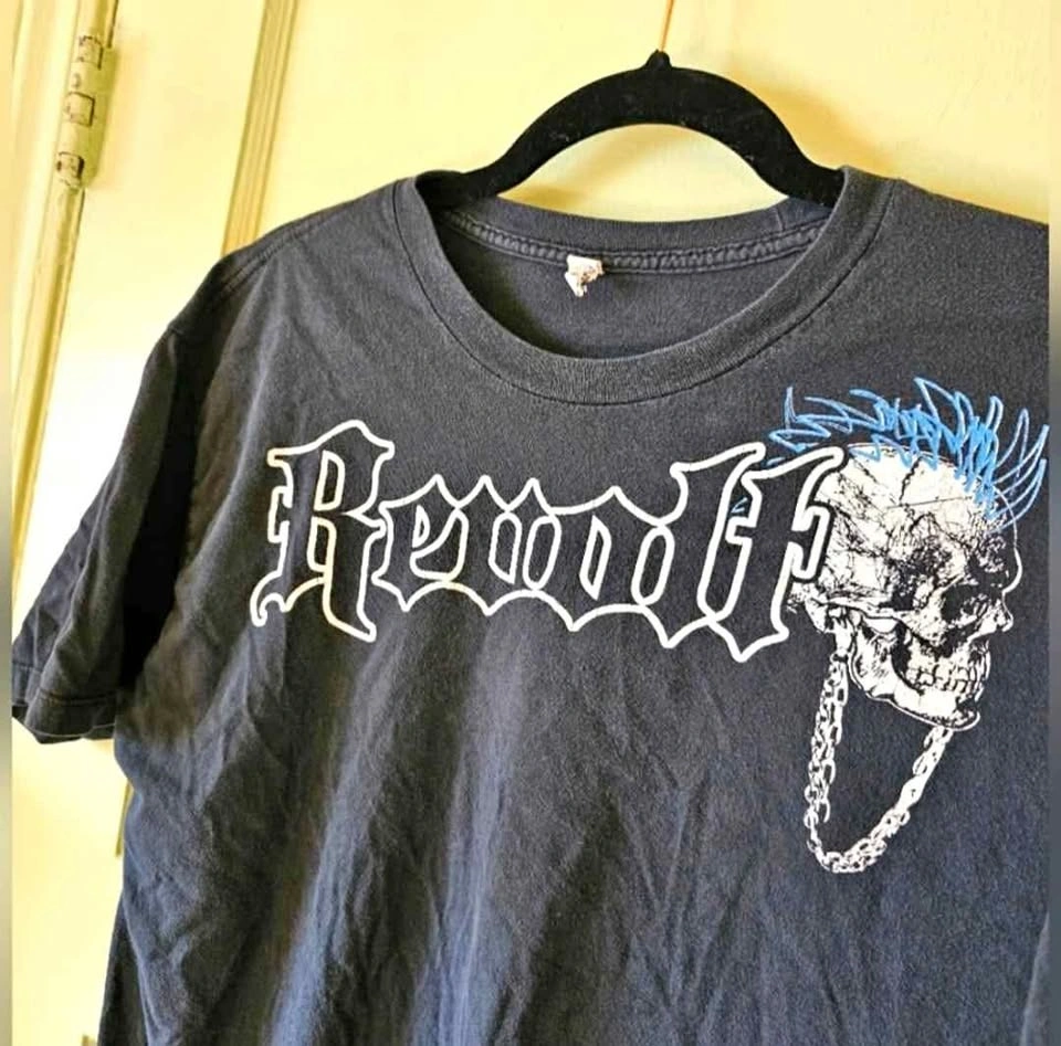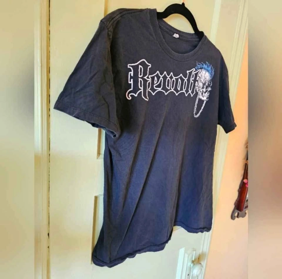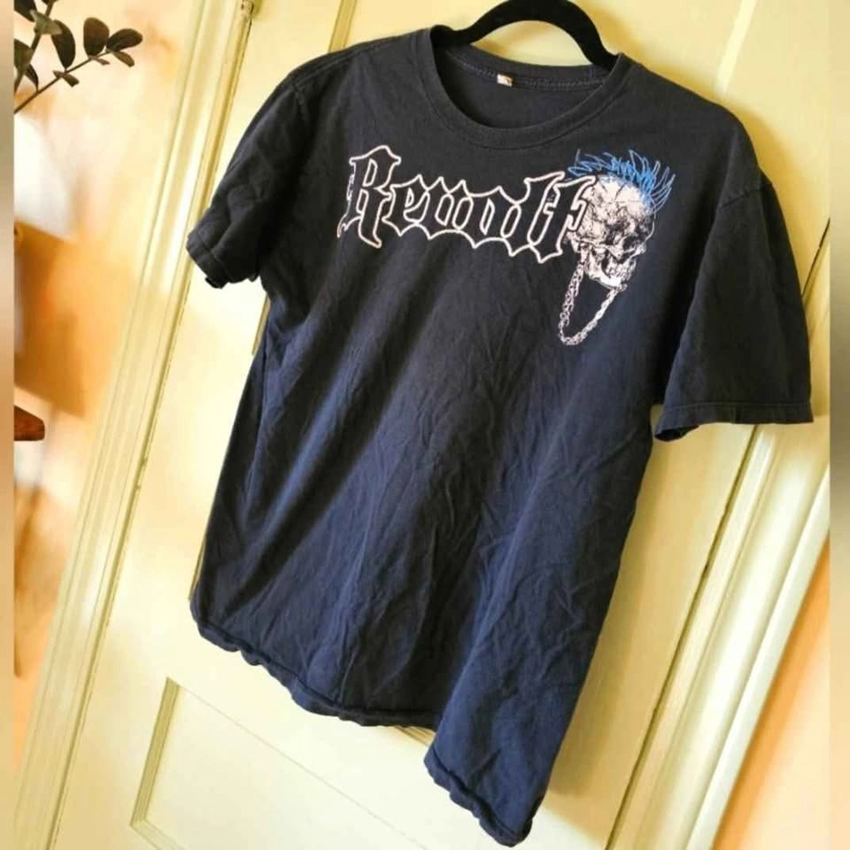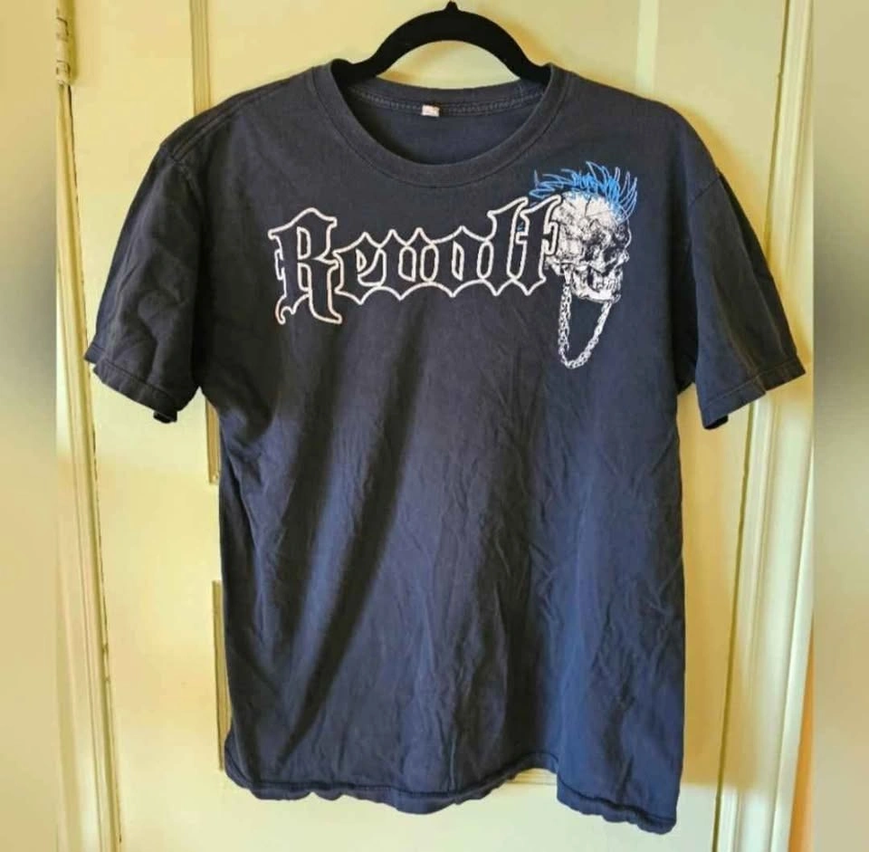 A perfectly worn in vintage black tee, soft and with just the right amount of fading. Shirt features a skull with a mohawk and the word "Revolt" printed in a gothic font. Looks great as is or chopped up into a crop top, for that 90s pop punk/ mall goth aesthetic! Tee measures about 22" from pit to pit, and has no stains or rips. Feel free to message if you have any questions!