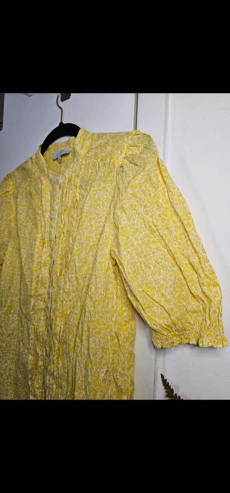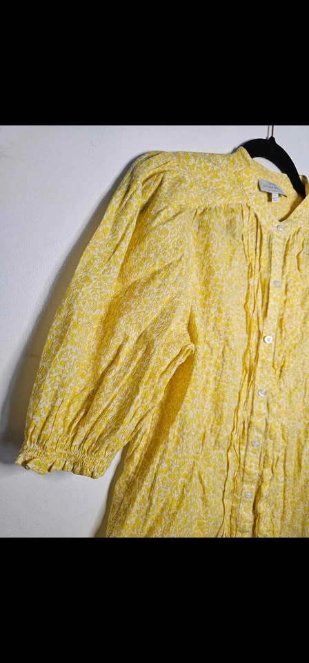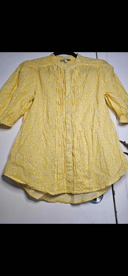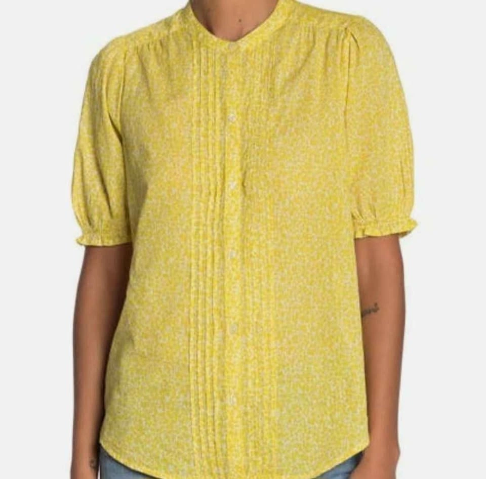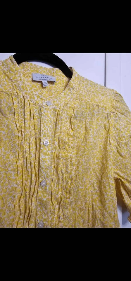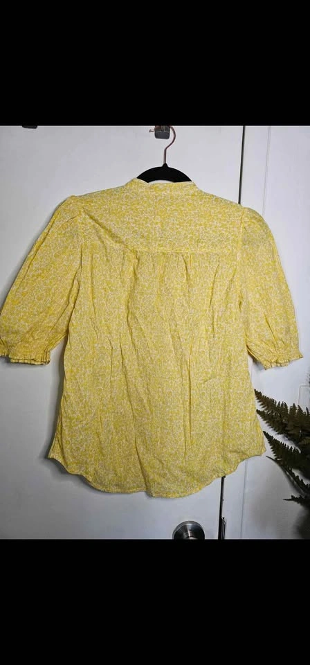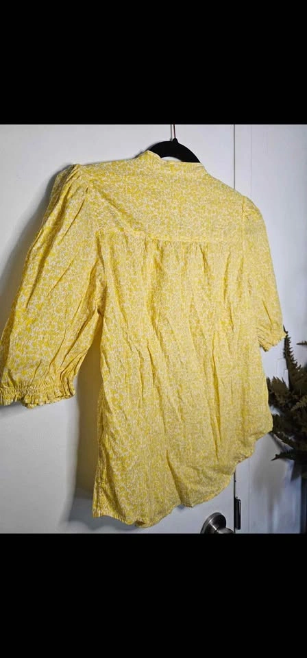 Cheery and cute short sleeve button-up top from Lucky Brand, in a dainty yellow and white floral pattern. Shirt has puffed sleeves and ruching at the sleeve hems, a round neck, pintuck seams down the front, and small glossy white buttons to close it. Top has a looser fit. Materials tag has been removed, but I believe it is made of cotton. The fabric is lightweight and breathable. It is a size S and in very good used condition. Pit to pit measures about 19", and shoulder to bottom hem measures about 23".