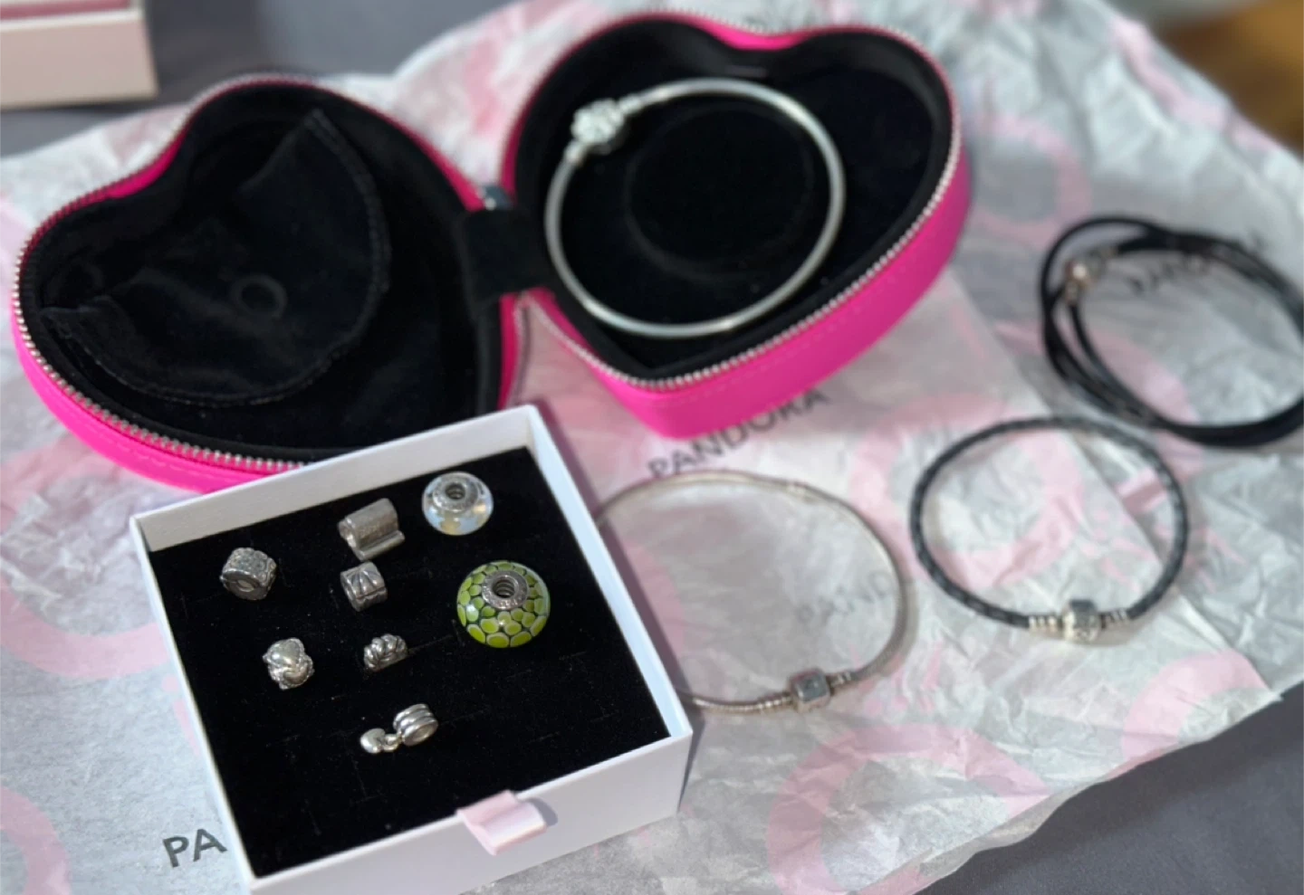 - New Bangle bracelet with pink jewelry case $60 - Used silver clasp bracelet $55 - lightly used leather necklace and bracelet $20 EACH - silver charms $10 - $20 each All authentic and bought straight from pandora. Pu downtown Toronto, Lake shore and Bathurst.