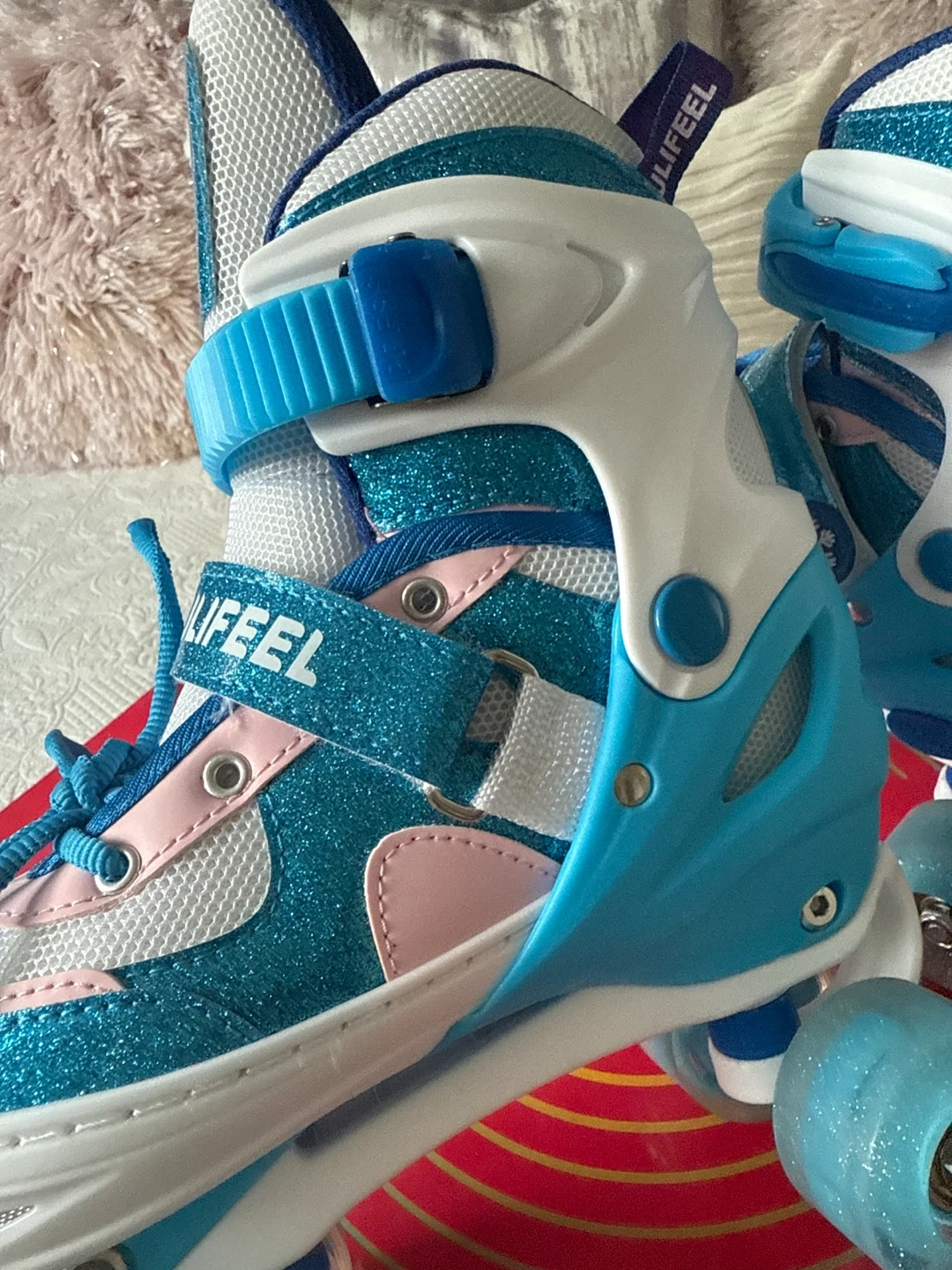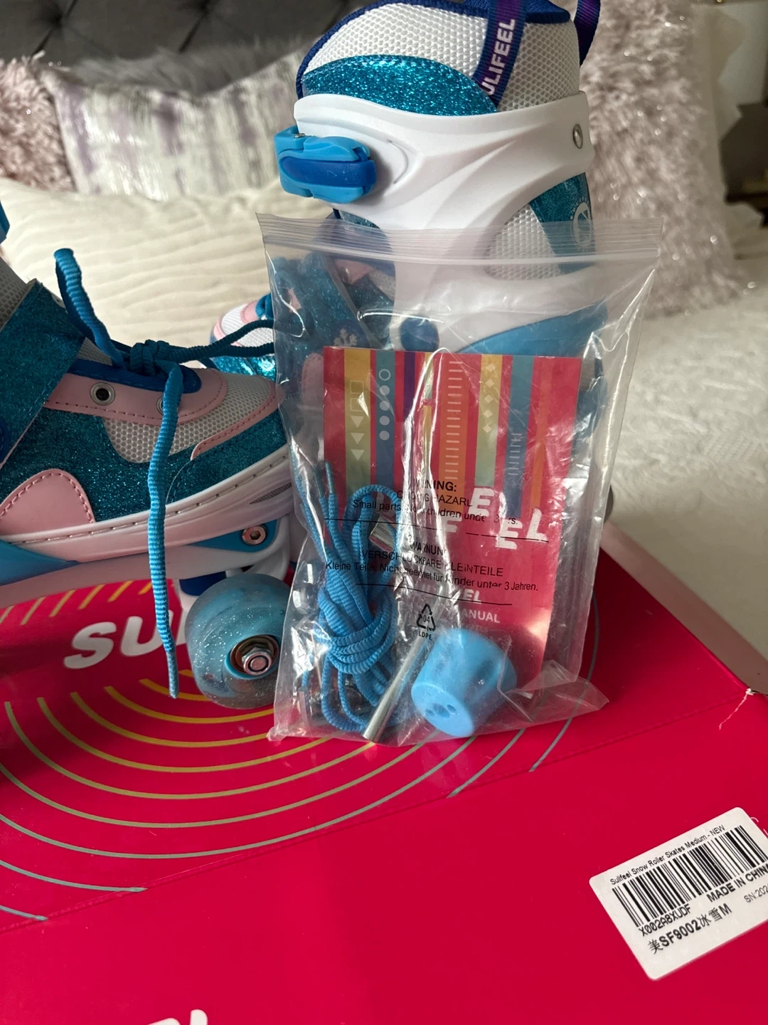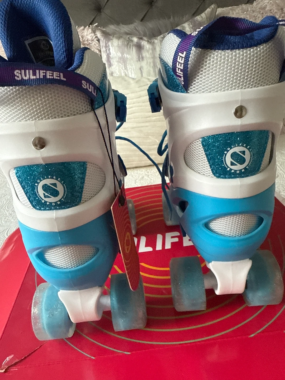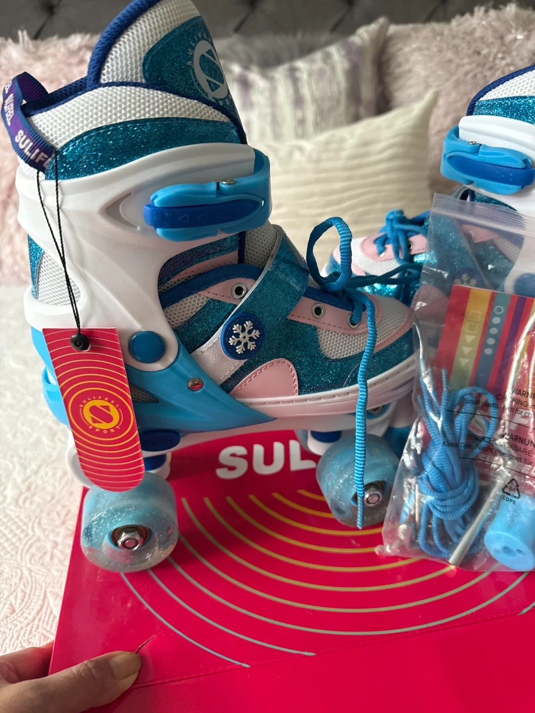 These Sulifeel roller skates are new. They are a lovely blue and pink colour. Comes with the original box.