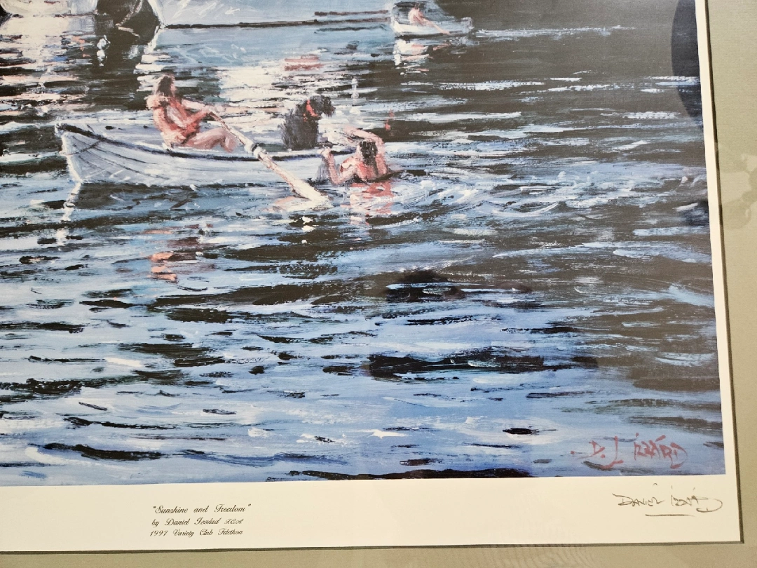 Selling a framed print titled "Sunshine and Freedom" by Daniel Izzard with dog in boat.. It's a lovely piece from the 1997 Variety Club Telethon. The print is already framed and ready to hang, adding a touch of nautical charm to any room.