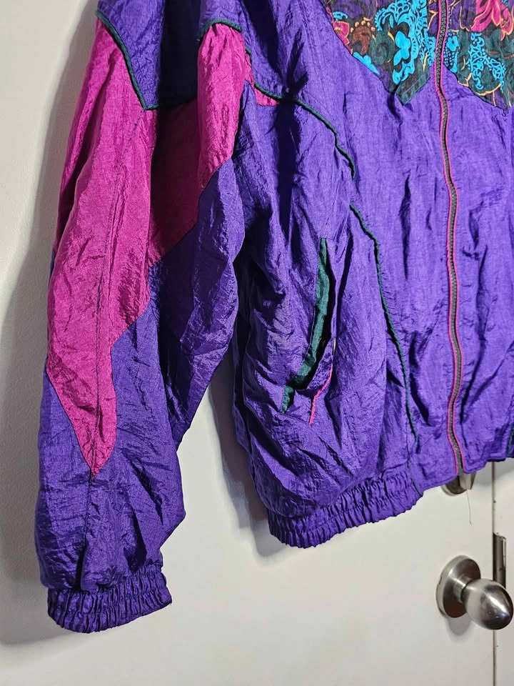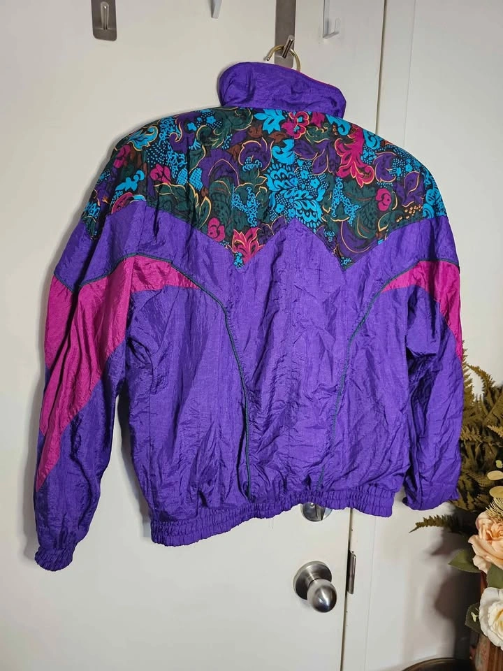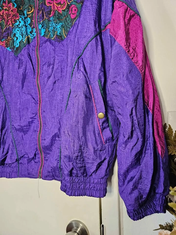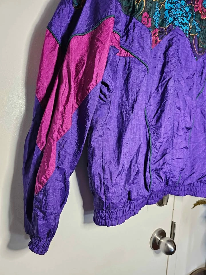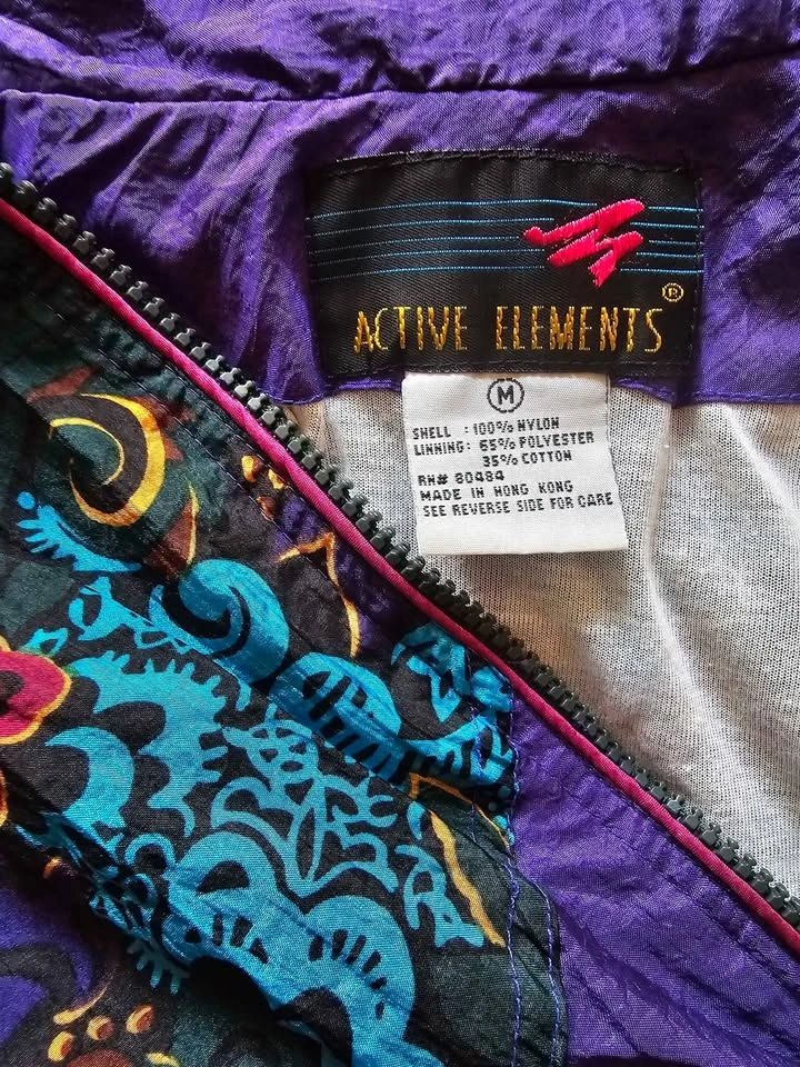 Vibrant vintage 1990s nylon windbreaker jacket in bold purple and mauve with a floral design across the chest and shoulders with added shades of turquoise, dark green, dark brown, mustard yellow and black. Perfect for retro spring or autumn looks! Jacket has a full length zipper, front pockets on snaps, elasticized cuffs and waistband, a high collar and a soft poly/ cotton lining. Jacket is a size M and in excellent vintage condition. Made in Hong Kong by Active Elements. Pit to pit measures about 24", pit to sleeve hem measures about 18.5", and shoulder to bottom hem measures about 23".