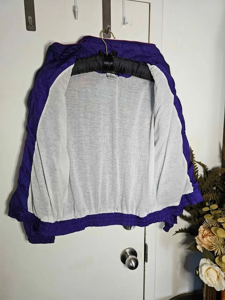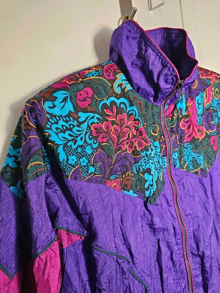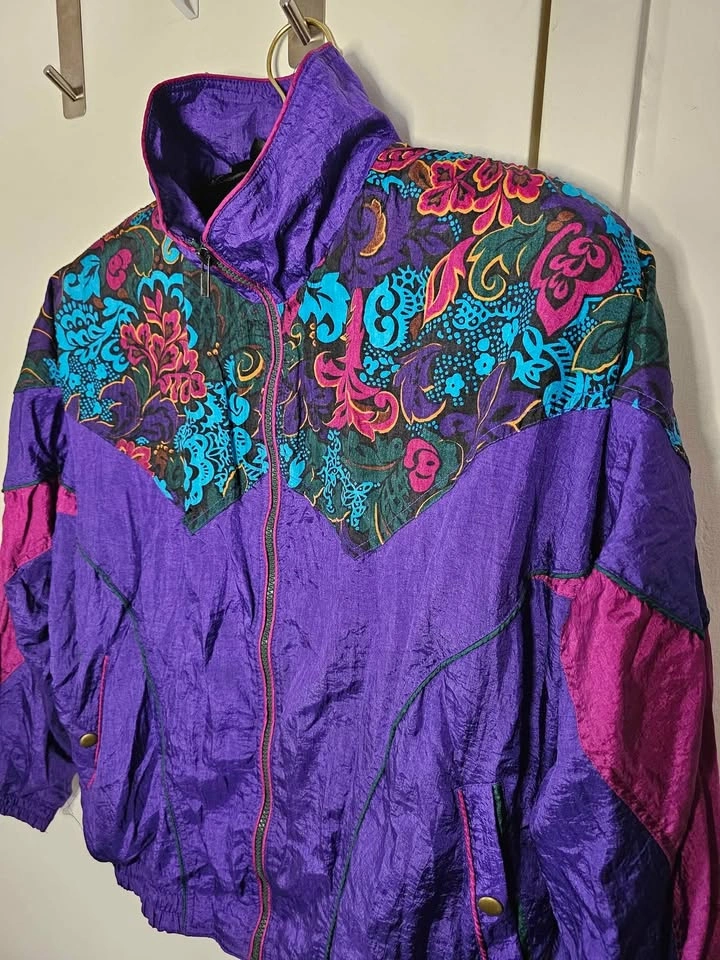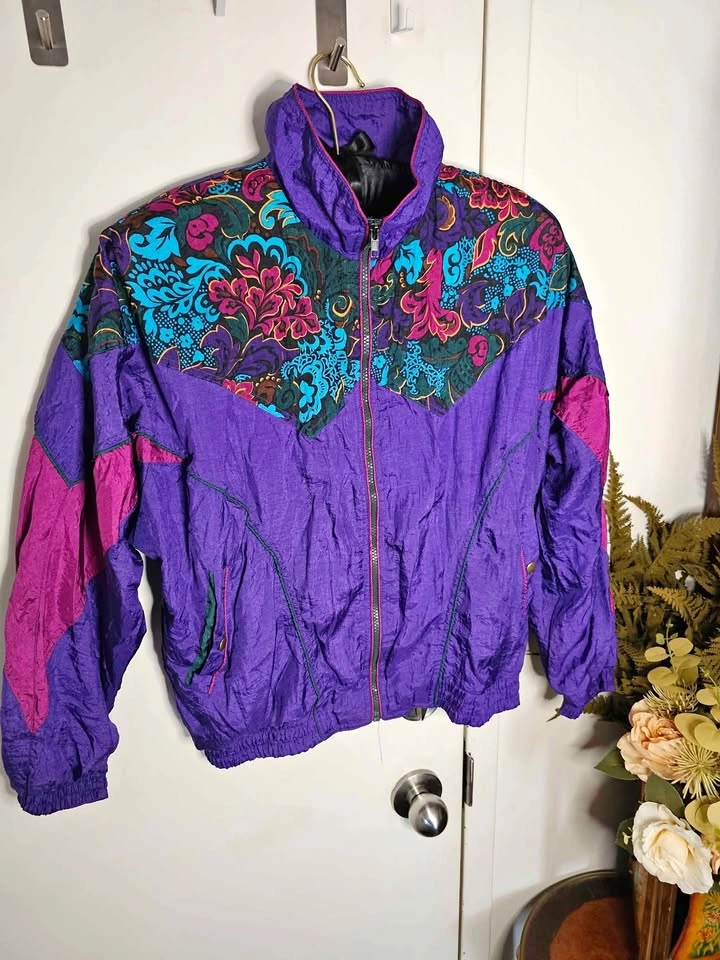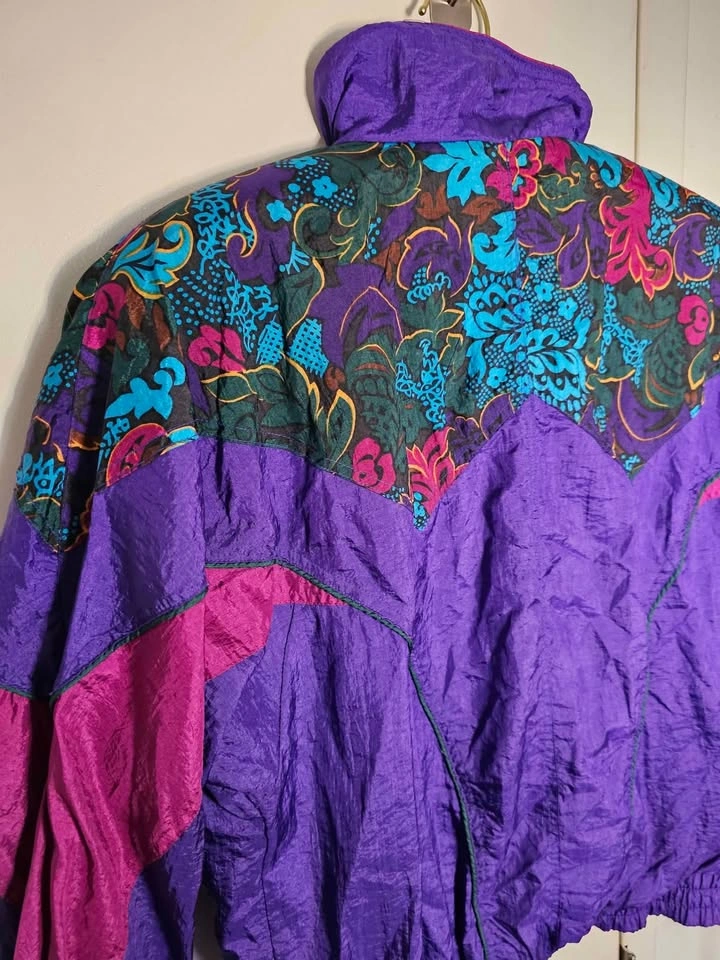 Vibrant vintage 1990s nylon windbreaker jacket in bold purple and mauve with a floral design across the chest and shoulders with added shades of turquoise, dark green, dark brown, mustard yellow and black. Perfect for retro spring or autumn looks! Jacket has a full length zipper, front pockets on snaps, elasticized cuffs and waistband, a high collar and a soft poly/ cotton lining. Jacket is a size M and in excellent vintage condition. Made in Hong Kong by Active Elements. Pit to pit measures about 24", pit to sleeve hem measures about 18.5", and shoulder to bottom hem measures about 23".