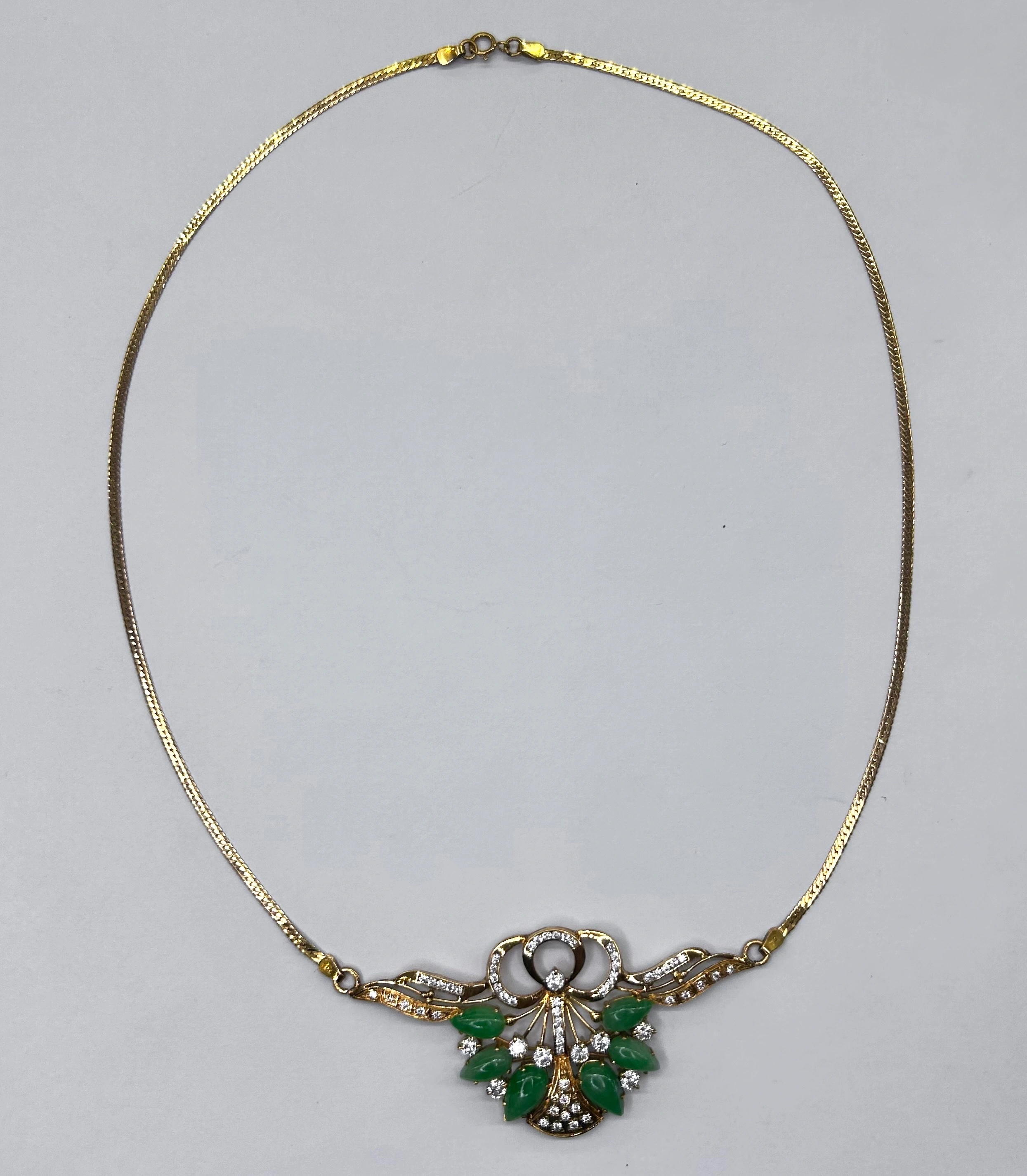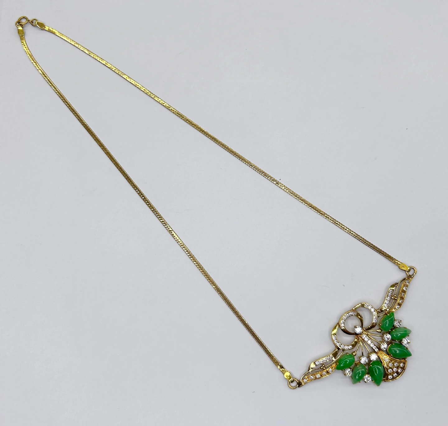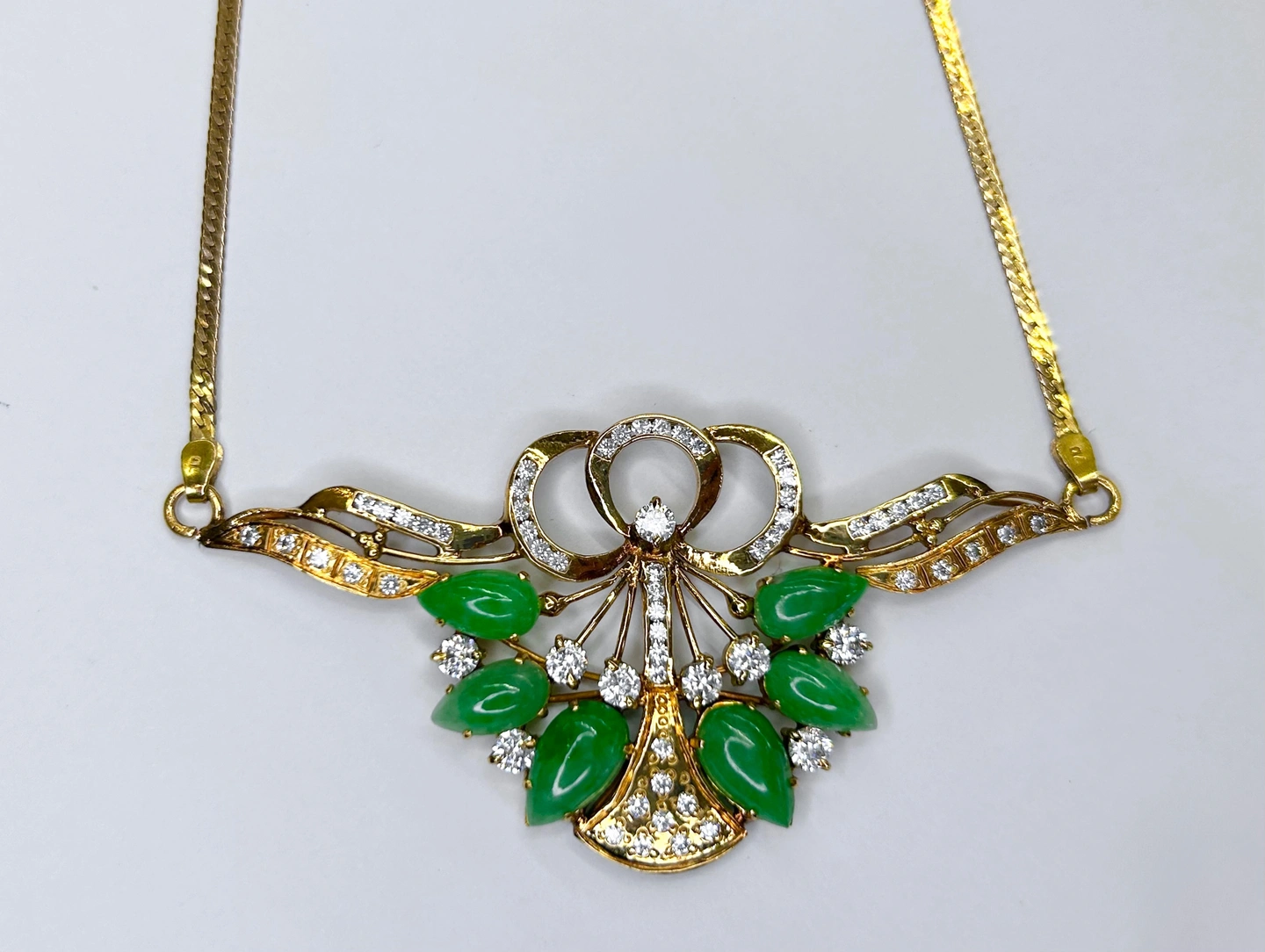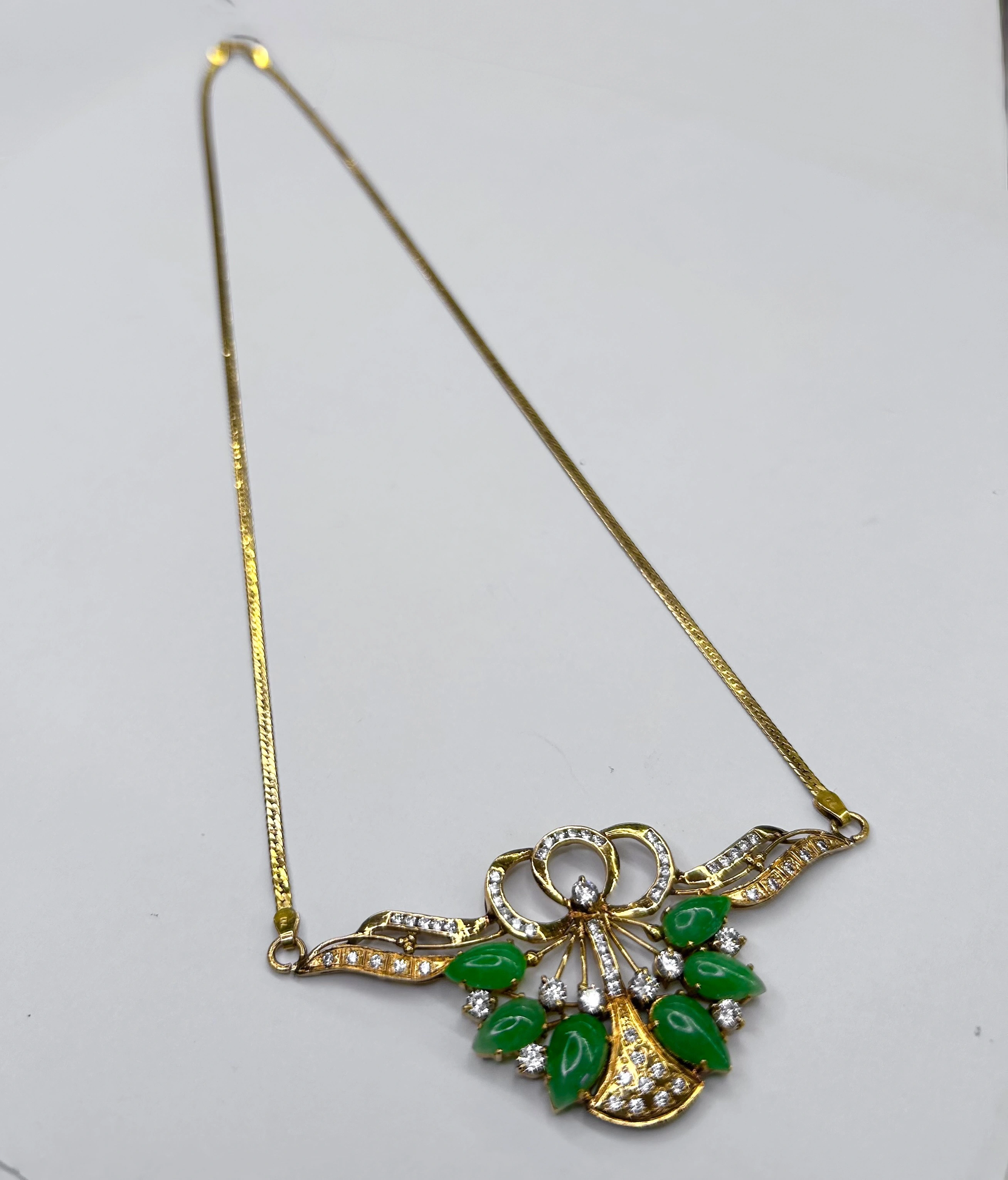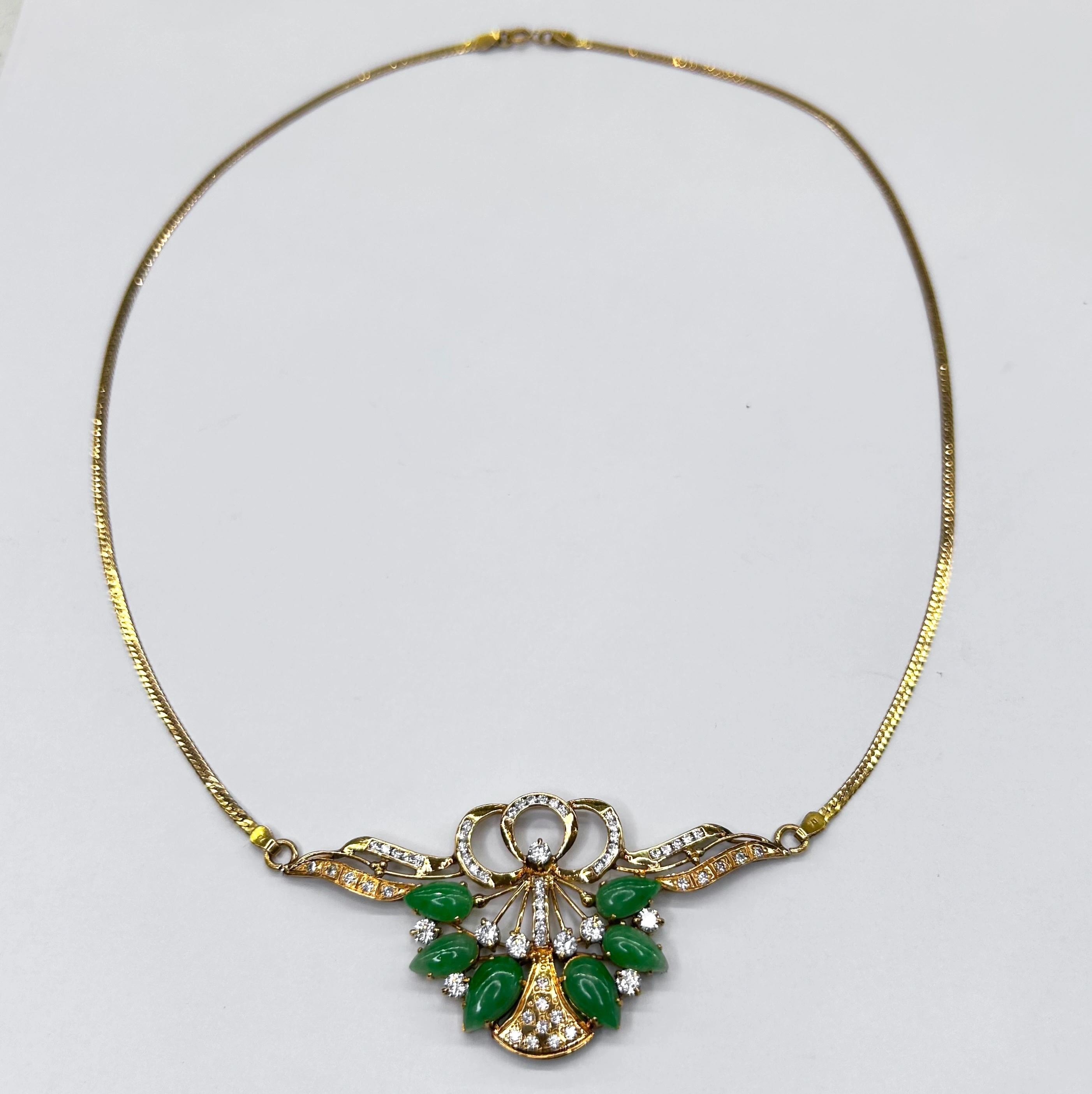 18K Yellow Gold Necklace With Jade & Cubic Zirconia - 13.90 - 18 inches Comes as seen in photos $1,800 Available at 4 Seasons Pawn Shop & Gold Buyer (Newton Location) 7155 King George Blvd Surrey, BC Canada We are open 9:30 am - 6:00 pm Monday - Saturday and 11:00 am - 6:00 pm on Sundays. For more information visit our shop or give us a call at 604-592-0223 We accept multiple forms of payment including cash, e transfer, debit, visa, Mastercard, American Express, certified bank. We also have an interest free layaway plan available, ask us for more information. Thank you for your interest in our products. #1016739