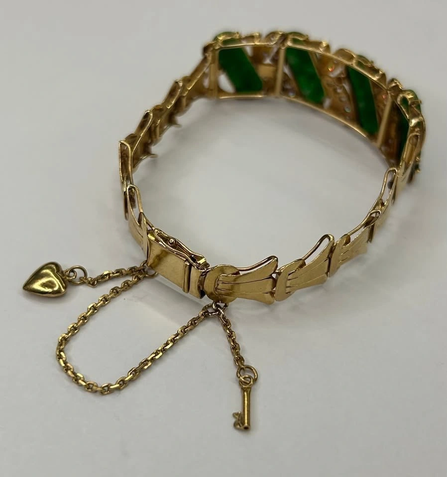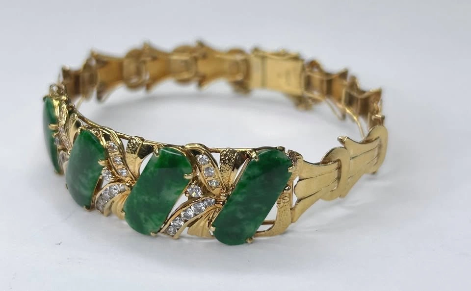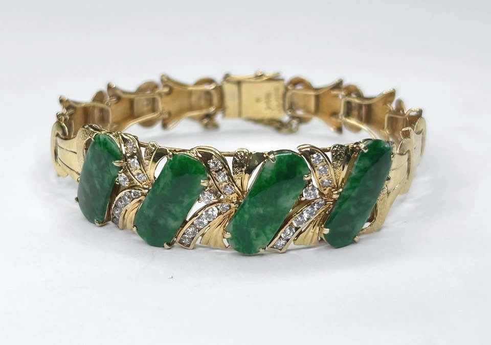 18K Yellow Gold Bracelet With Jade And Cubic Zirconia - 16.80g Comes as seen in photos $2,150 Available at 4 Seasons Pawn Shop & Gold Buyer (Newton Location) 7155 King George Blvd Surrey, BC Canada We are open 9:30 am - 6:00 pm Monday - Saturday and 11:00 am - 6:00 pm on Sundays. For more information visit our shop or give us a call at 604-592-0223 We accept multiple forms of payment including cash, e transfer, debit, visa, Mastercard, American Express, certified bank. We also have an interest free layaway plan available, ask us for more information. Thank you for your interest in our products. #1016739