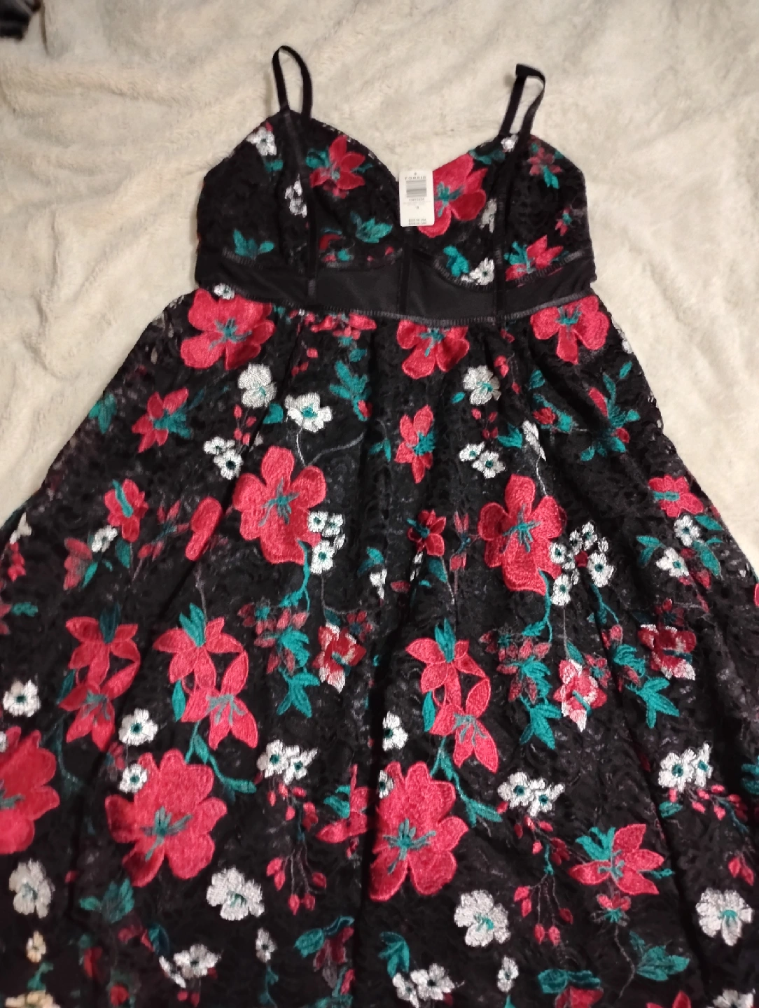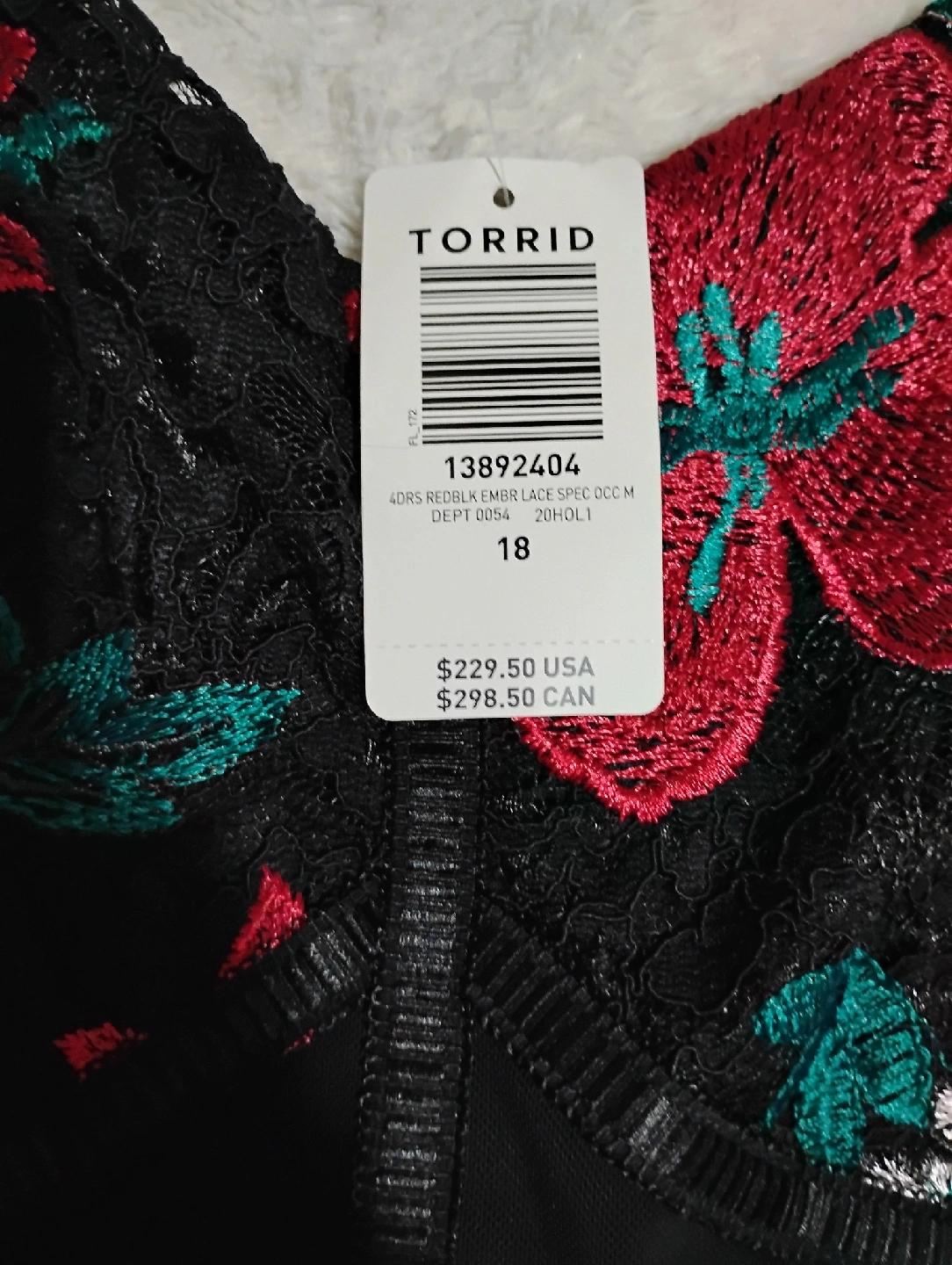 Selling a beautiful Torrid dress in a size 18. It features a lovely black lace overlay with red and white floral embroidery. It has never been worn and in brand new condition. Paid full price. Perfect for a special occasion or a night out!