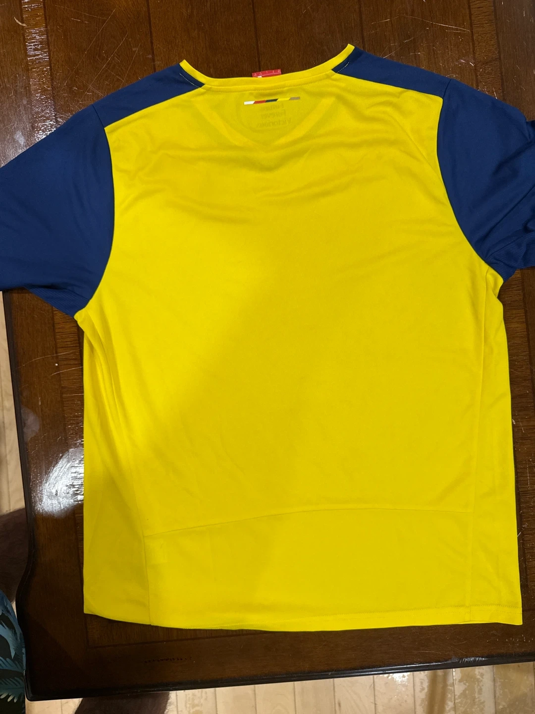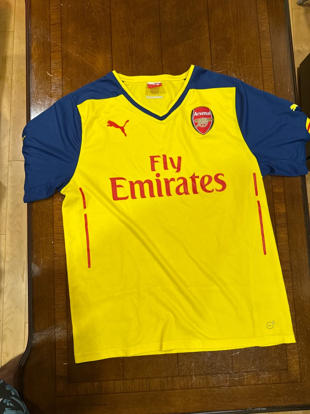 Selling an Arsenal FC jersey by Puma! It's a vibrant yellow with navy blue sleeves. Features the Fly Emirates logo and the Arsenal club crest. Perfect for showing your support!
