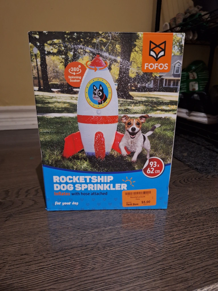 Selling a Fofos Rocketship Dog Sprinkler! It's still in its original box and ready to provide some fun for your furry friend. It inflates and comes with a hose attachment for easy setup. The sprinkler features a 360-degree spinning soaker and measures 93 x 62 cm. Perfect for keeping your dog cool and entertained this summer!