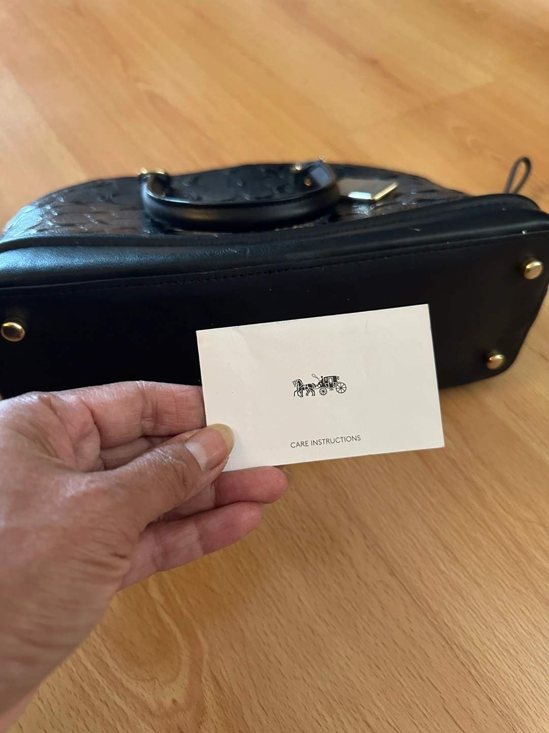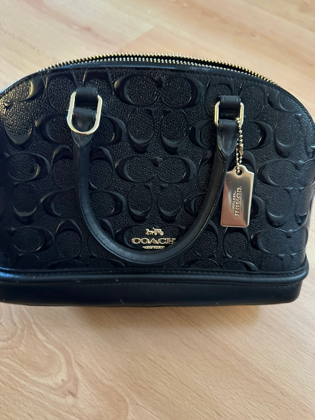 This is a Coach black embossed dome satchel. It's a stylish and compact bag, perfect for everyday use. The bag features the Coach logo pattern embossed throughout. It comes with care instructions. Used only once. Basically brand new
