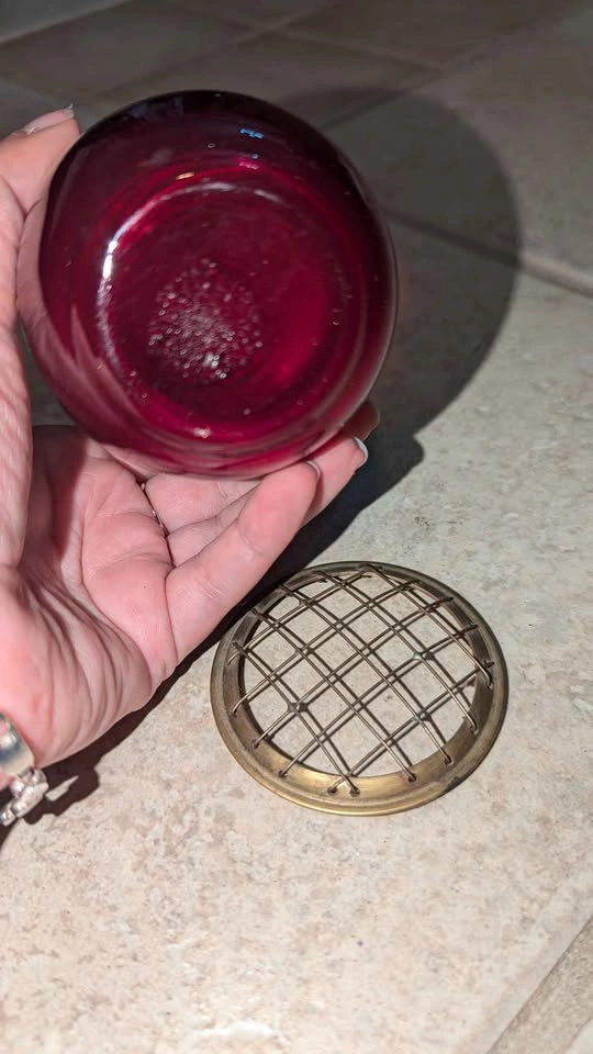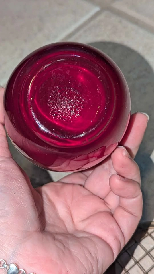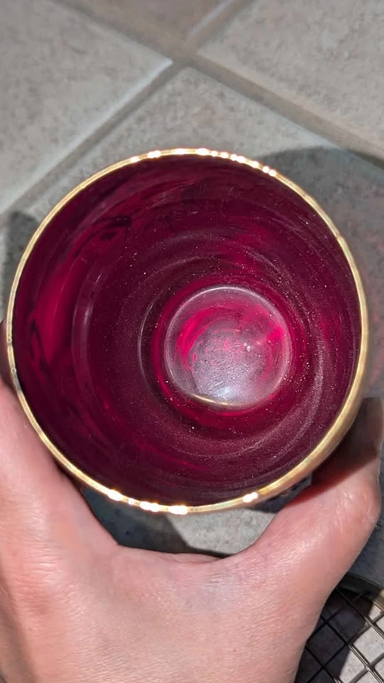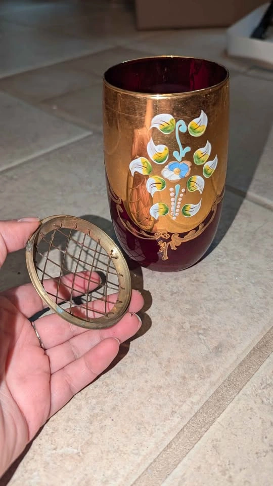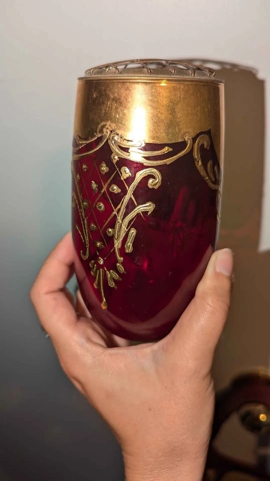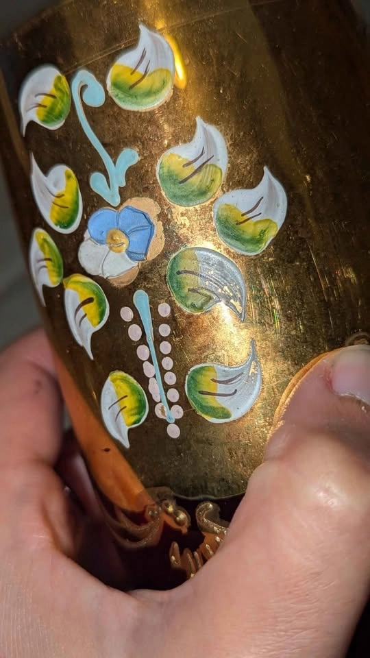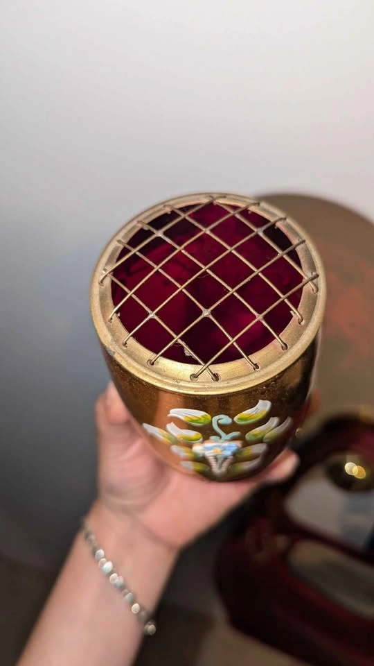 Beautiful vintage ruby red glass vase with hand-painted enamel floral details and gold overlay. Includes the original brass flower frog insert for arranging flowers. Ruby red glass body Hand-painted enamel floral design with raised details Heavy gold gilt overlay Brass flower frog insert (removable) Collectible Bohemian Czech glass approx. 6.5" tall Good vintage condition with some light age wear to the gilt, but displays beautifully.
