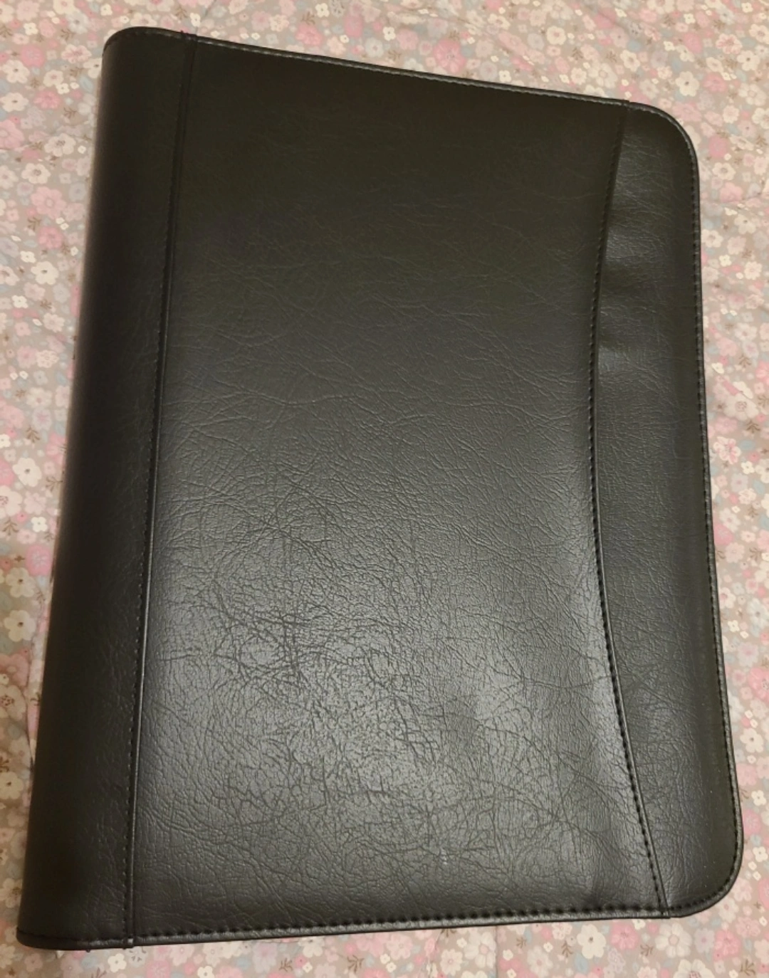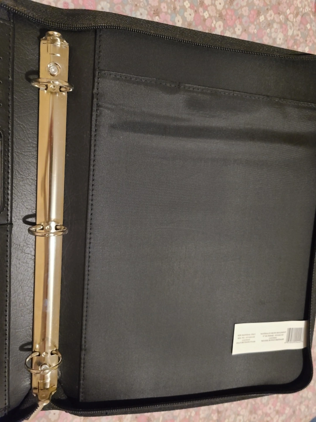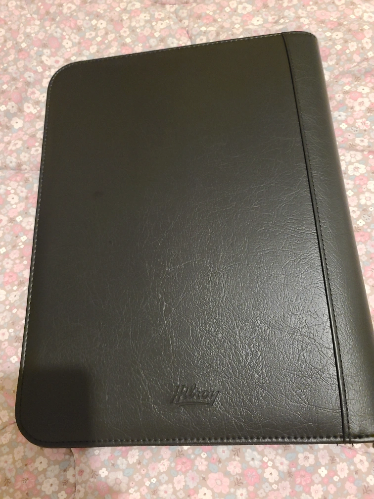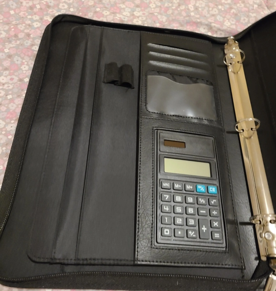Selling a Hilroy zippered portfolio binder! It's black and made of what seems to be leather or a leather-like material. It also includes a built-in calculator, which is super handy. Perfect for school, work, or staying organized