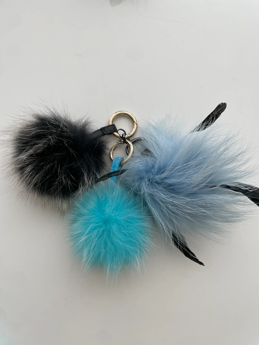 Cute fur pom pom keychain with a mix of black and blue colours! Add a bit of fun to your keys or bag No substitutions. Not faux fur. Must take all
