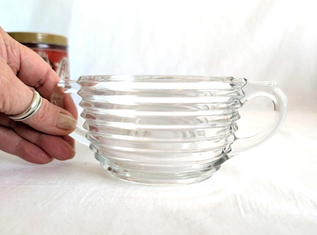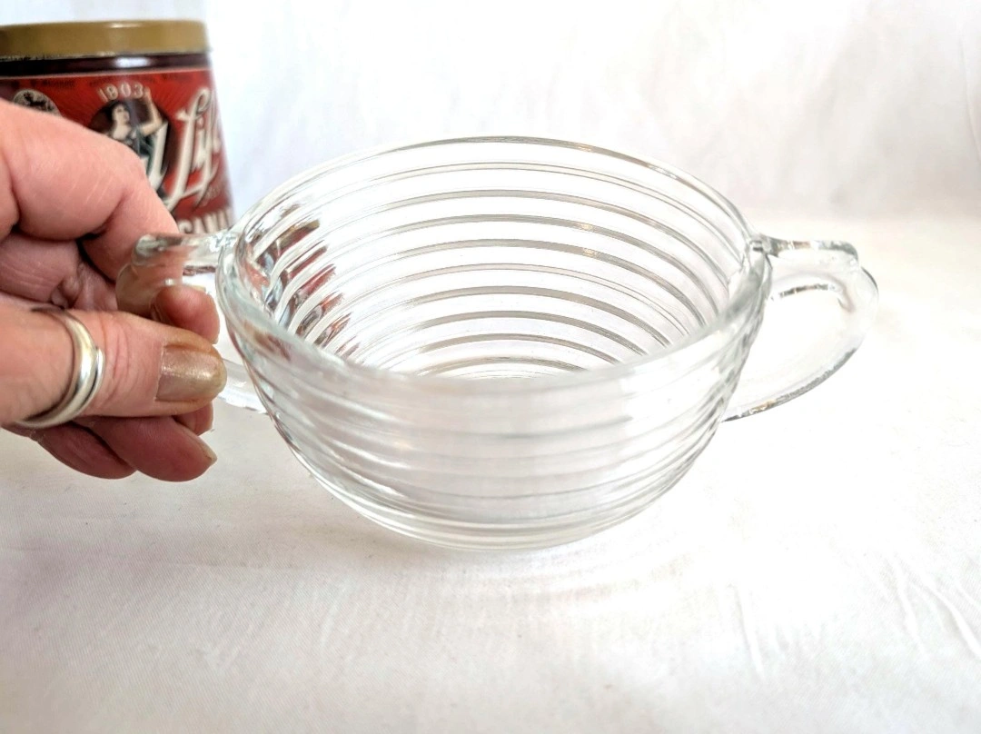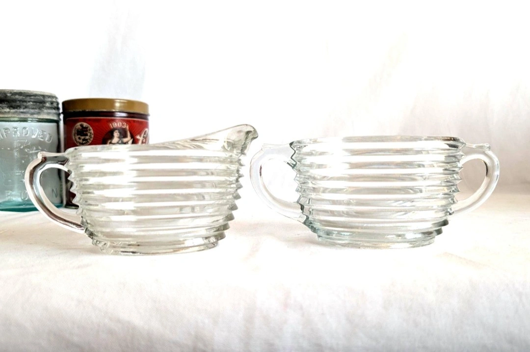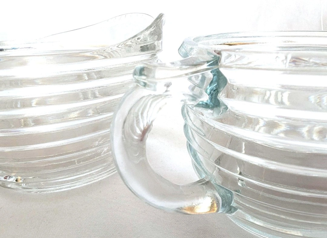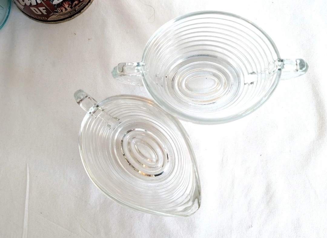 Anchor Hocking clear ribbed glass creamer and sugar bowl. Manhattan pattern. Oval shaped body. Each measure approximately 2.5 inches in height and 3 x 4 inches in diameter. Good vintage condition. A great set for retro kitchenware lovers. ๐ PICK UP TOWNLINE HWY 2 AREA ๐ CASH is preferred please โบ๏ธ