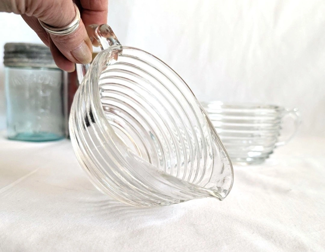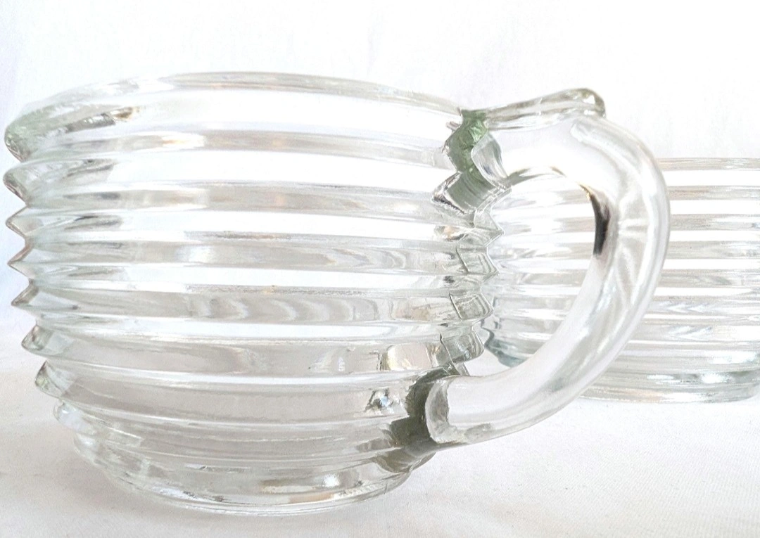 Anchor Hocking clear ribbed glass creamer and sugar bowl. Manhattan pattern. Oval shaped body. Each measure approximately 2.5 inches in height and 3 x 4 inches in diameter. Good vintage condition. A great set for retro kitchenware lovers. π PICK UP TOWNLINE HWY 2 AREA π CASH is preferred please βΊοΈ