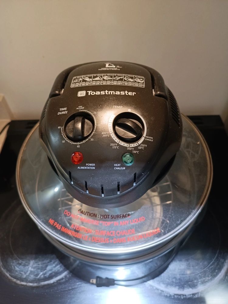 Selling a Toastmaster halogen oven. It has settings for time and temperature. It also has a caution label: HOT SURFACE