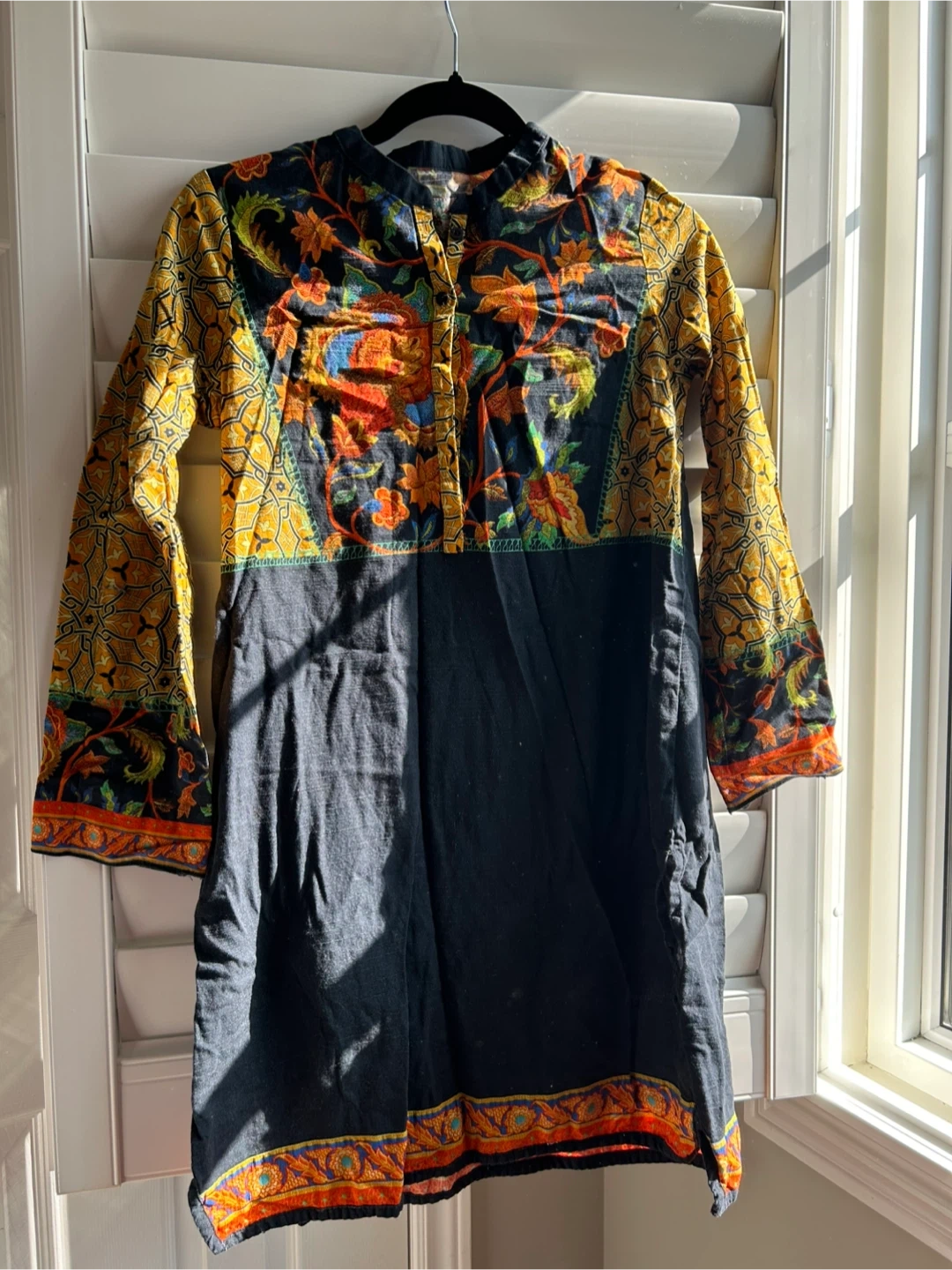 This tunic dress features a vibrant floral print on the upper portion and sleeves, with a solid dark blue/black lower half. It has long sleeves and a button-up neckline. Perfect for adding a pop of colour to your wardrobe! Size medium