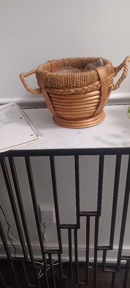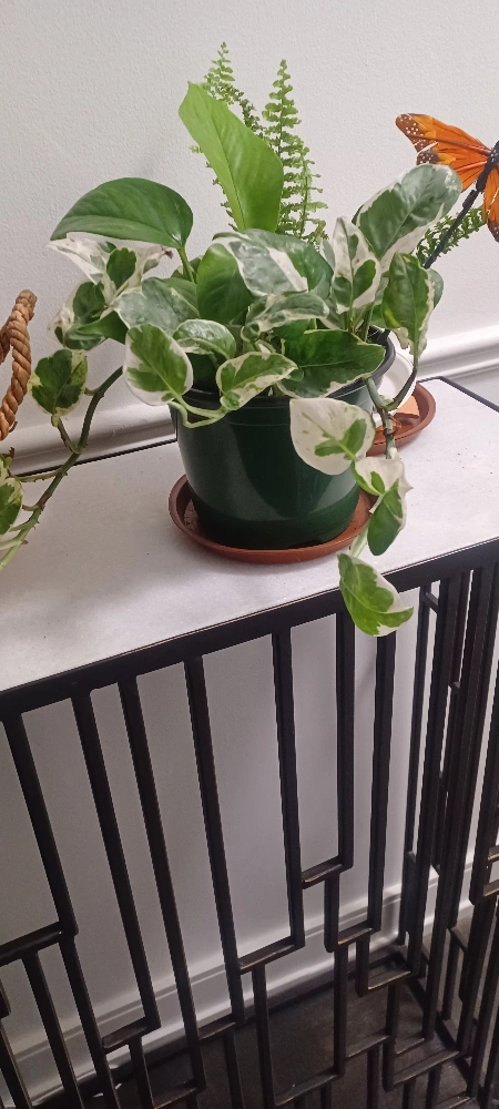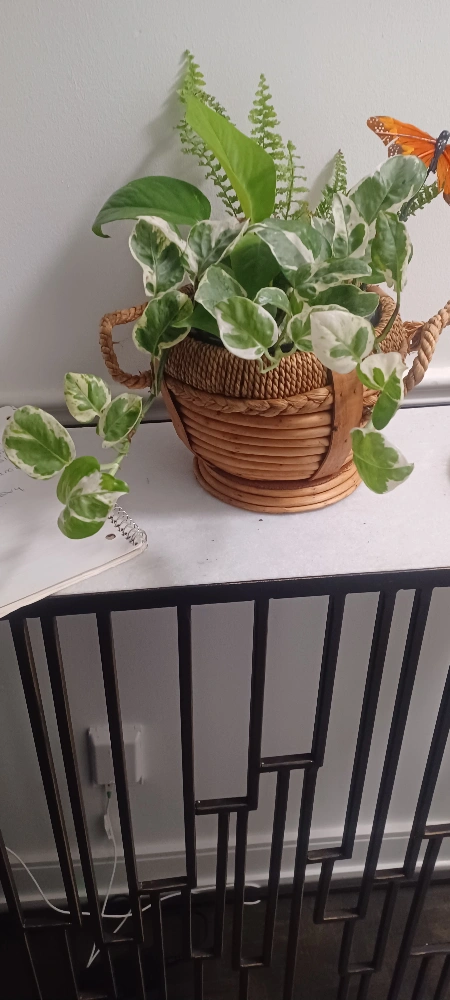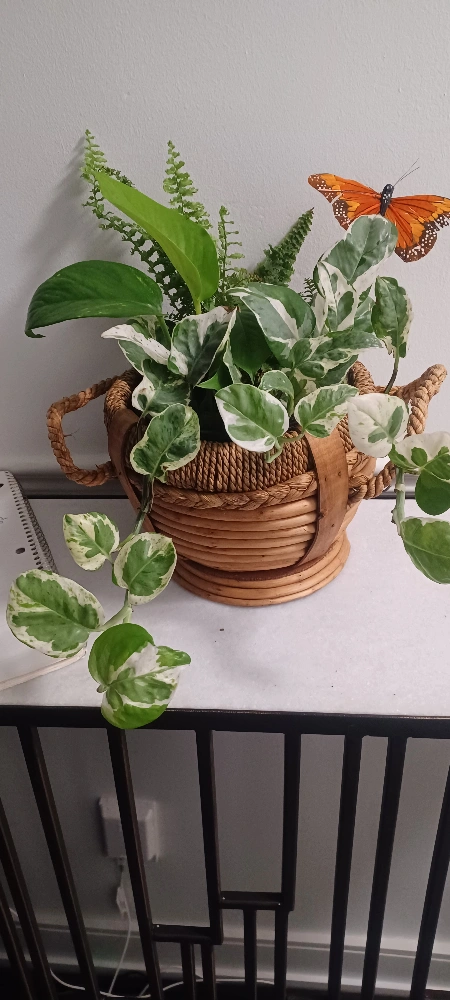 Selling an arrangement with Neon Pothos Pothos N' Joy Fluffy Ruffles Fern In a 6" pot placed in a woven basket for display. Gift wrapping is available if desired.