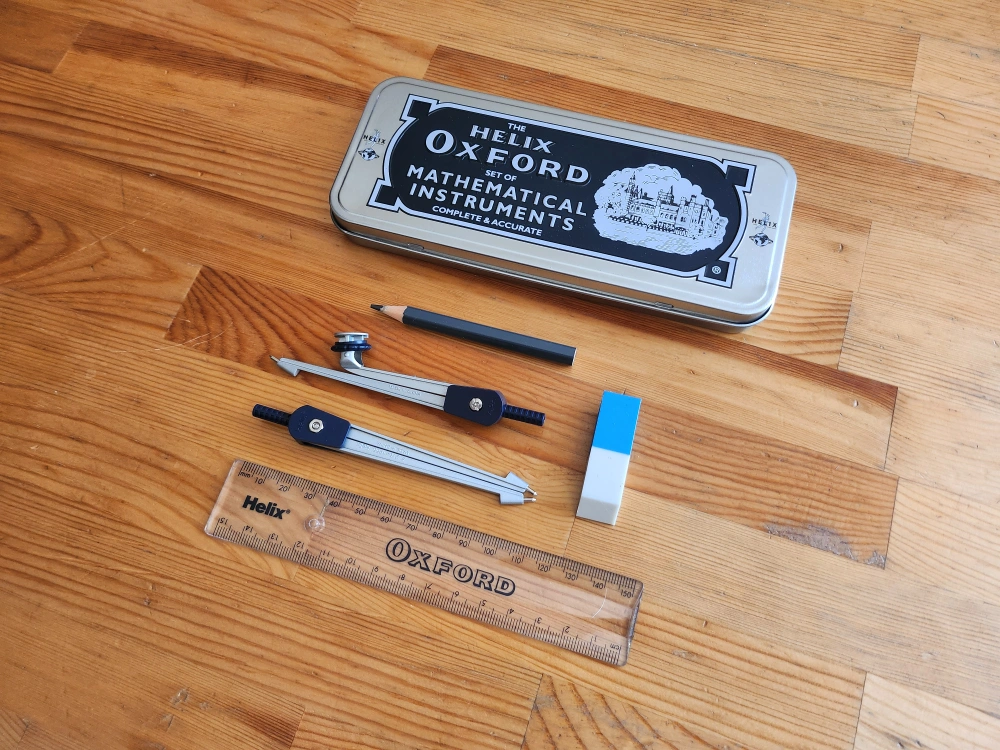Helix Oxford set of mathematical instruments! It includes a compass, pencil, eraser, and ruler, all neatly stored in a tin case. Perfect for students or anyone needing precise drawing tools.