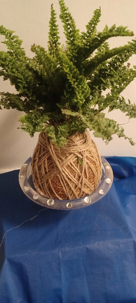 A lovely Kokedama Fluffy Ruffle fern. Perfect for adding a touch of green to your home! It's nestled in a moss ball wrapped with twine, sitting on a decorative glass plate. It makes a lovely gift for the office or dorm. Gift wrapping is available if desired.