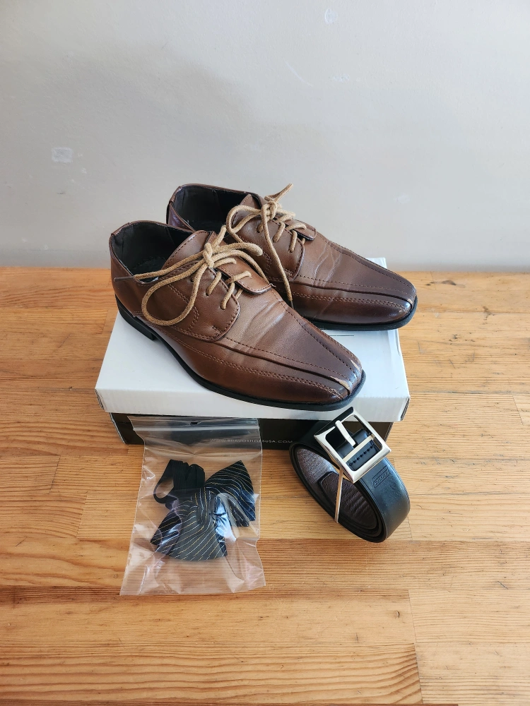 Includes brown dress shoes (Size:12K/18cm), a Dickies belt (Size XS/19"-21"), and a bow tie. The shoes come with their original box. The belt is black with a silver buckle. This set is perfect for a formal event or special occasion! 1. Brown dress shoes ($15) 2. Dickies belt ($8) 3. Bow-tie ($4) ($20 for all)