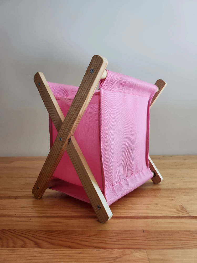 Pink folding storage basket is perfect for storing small items. Made with a light wood frame and durable pink fabric. It folds up easily for storage or transport.