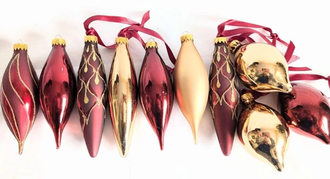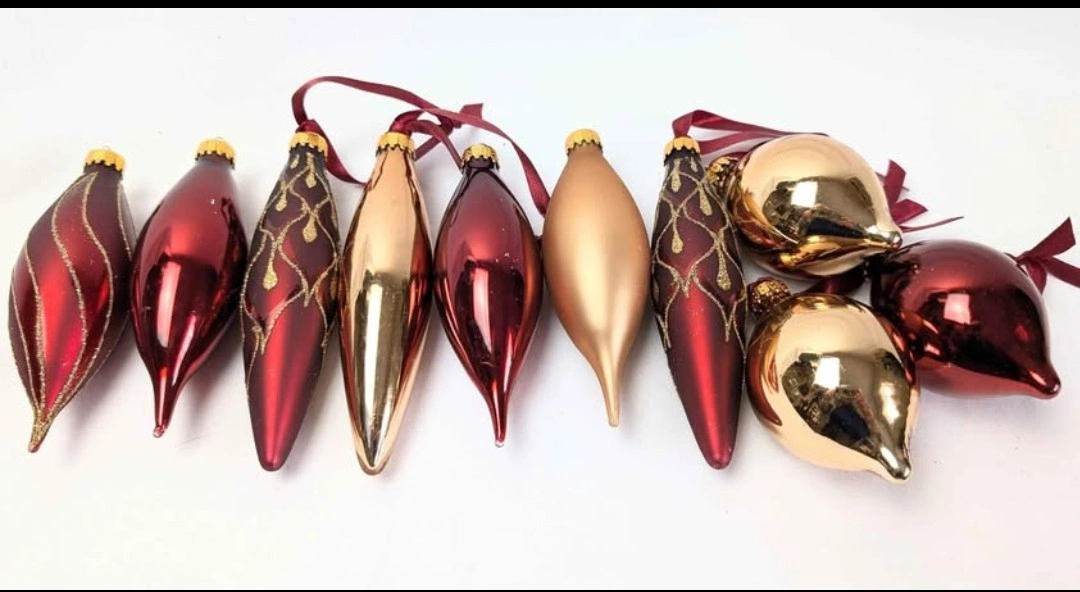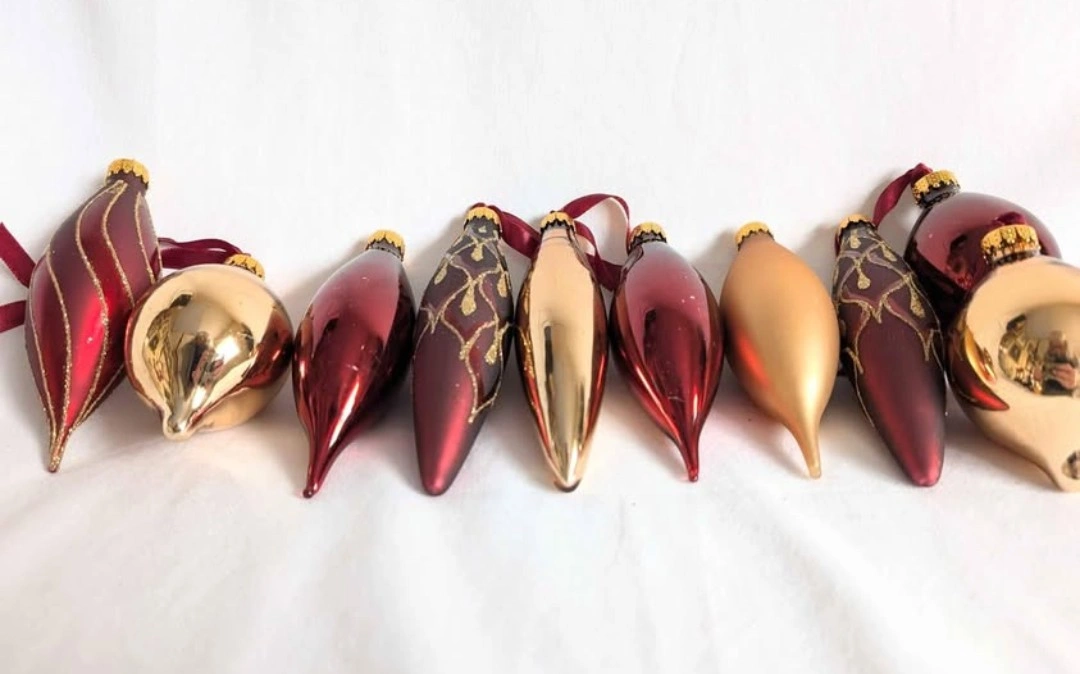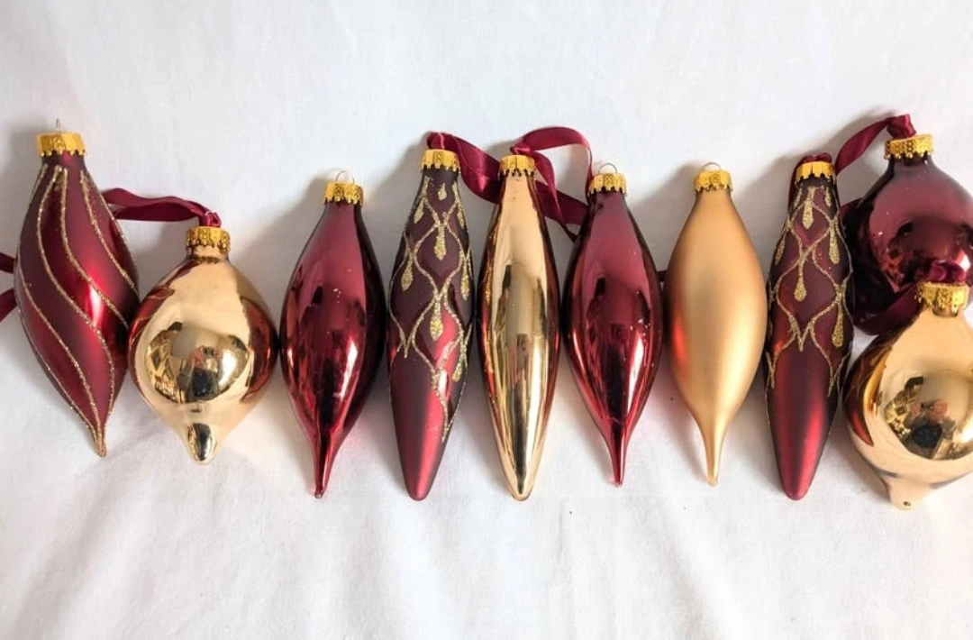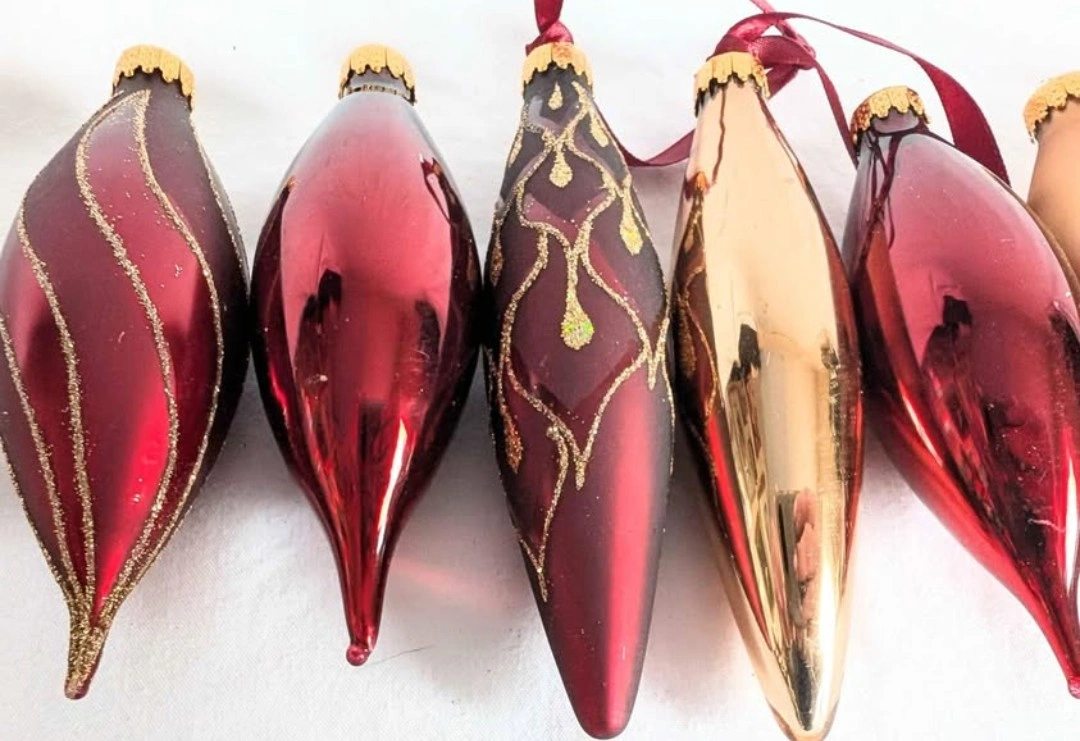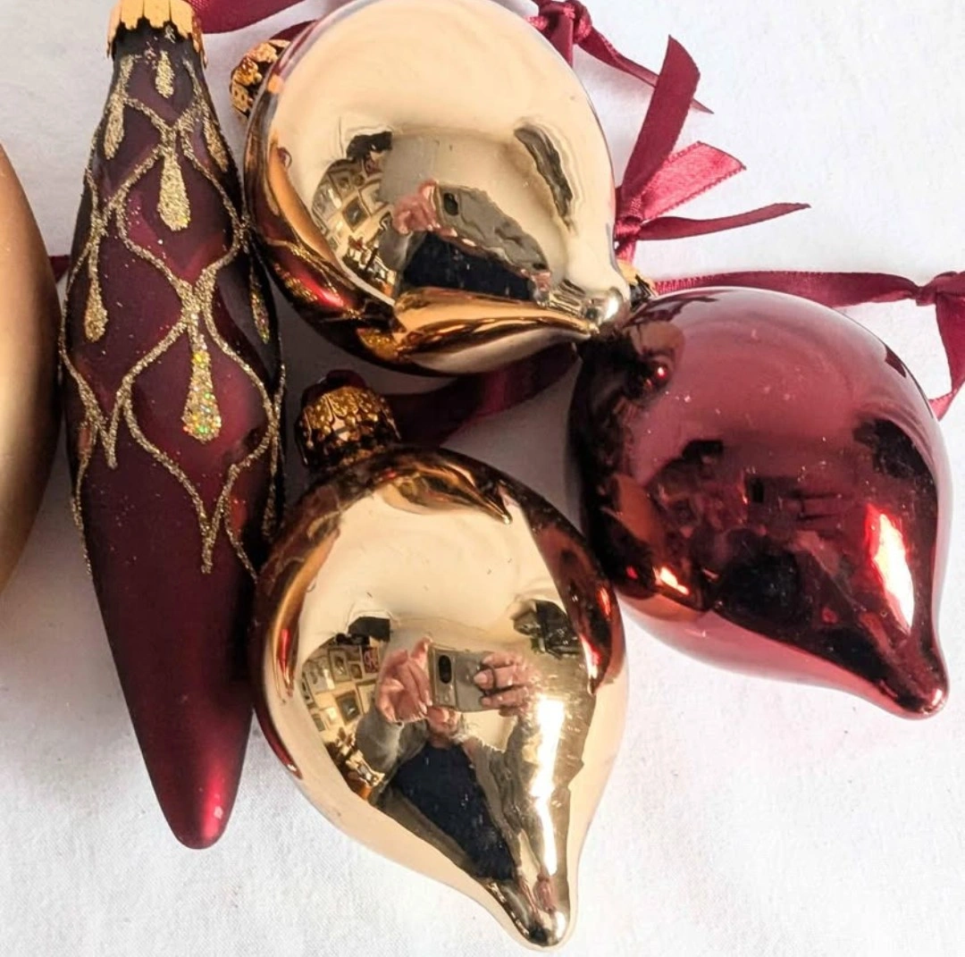 Gorgeous set of glass teardrop ornaments. Gold & Burgundy. All are various shapes, sizes, or styles. Very good condition. Extremely minor surface abrasions on solid coloured burgundy. π PICK UP TOWNLINE HWY 2 AREA π CASH only please π