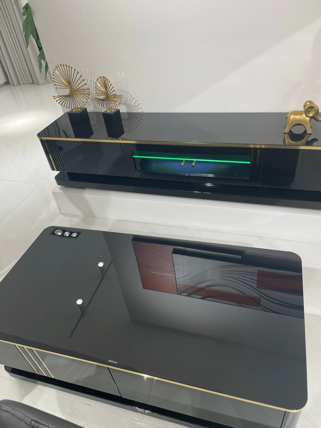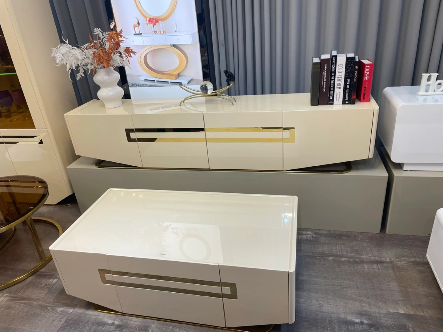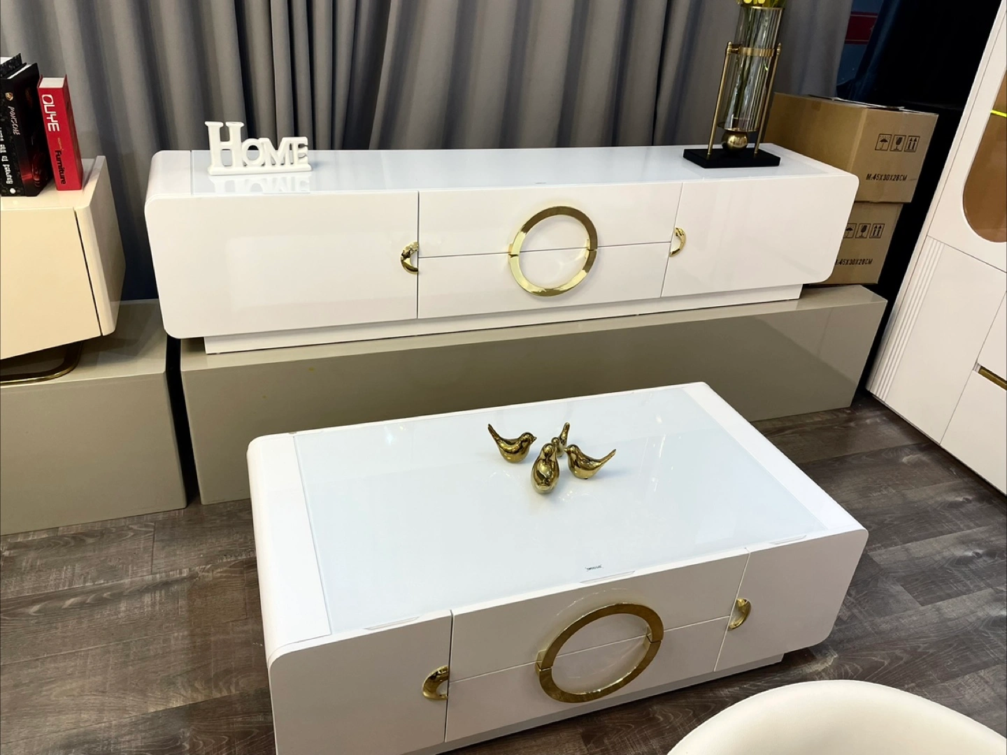 Selling a stylish coffee table and TV stand set in a modern design. The set features a sleek white finish with gold accents, making it a chic addition to any living room. Perfect for adding a touch of elegance to your home decor!