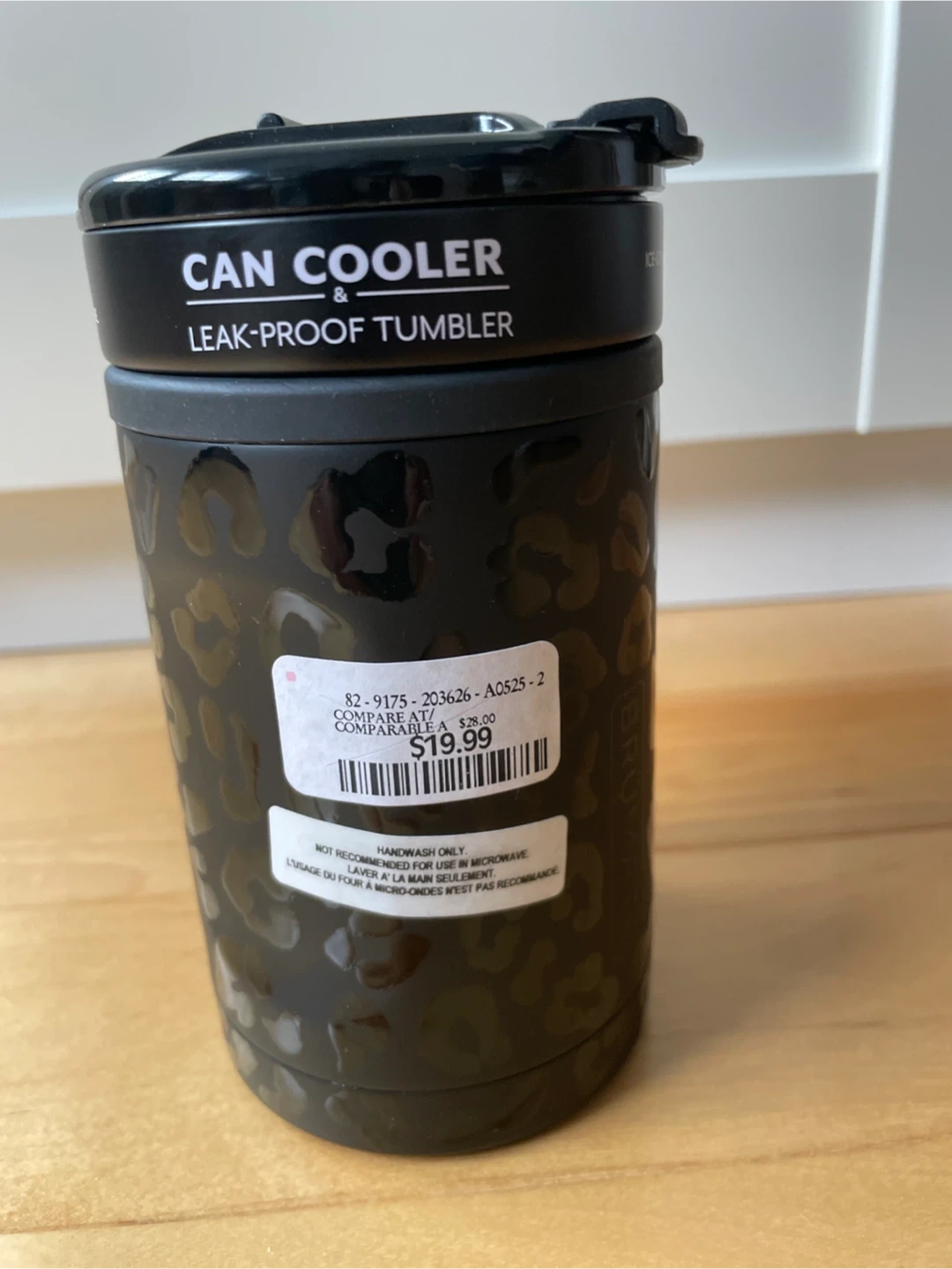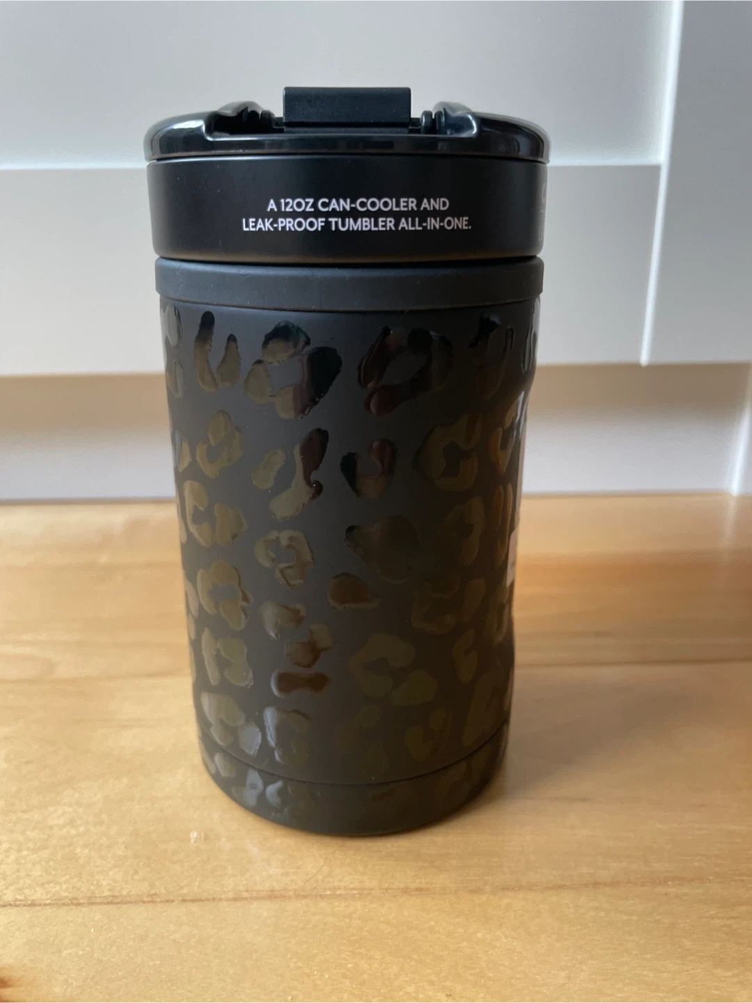 Keep your drinks cool with this BrüMate can cooler and leak-proof tumbler! It's a 12oz can-cooler and tumbler all-in-one. It features a stylish black leopard design. Originally bought for $19.99.