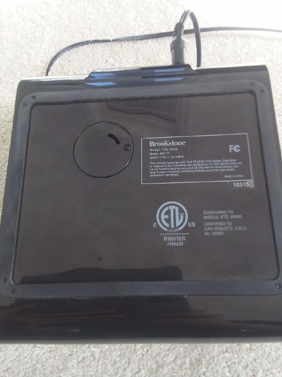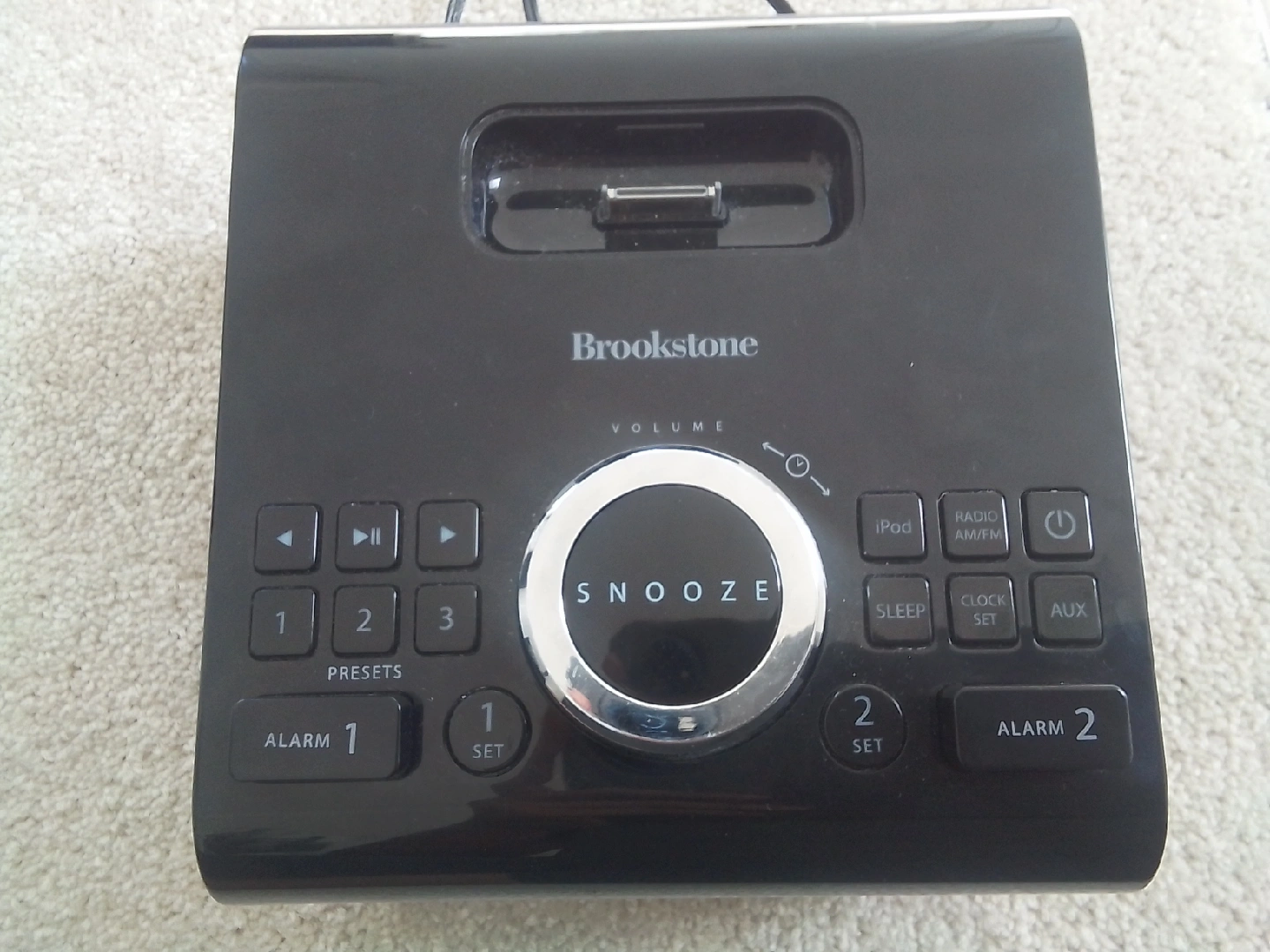 Selling a Brookstone alarm clock radio with an iPod dock! It's in great condition and features preset buttons, snooze, sleep, and aux options. Model number is 647151.