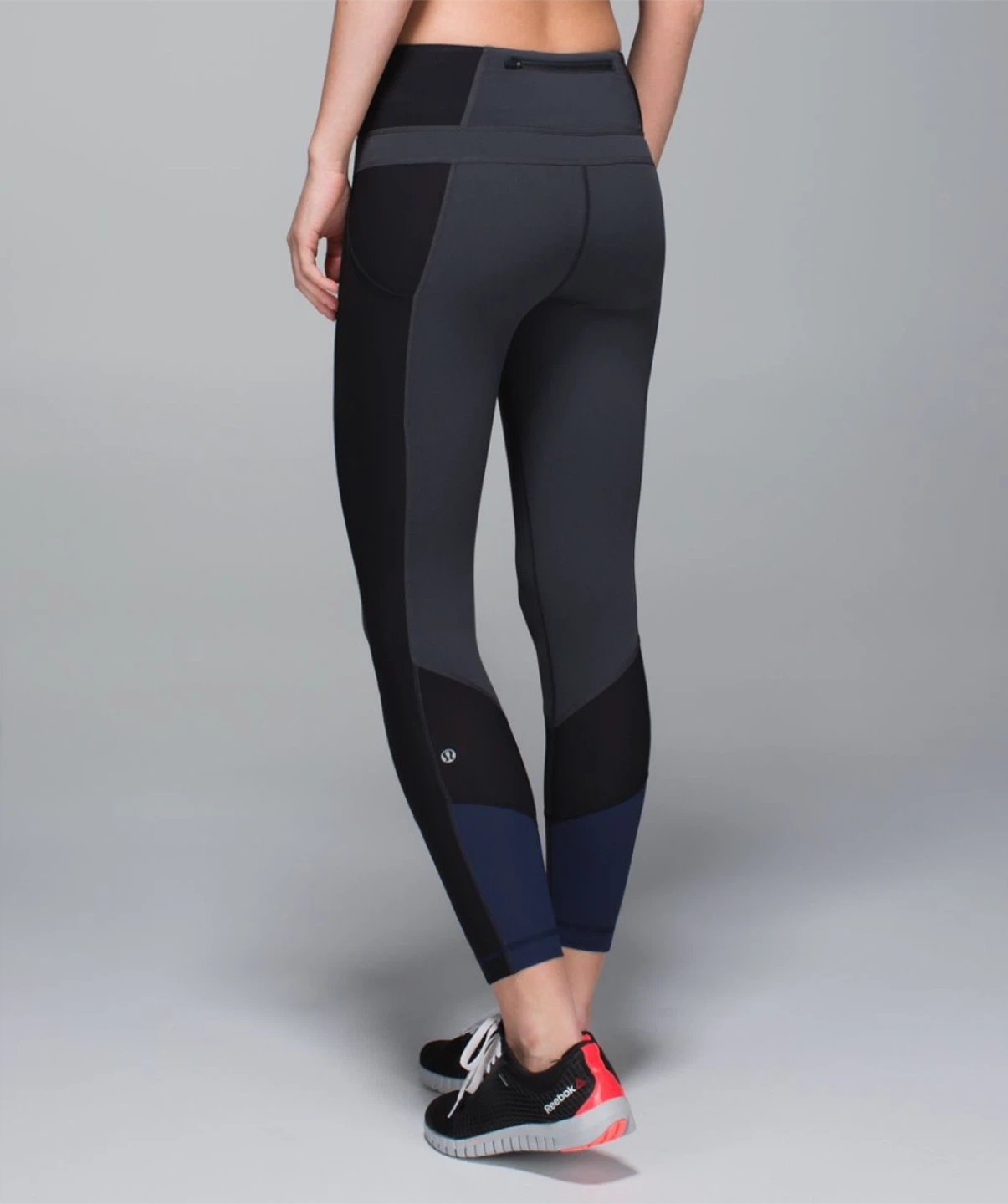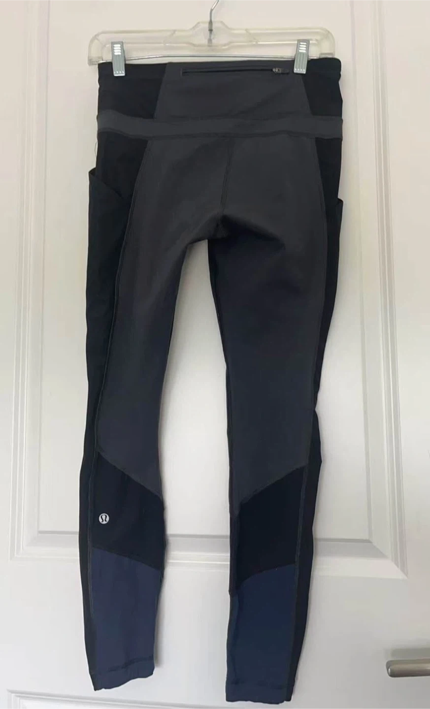Selling a pair of Lululemon running leggings in a stylish black and navy colour block design. These leggings are perfect for running or other workouts. They feature a convenient back zipper pocket and side pockets for your essentials. The Lululemon logo is visible on the leg.