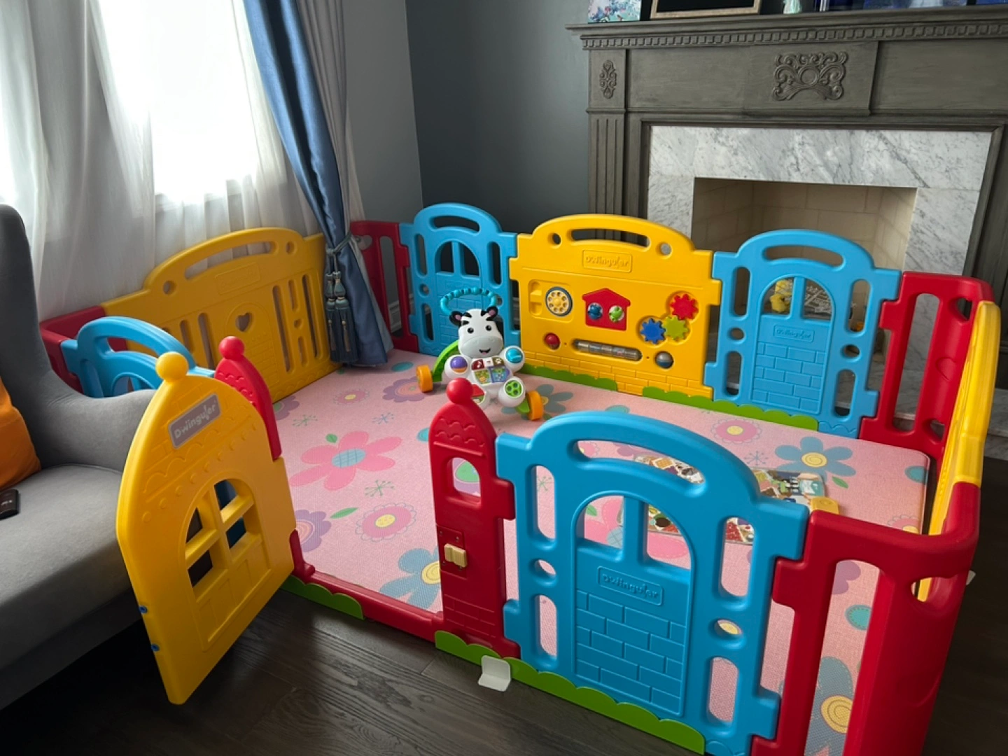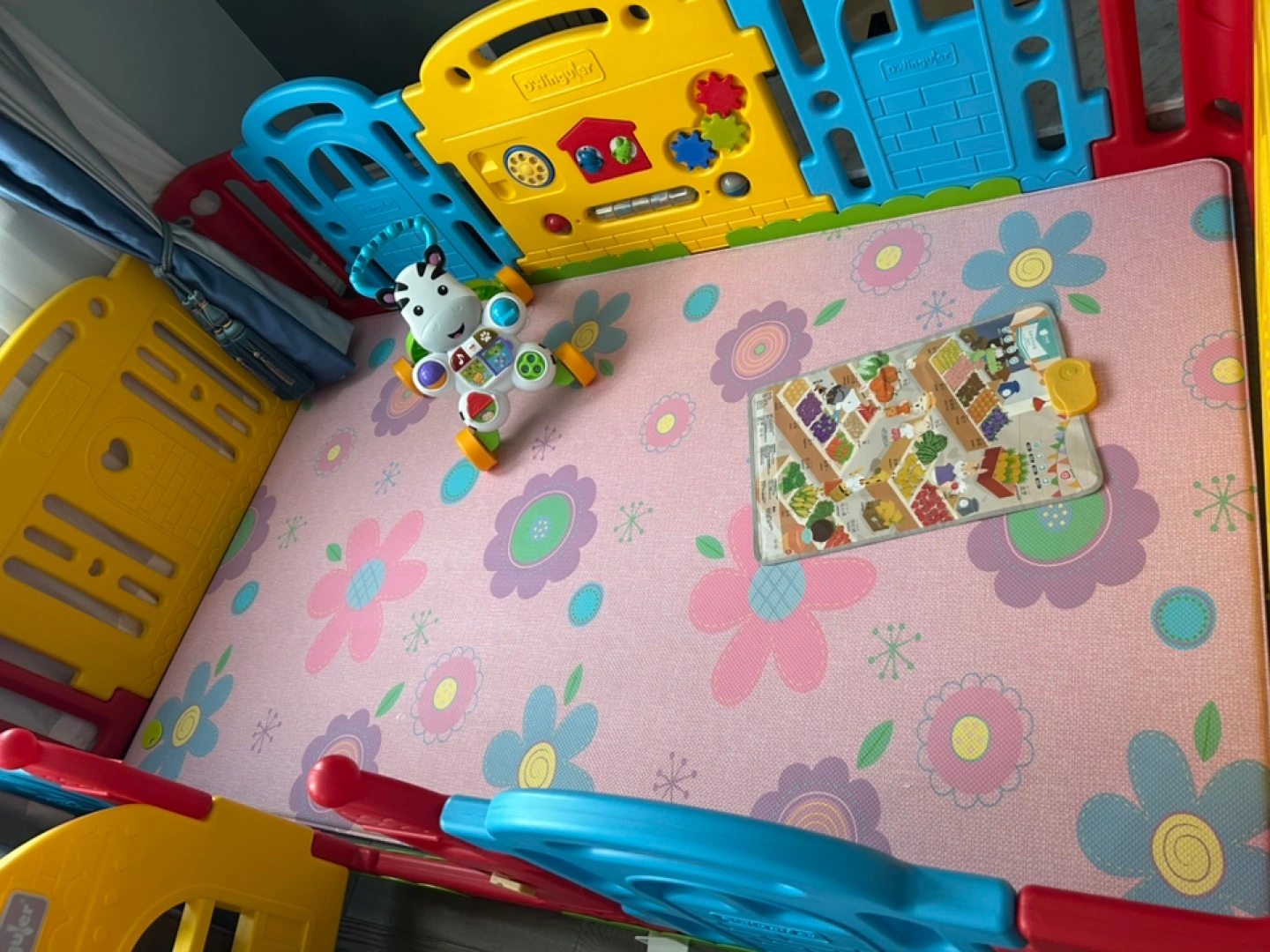 Selling a Dwinguler playpen and Dwinguler play mat in good condition! This playpen is perfect for keeping your little one safe and entertained. It features colourful panels and a soft mat for comfortable play. It's easy to assemble and disassemble for storage or transport. Perfect for ages 0-3!