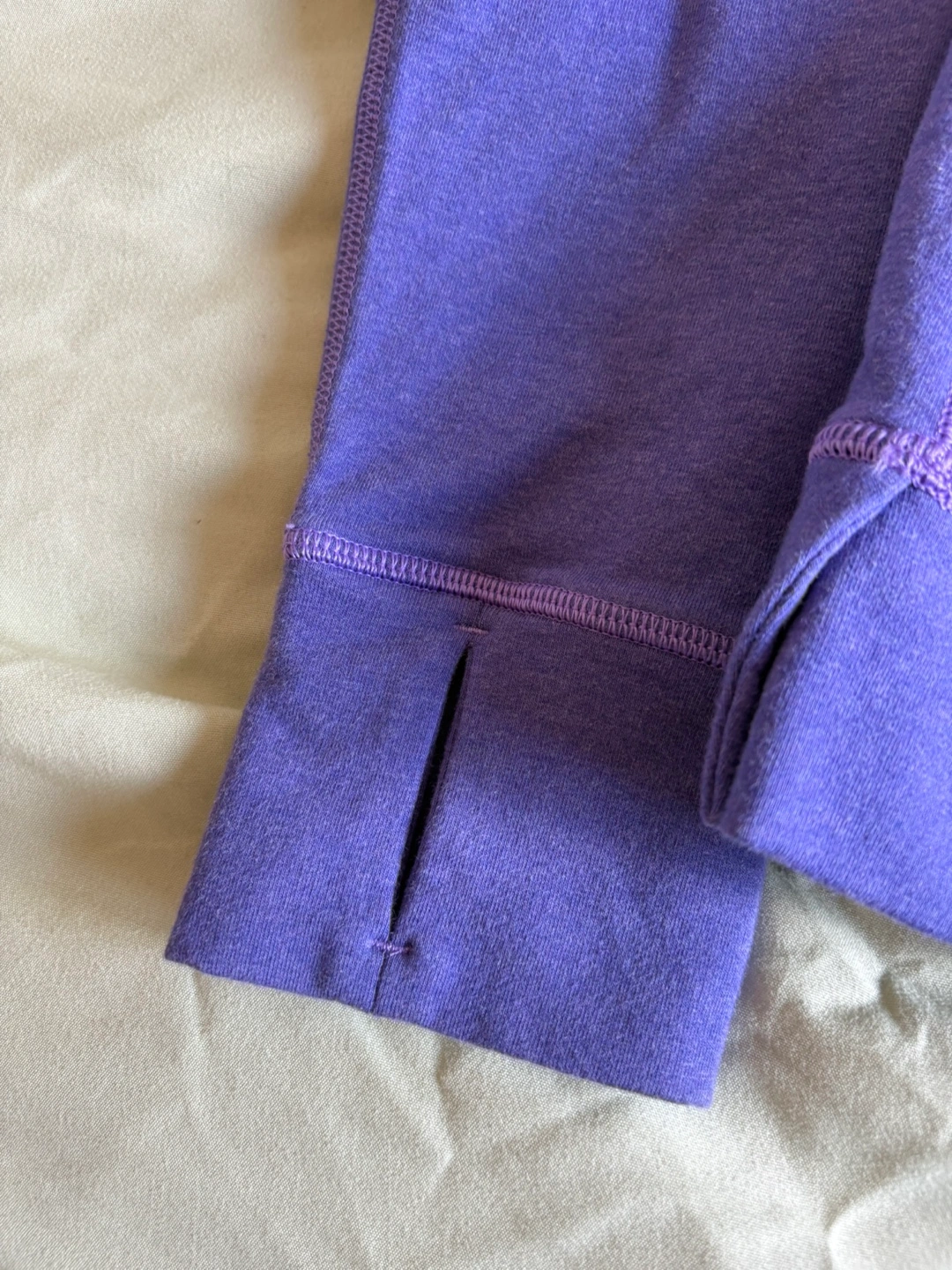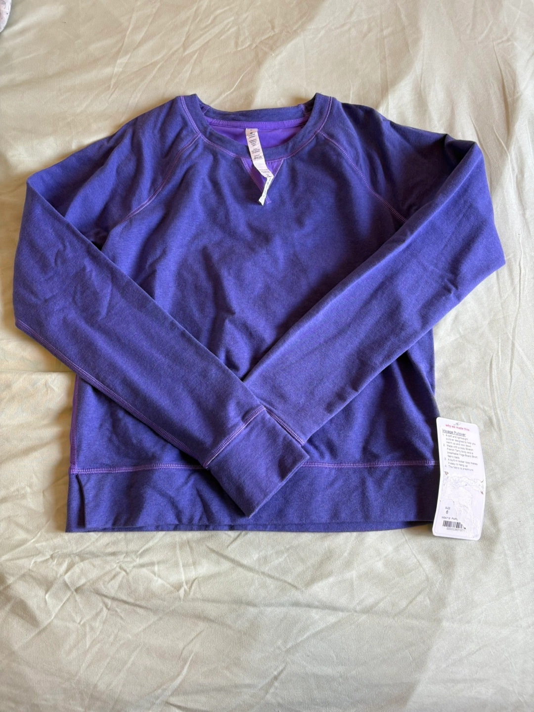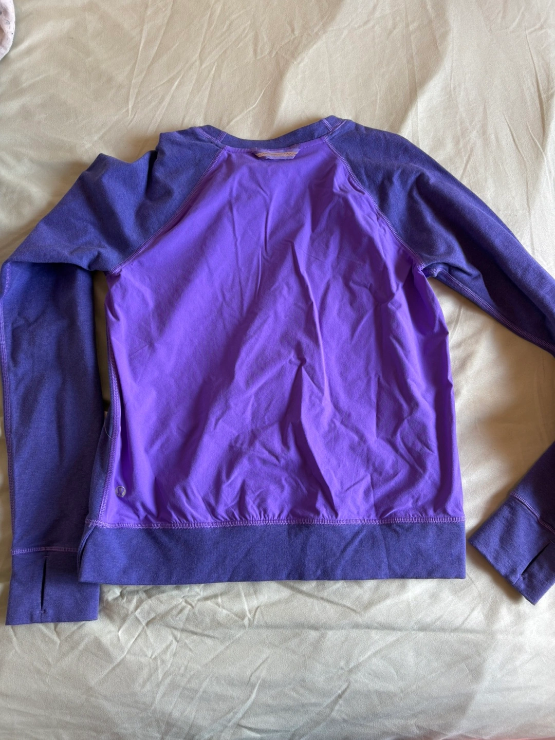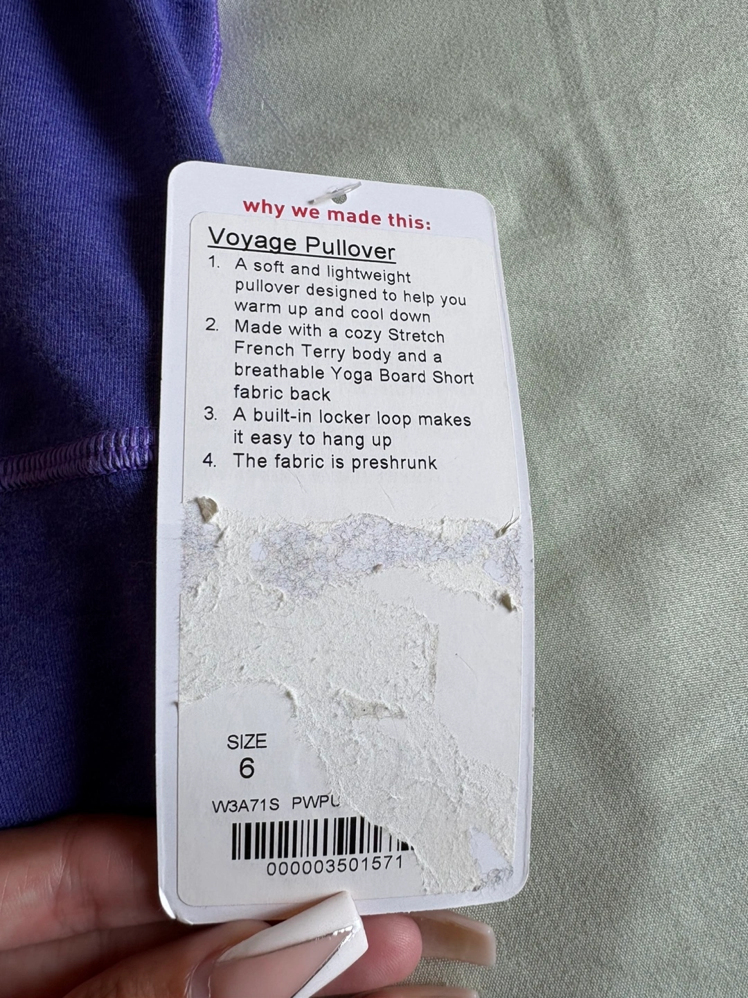 Selling a Lululemon Voyage Pullover in size 6! It's a soft and lightweight pullover designed to help you warm up and cool down. Made with a cozy Stretch French Terry body and a breathable Yoga Board Short fabric back. It also has a built-in locker loop that makes it easy to hang up, and the fabric is preshrunk.