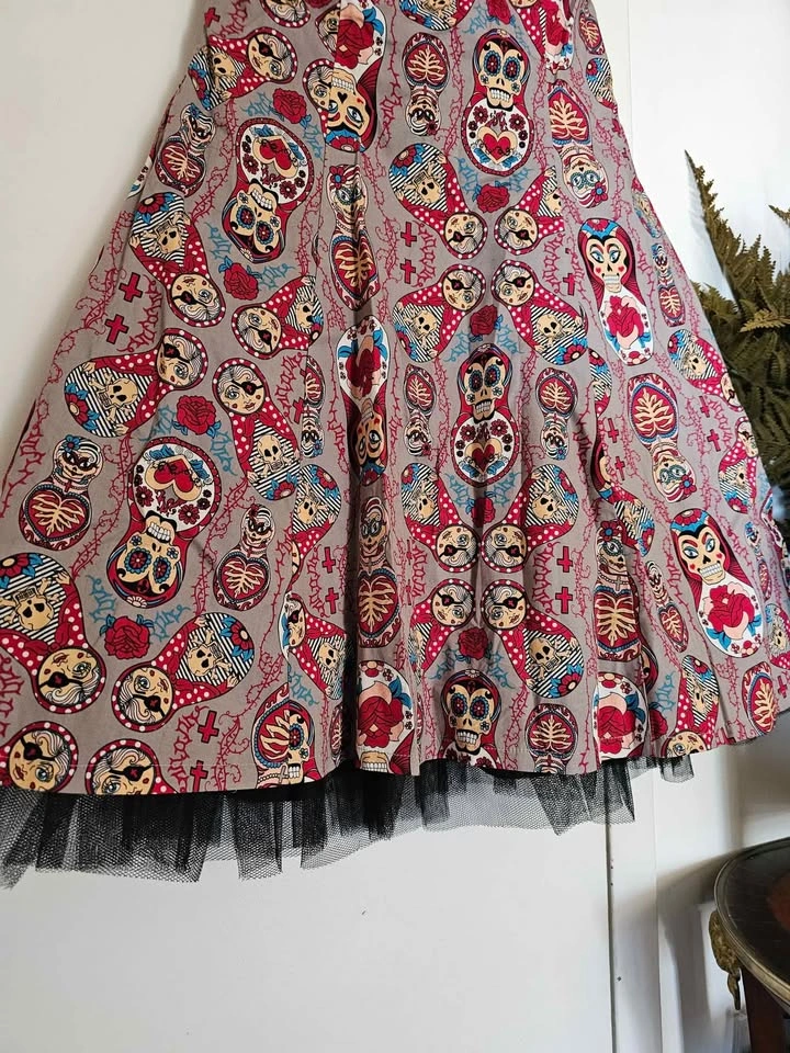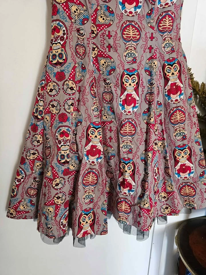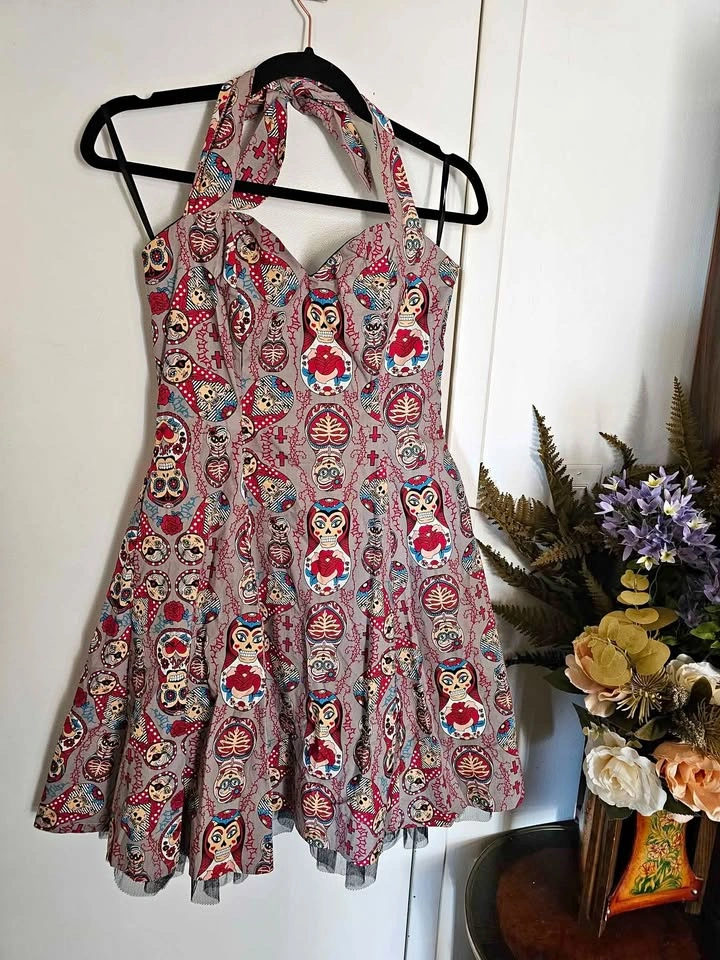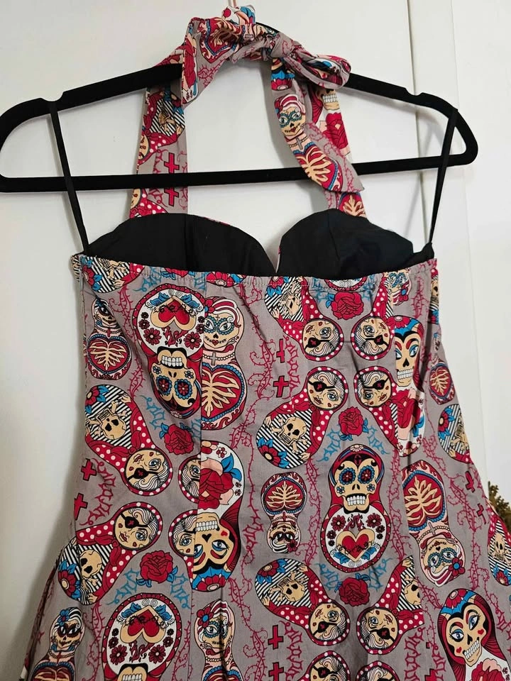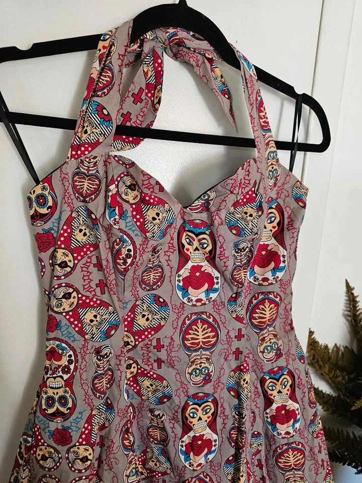 Unique and fun retro pinup style fit and flare halter dress, in a bright pattern of spooky traditional tattoo style matryoshka dolls, with crosses and thorny brambles, on a light grey background. Dolls are printed in red, blue, white and black. Dress ties at the neck and has a sweetheart neckline. It has side pockets and closes with a hidden side zipper. Dress is fully lined and has a built-in tulle crinoline/ petticoat for extra volume in the skirt. Dress is in like new condition, I purchased it new and only tried it on. No materials tag but both outer and lining material feels like 100% cotton. Size Small, made by Banned Apparel. Pit to pit measures about 16", waist measures about 14.25", and total length from pit to bottom hem measures about 29.5".