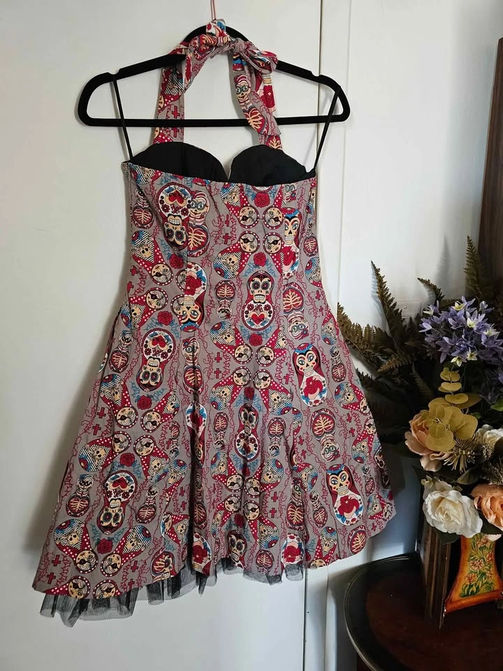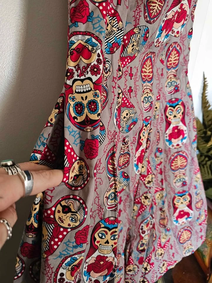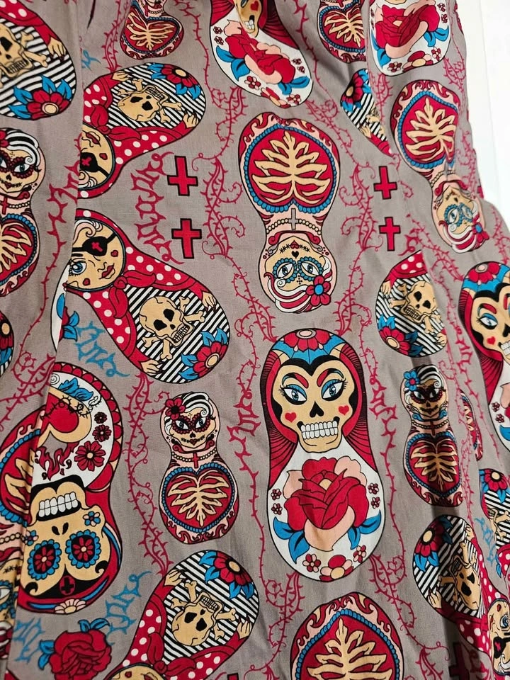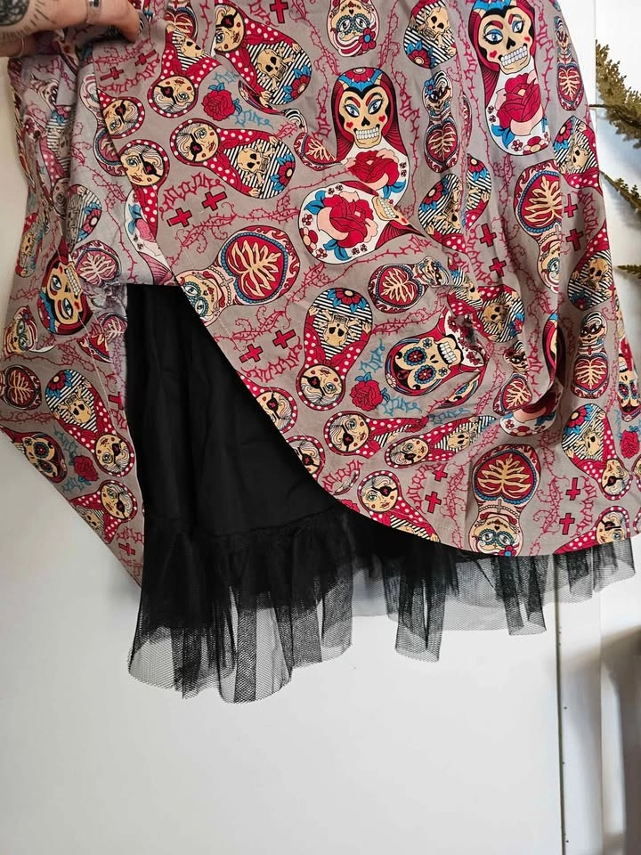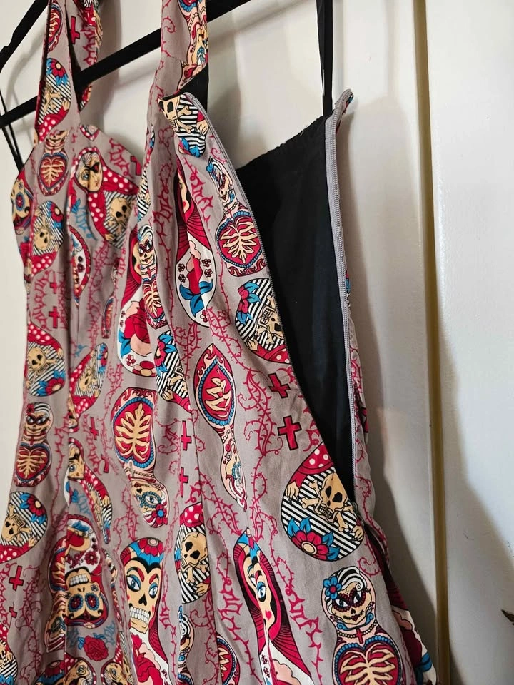 Unique and fun retro pinup style fit and flare halter dress, in a bright pattern of spooky traditional tattoo style matryoshka dolls, with crosses and thorny brambles, on a light grey background. Dolls are printed in red, blue, white and black. Dress ties at the neck and has a sweetheart neckline. It has side pockets and closes with a hidden side zipper. Dress is fully lined and has a built-in tulle crinoline/ petticoat for extra volume in the skirt. Dress is in like new condition, I purchased it new and only tried it on. No materials tag but both outer and lining material feels like 100% cotton. Size Small, made by Banned Apparel. Pit to pit measures about 16", waist measures about 14.25", and total length from pit to bottom hem measures about 29.5".