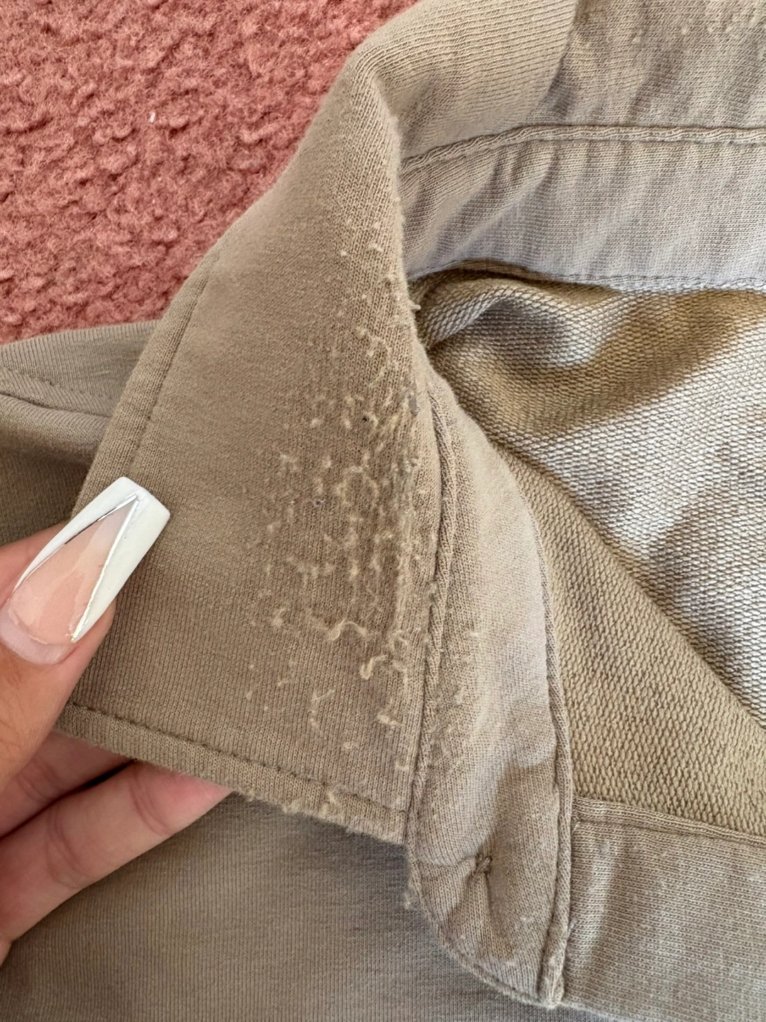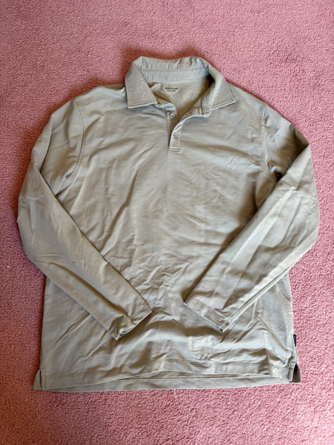 Selling a Haggar long sleeve polo shirt in size Large. It's a light beige colour. There is some pilling on the collar, as shown in the pictures.