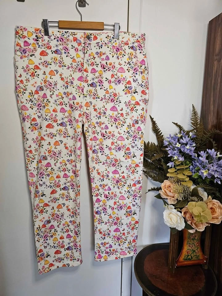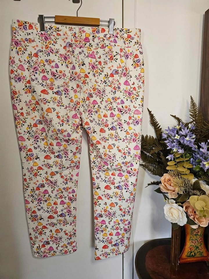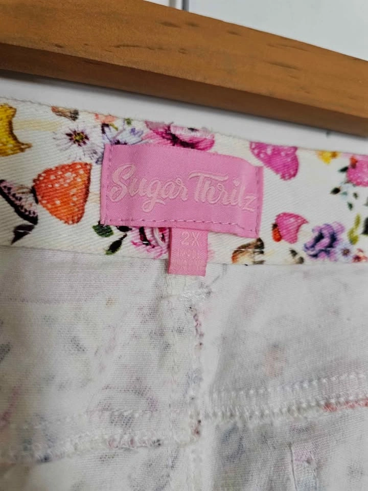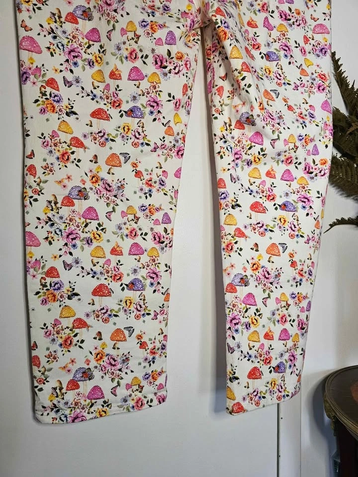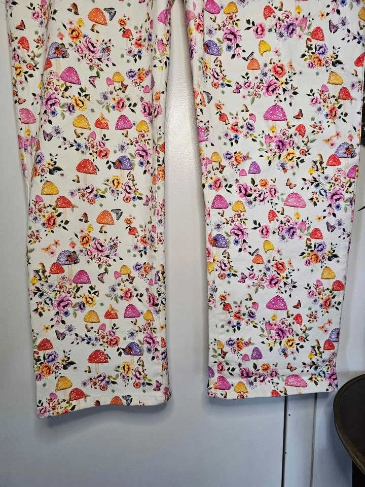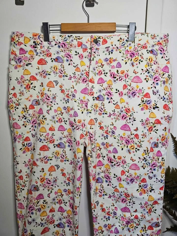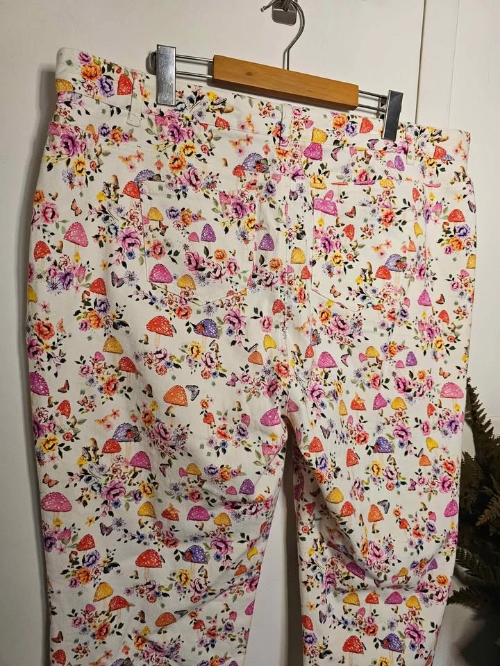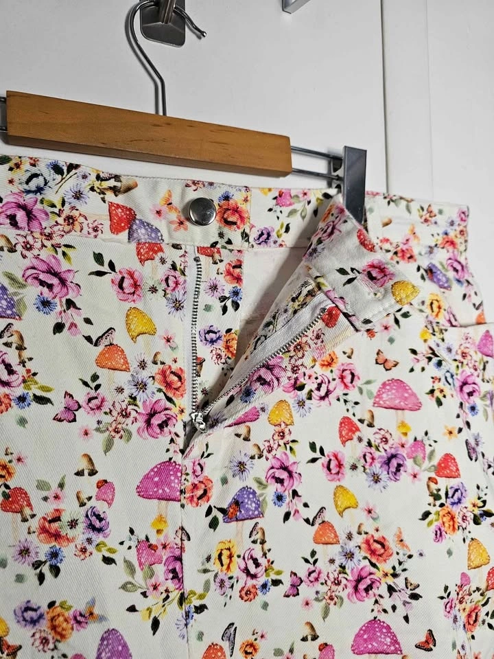 Vibrant and adorable plus size high waisted mom jeans with a colorful print of mushrooms, flowers, and butterflies on a white background, from Sugar Thrillz by Dolls Kill. Perfect for adding some whimsy to any outfit! Jeans are a stretchy cotton blend material. High rise fit and cropped ankle length, with a classic 5 pocket layout. Jeans are size 2X and in very good used condition. No stains or damage that I could find, just some light piling in the inner upper thigh area. Waist measures about 20.75" unstretched, front rise measures about 13.25", and inseam measures about 28". fairycore cottagecore goblincore whimsical spring summer vacation cruise
