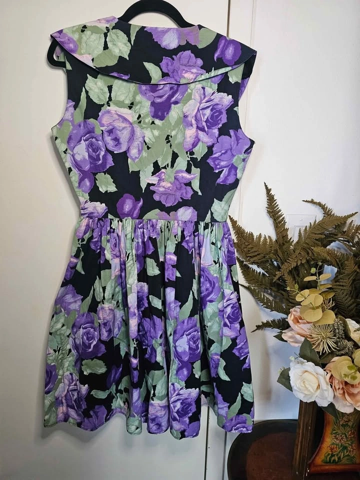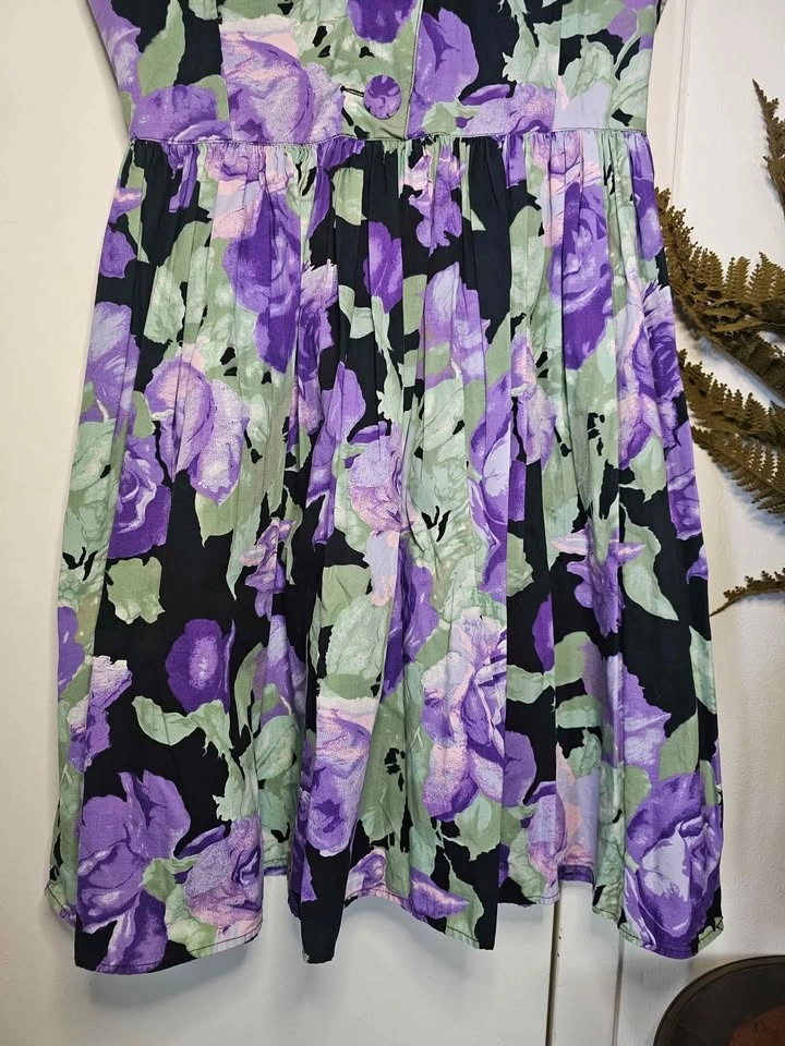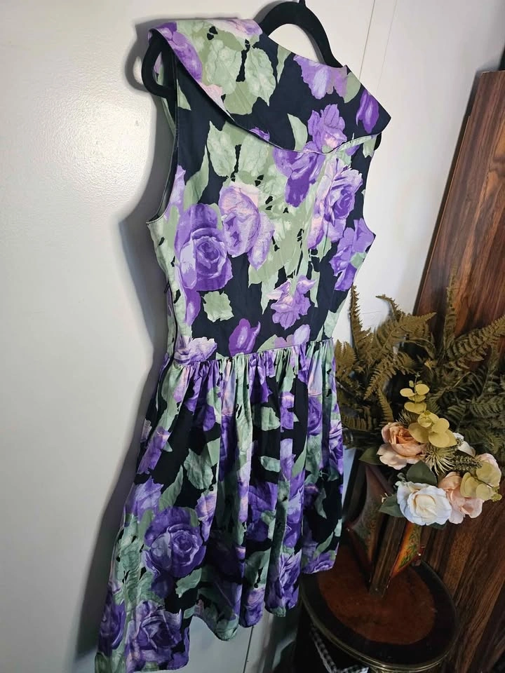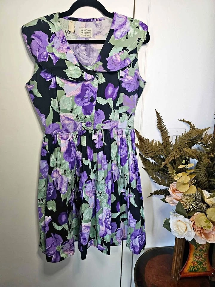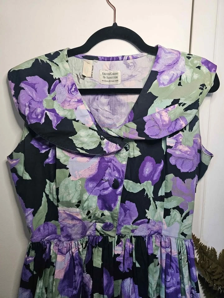Adorable true vintage sleeveless tea dress, looks like it popped right out of the 50s! This black dress has a cute purple and green rose flower print with pink and light blue accents. It has a retro wide rounded collar, and large fabric covered buttons down the front. Made by United Colors of Benetton, unsure of when but the tag definitely looks like vintage. Materials and size tag have faded beyond legibility but the fabric feels 100% cotton broadcloth. Dress closes with a hidden side zipper and the skirt is knee length or just above the knee, dependingon your height. Dress is in very good vintage condition. The colors have faded with time so they appear muted. No size tag, please check measurements carefully! It fits like a modern Medium based on measurements. Pit to pit measures about 19.5", waist measures about 14.5", and shoulder to bottom hem measures about 35.5". Material is non-stretch.