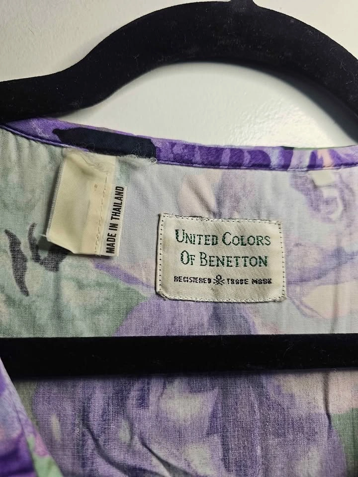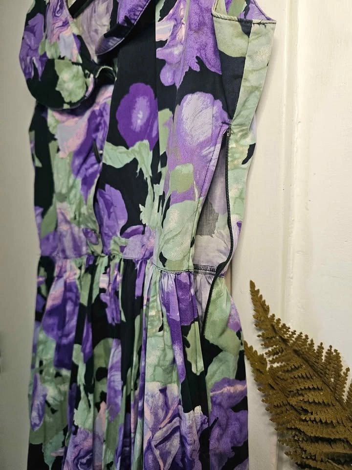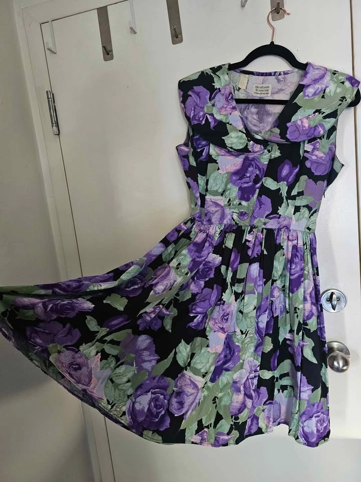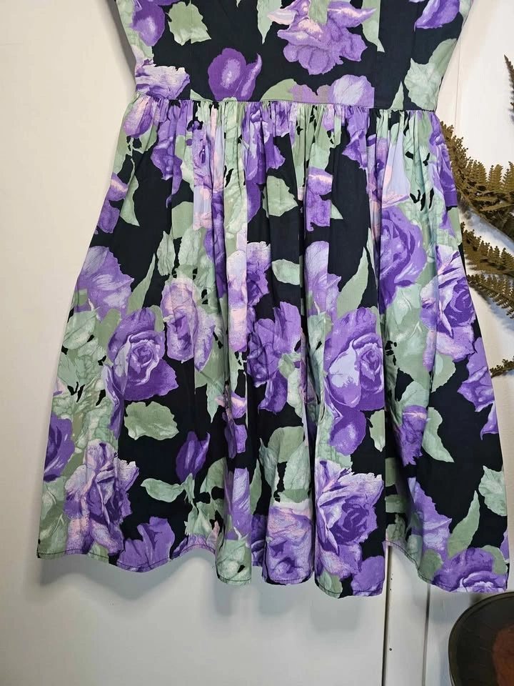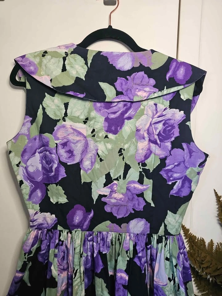 Adorable true vintage sleeveless tea dress, looks like it popped right out of the 50s! This black dress has a cute purple and green rose flower print with pink and light blue accents. It has a retro wide rounded collar, and large fabric covered buttons down the front. Made by United Colors of Benetton, unsure of when but the tag definitely looks like vintage. Materials and size tag have faded beyond legibility but the fabric feels 100% cotton broadcloth. Dress closes with a hidden side zipper and the skirt is knee length or just above the knee, dependingon your height. Dress is in very good vintage condition. The colors have faded with time so they appear muted. No size tag, please check measurements carefully! It fits like a modern Medium based on measurements. Pit to pit measures about 19.5", waist measures about 14.5", and shoulder to bottom hem measures about 35.5". Material is non-stretch.