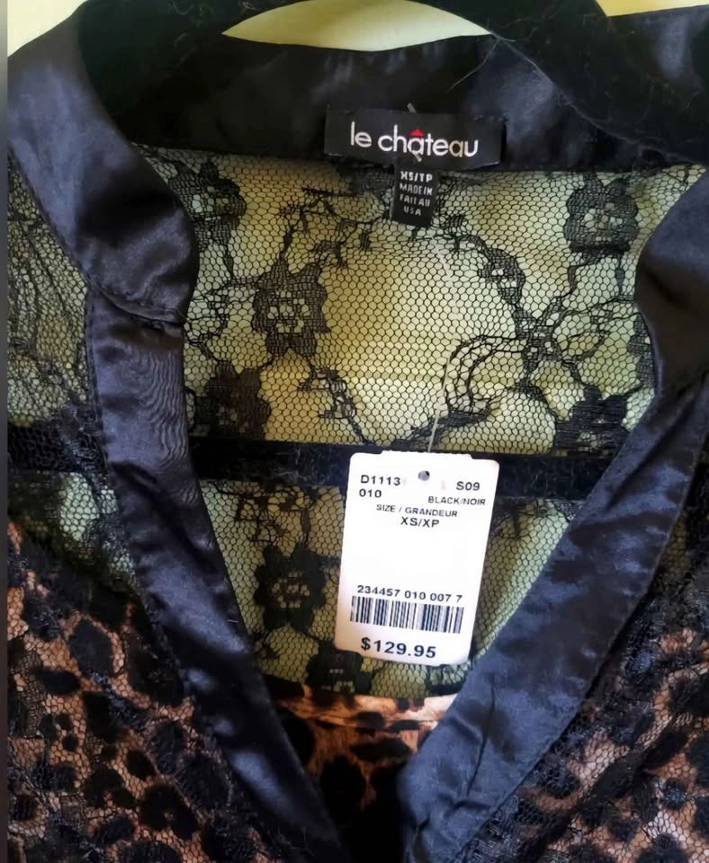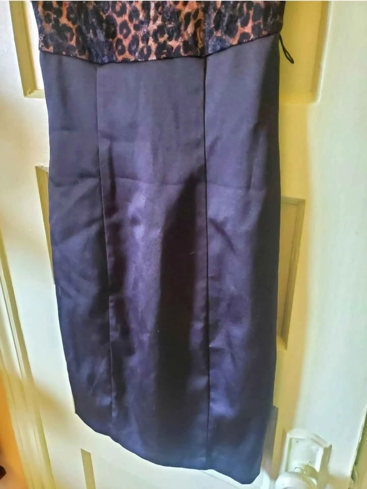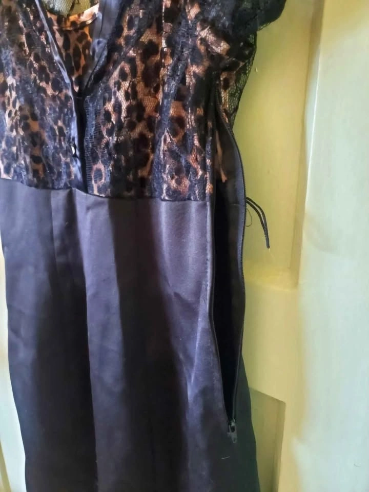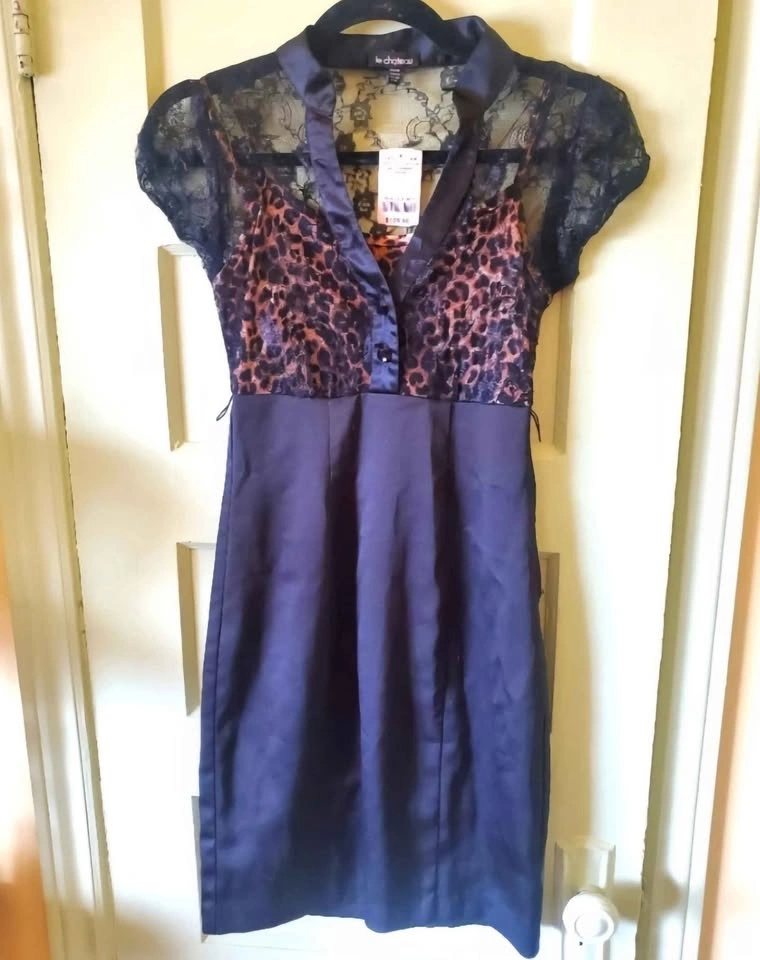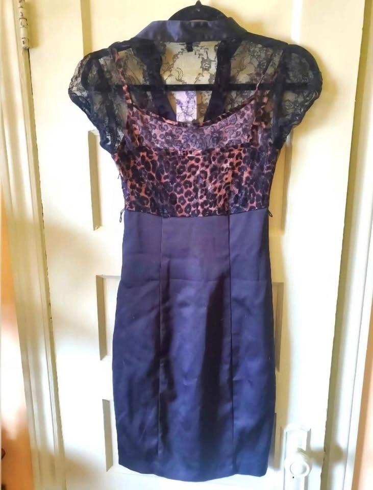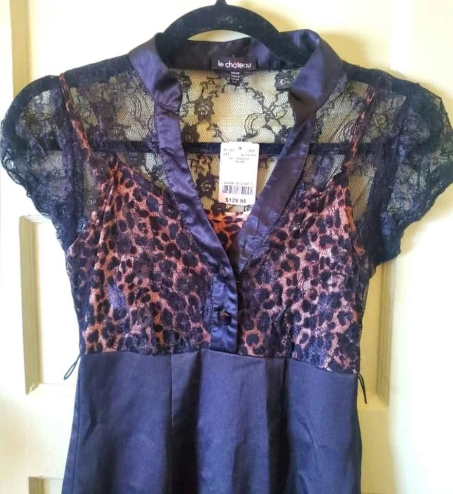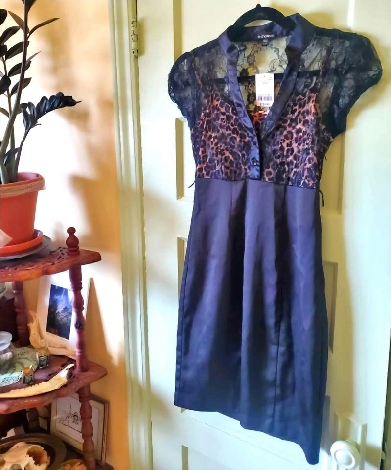 Retro Y2K pinup inspired office dress from Le Chateau. Top has a satin feel leopard print built-in cami and a lace overlay with cute little cap sleeves and sparkly buttons. Skirt section is pencil fit and hits just above the knee. A classic layered look with no need to fuss with tucking shirts into a skirt and having them get bunched up. Side zipper closure. Pit to pit is about 15.5", waist is 13", and shoulder to bottom hem is about 35". Dress is NWT but missing the original belt, can be worn with any narrow waist belt or you could cut the belt loops off if you prefer.