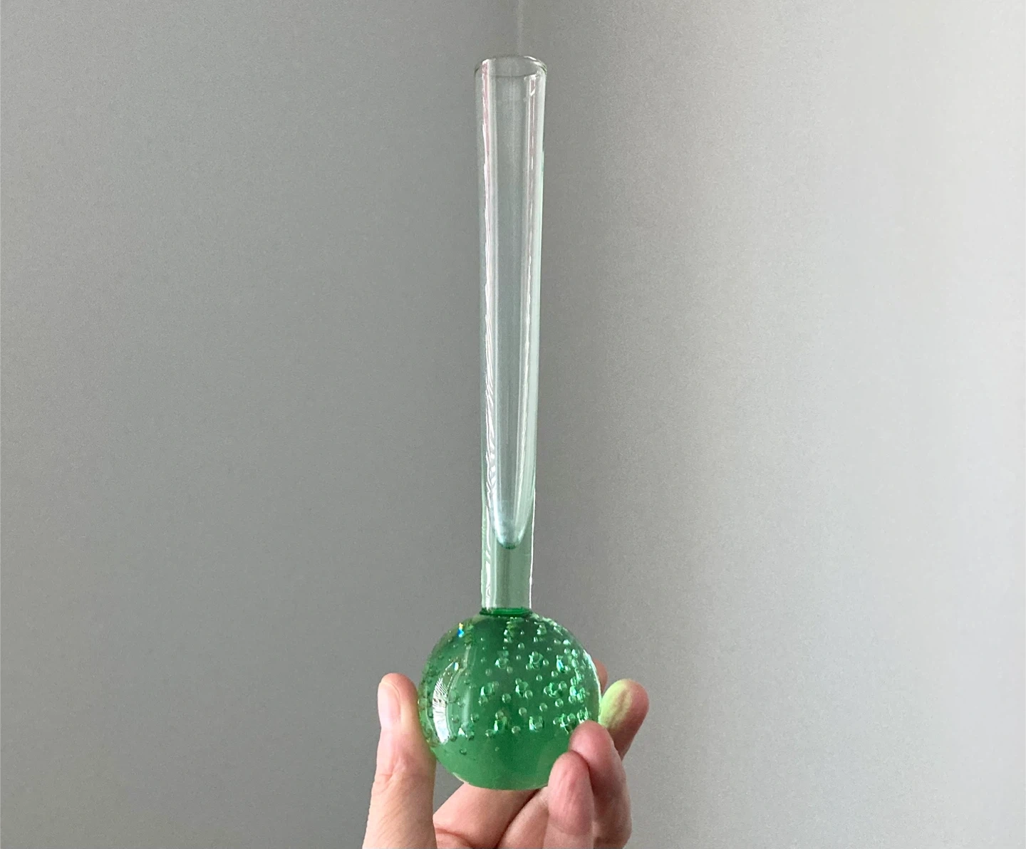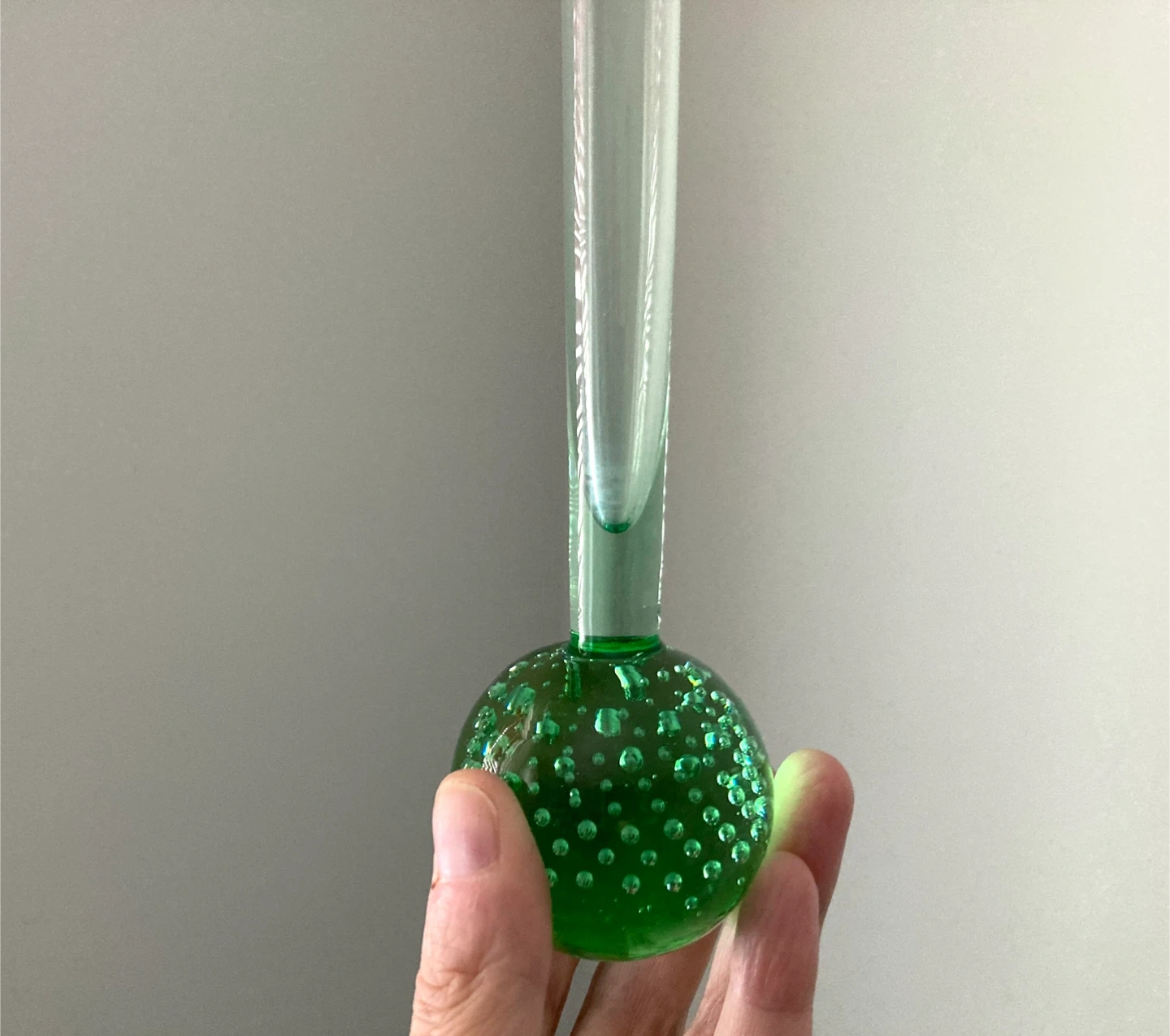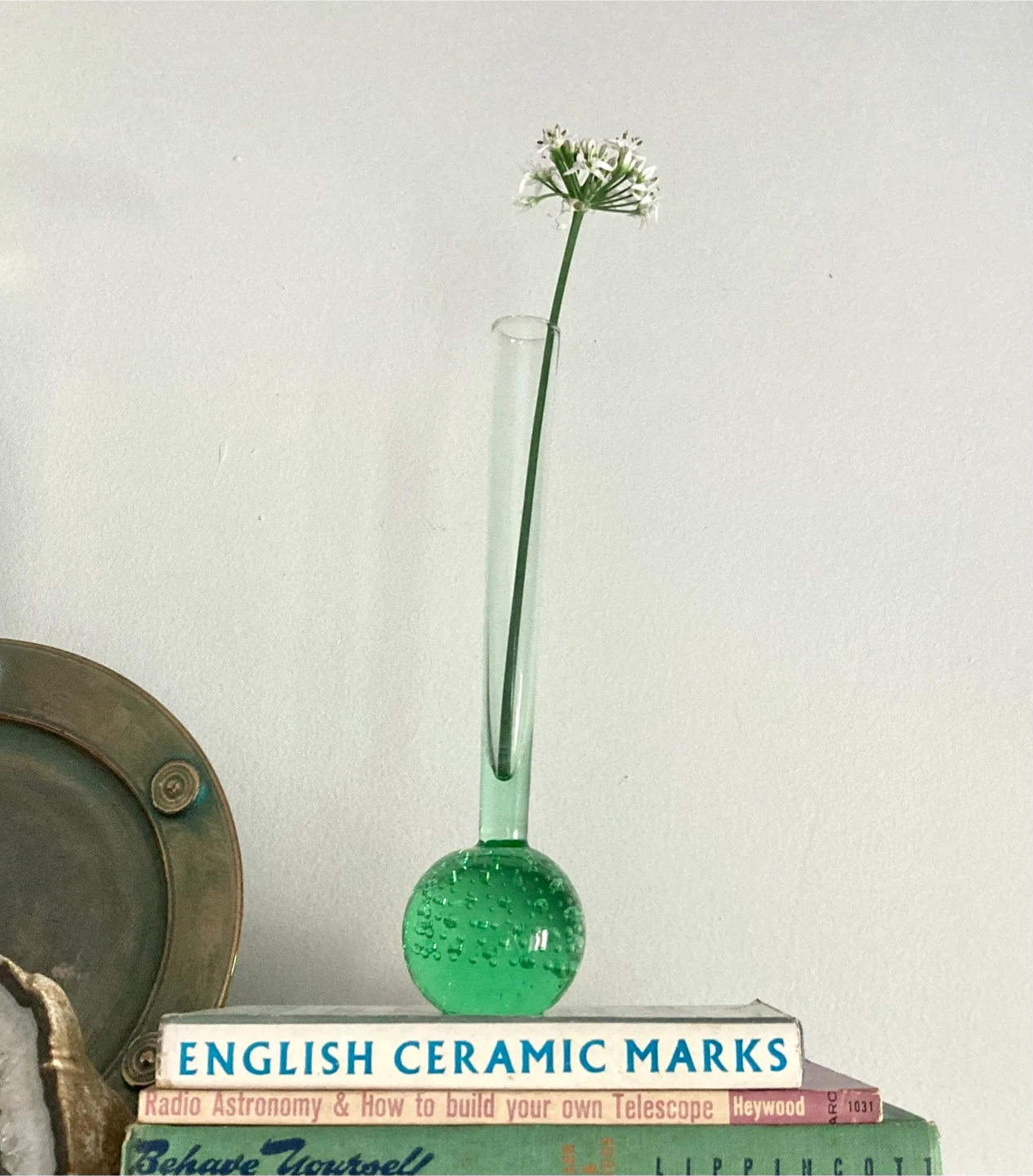 Gorgeous teal controlled bubble bud vase, likely from the 1960s. Sadly, there are some water mineral deposits at the very bottom of the vase that I haven’t been able to remove, but they are not noticeable when holding a bud or water. About 8 1/2 inches tall. Priced accordingly. Pick up in the Ossington and Davenport area.