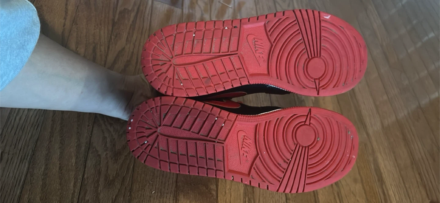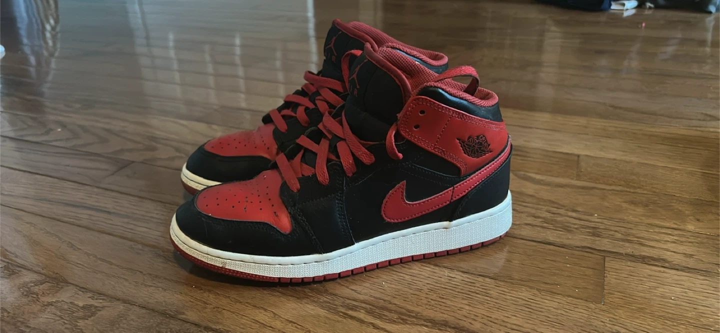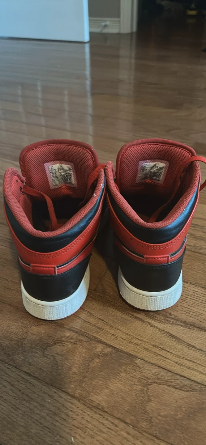 Selling a pair of Nike Air Jordan 1 High in red and black. They are in used condition, as shown in the pictures. Great for casual wear or as a collector's item! Size 6y