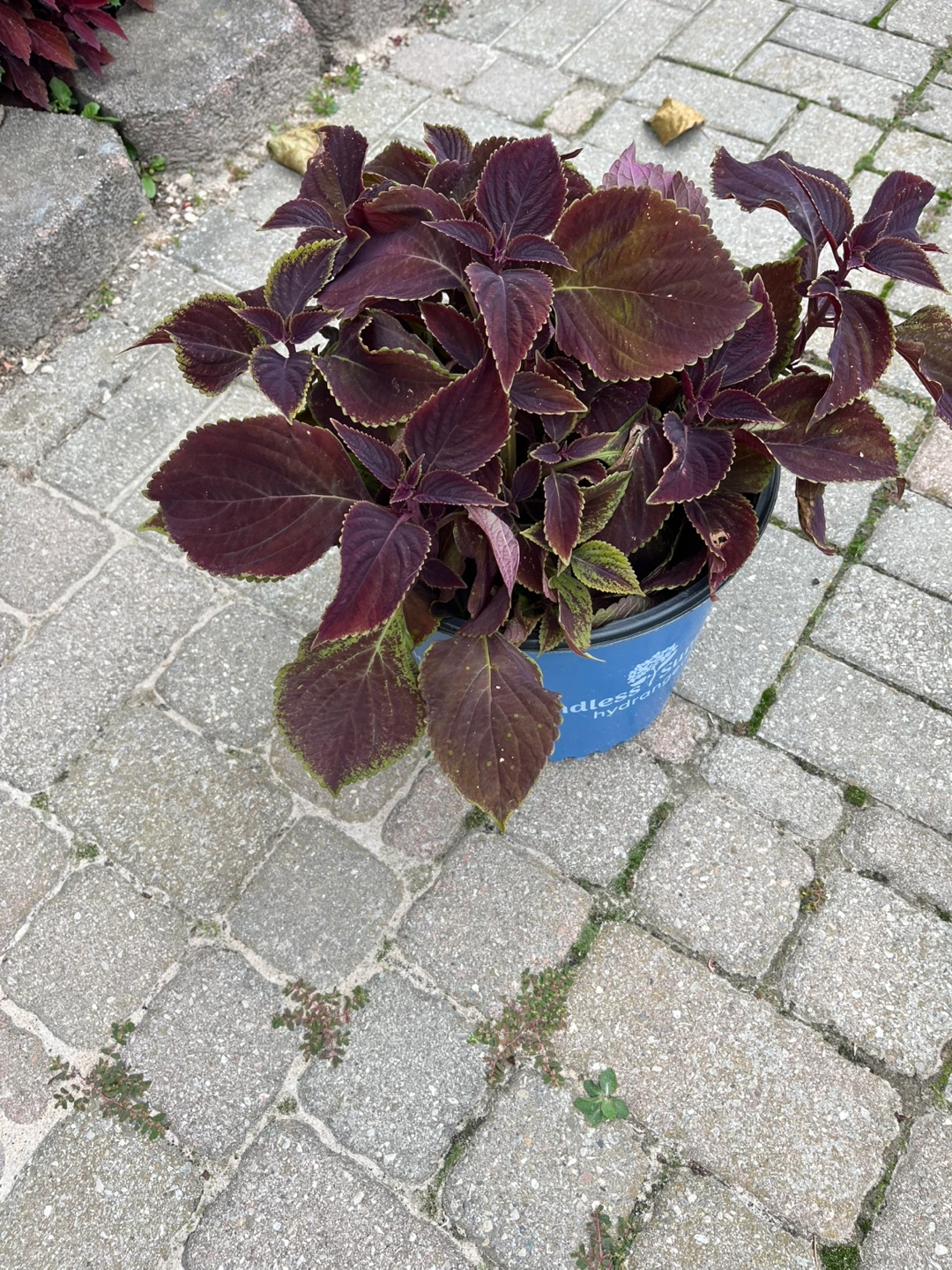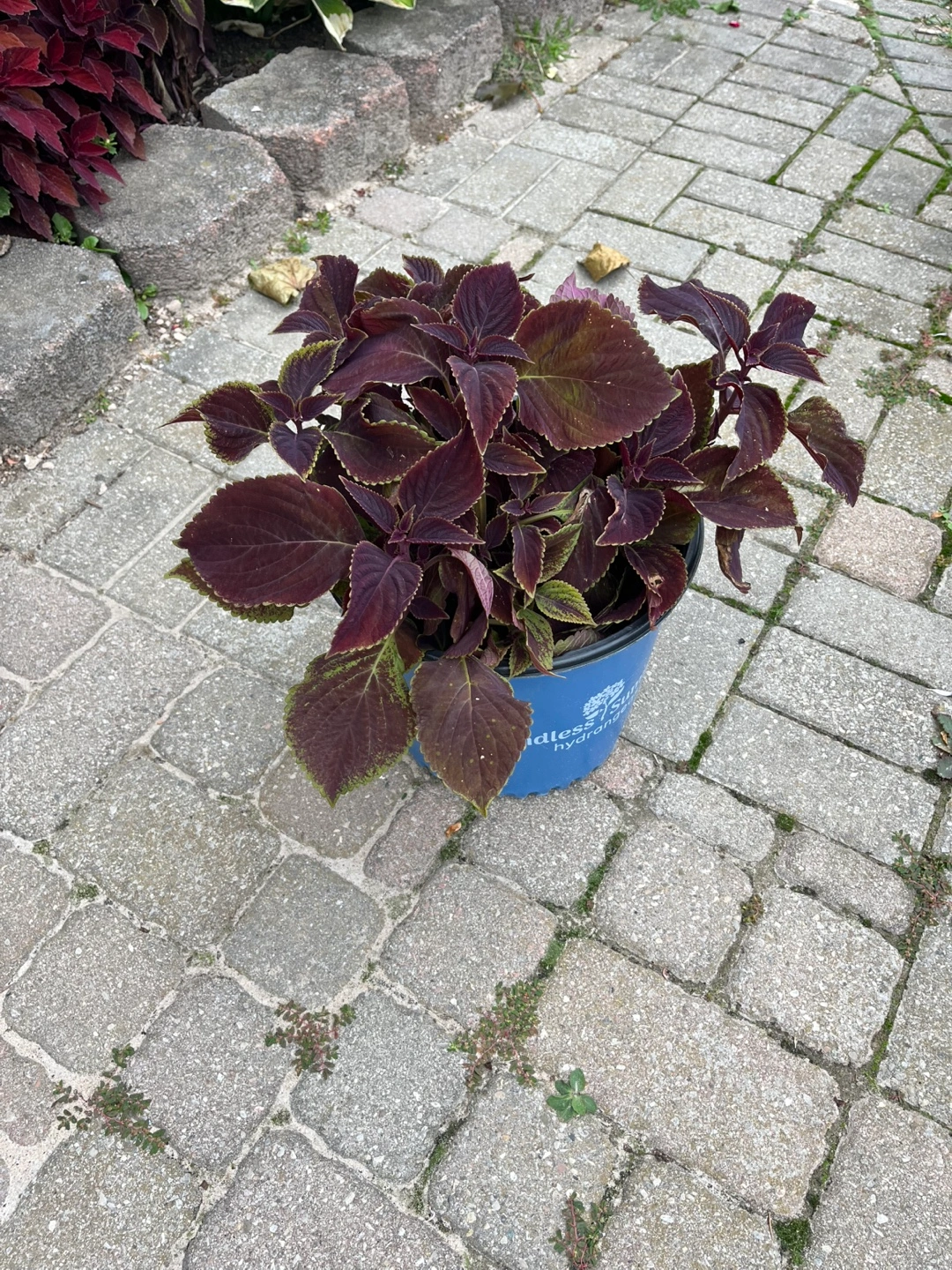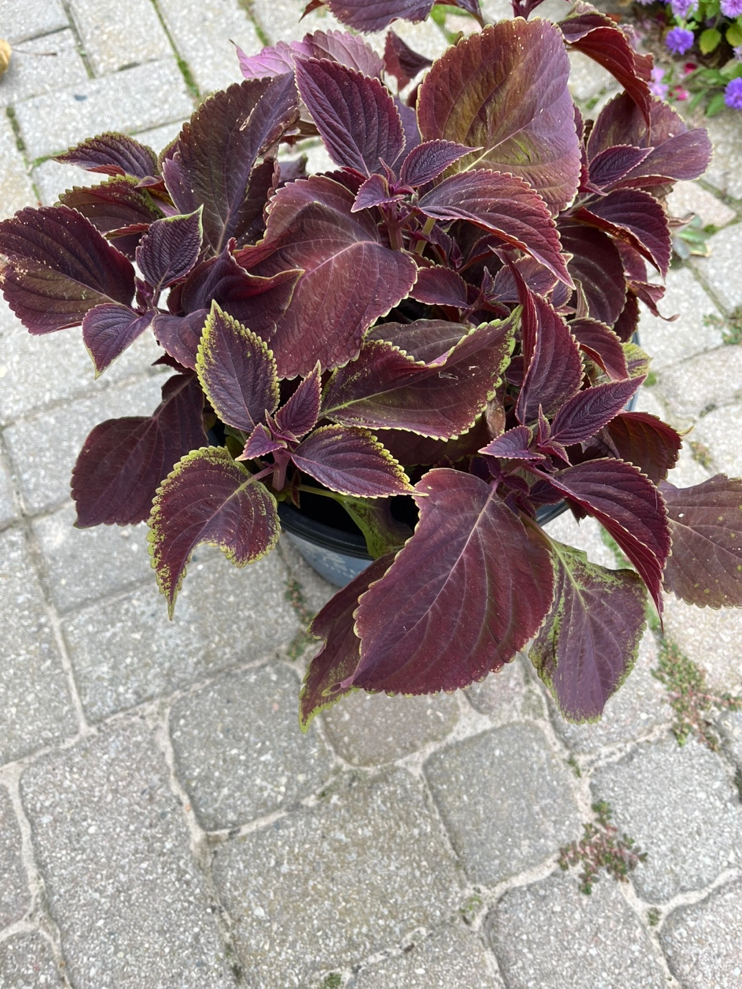 Beautiful coleus plant! It has lovely dark red leaves with green edges. It's in a pot and ready to brighten up your space